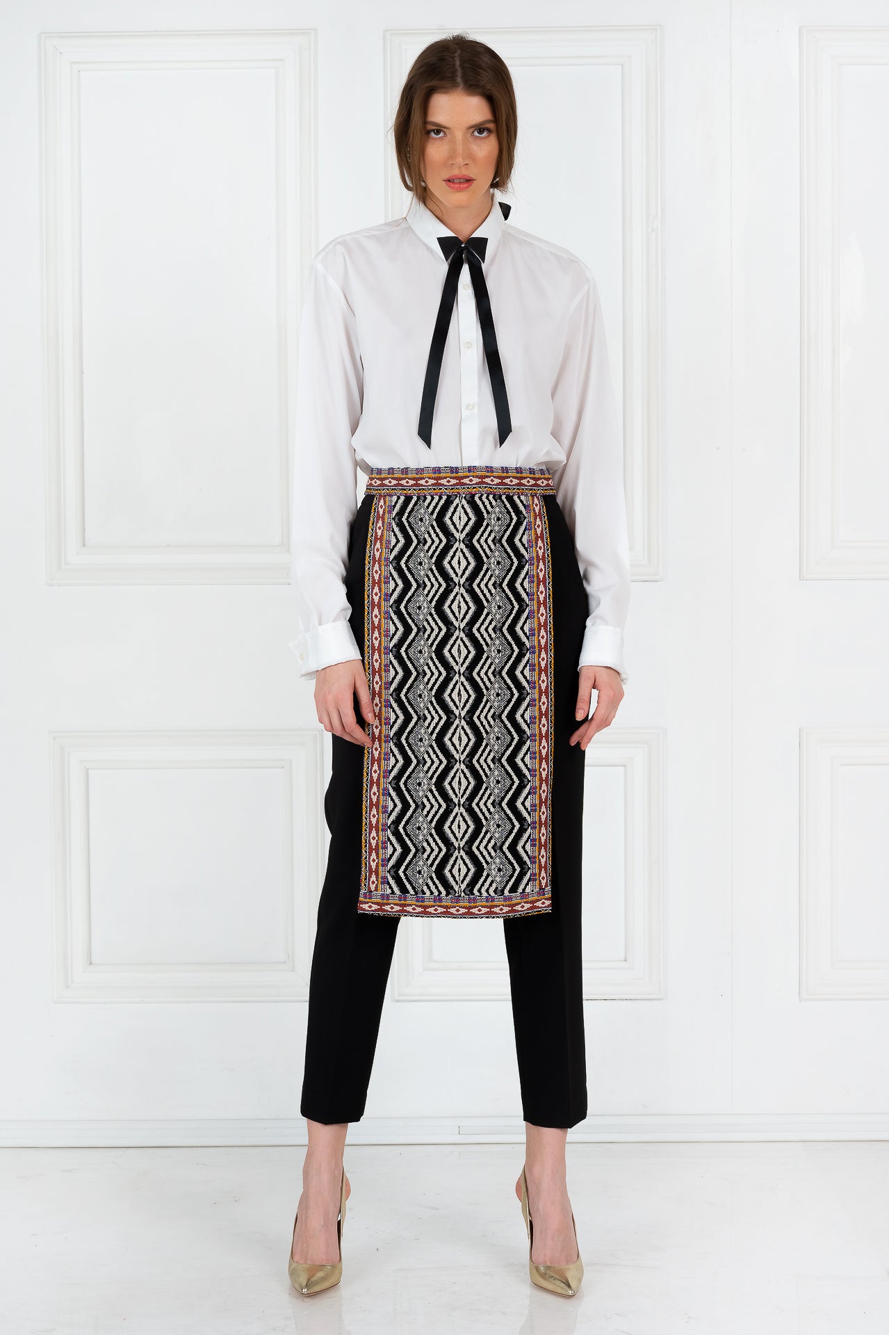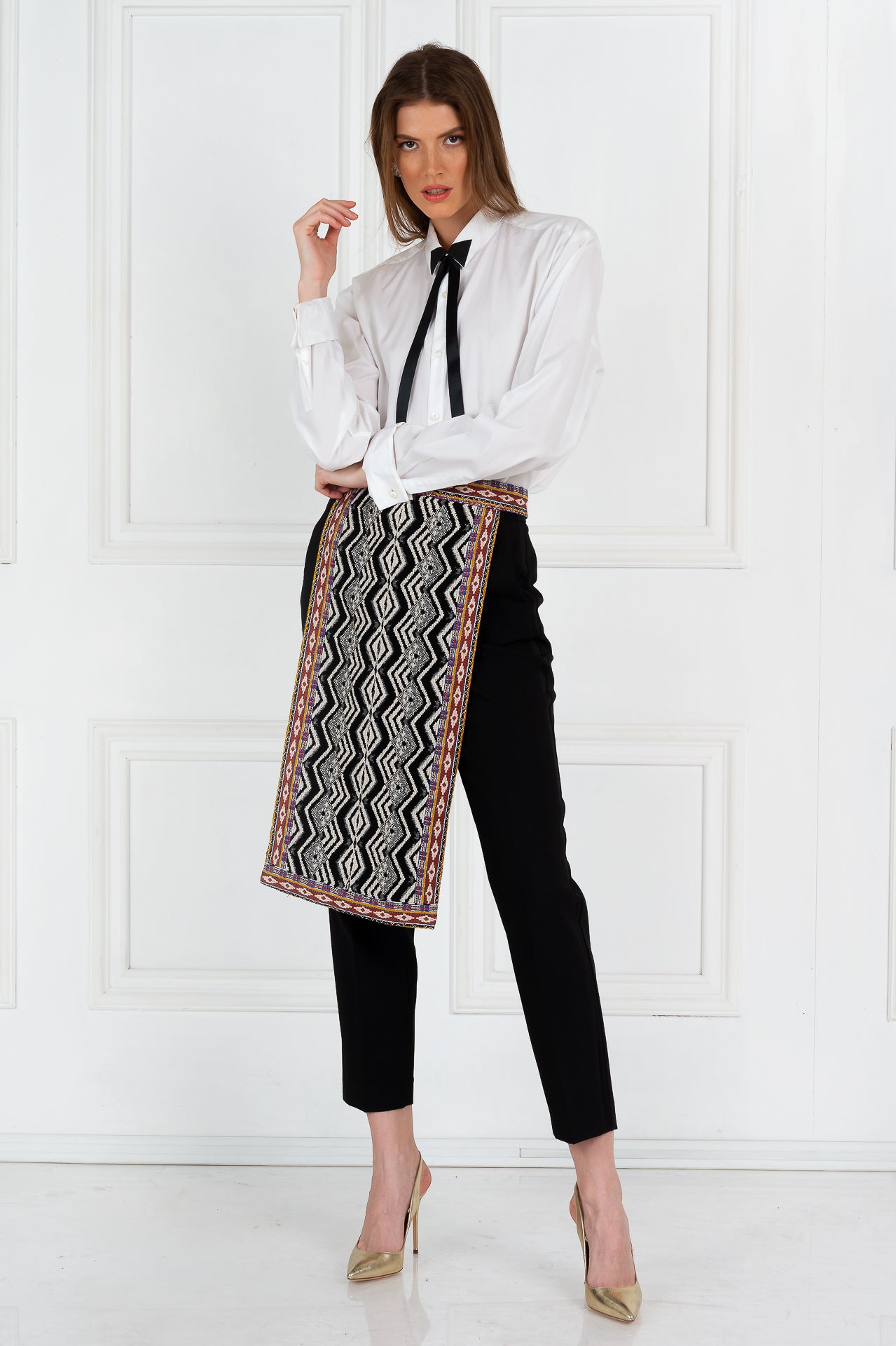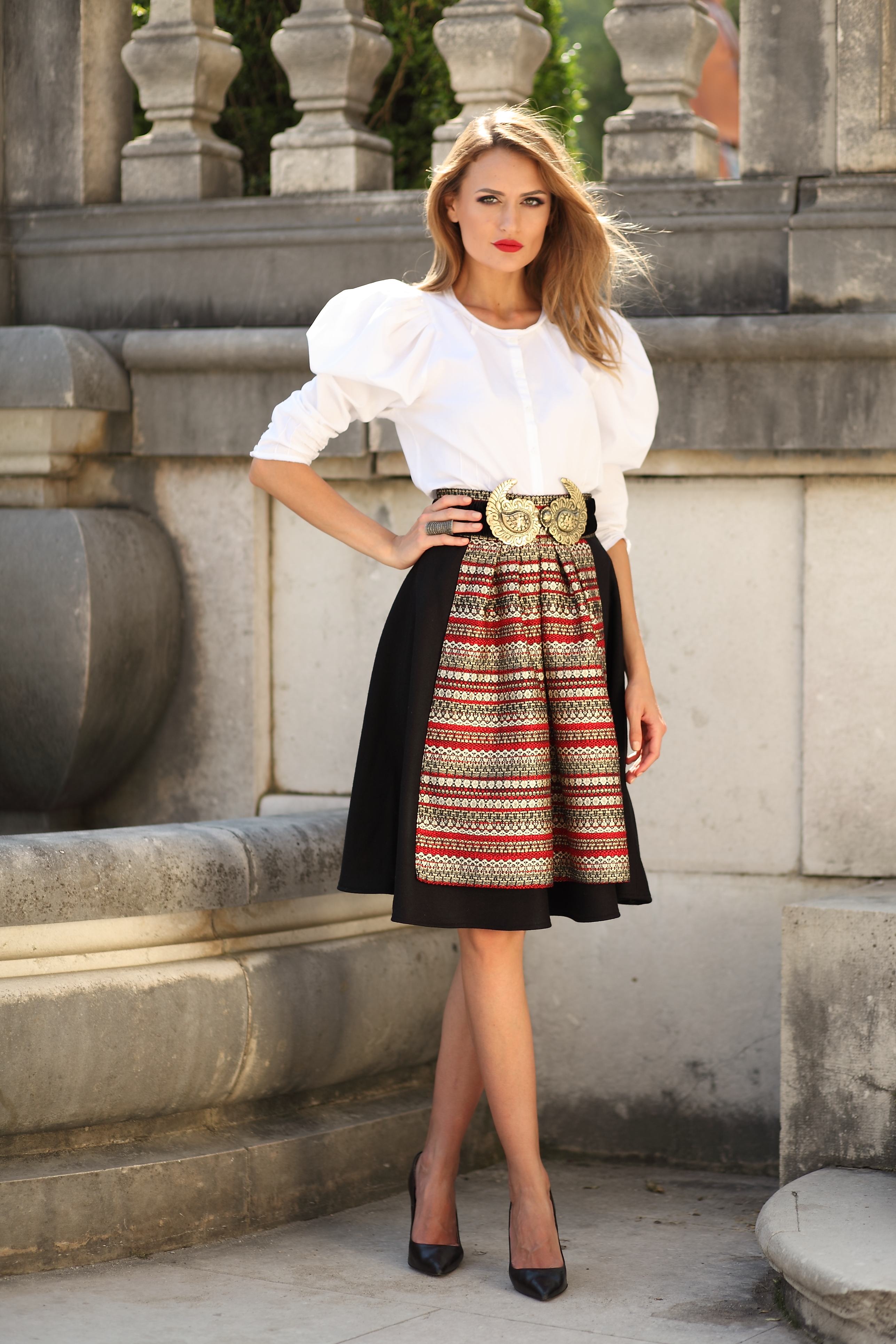 - O cămașă albă cu mâneci bufante, o pereche de pantaloni conici și o fotă tradițională - Alternativa ideală în cazul în care vrei să oferi un suflu fresh hainelor office. Poți opta pentru o fotă colorată, care integrează modele geometrice, pentru a contrasta celelalte elemente ale ținutei. Completează totul cu pantofi stiletto și accesorii fine.