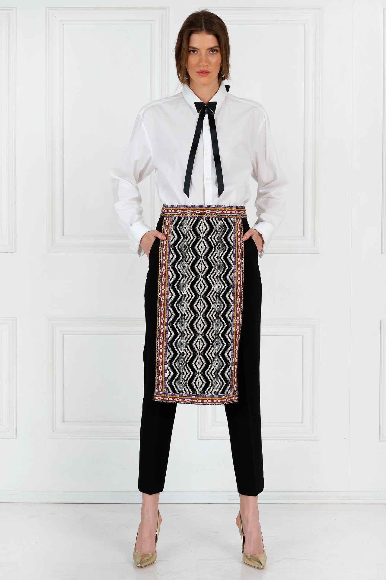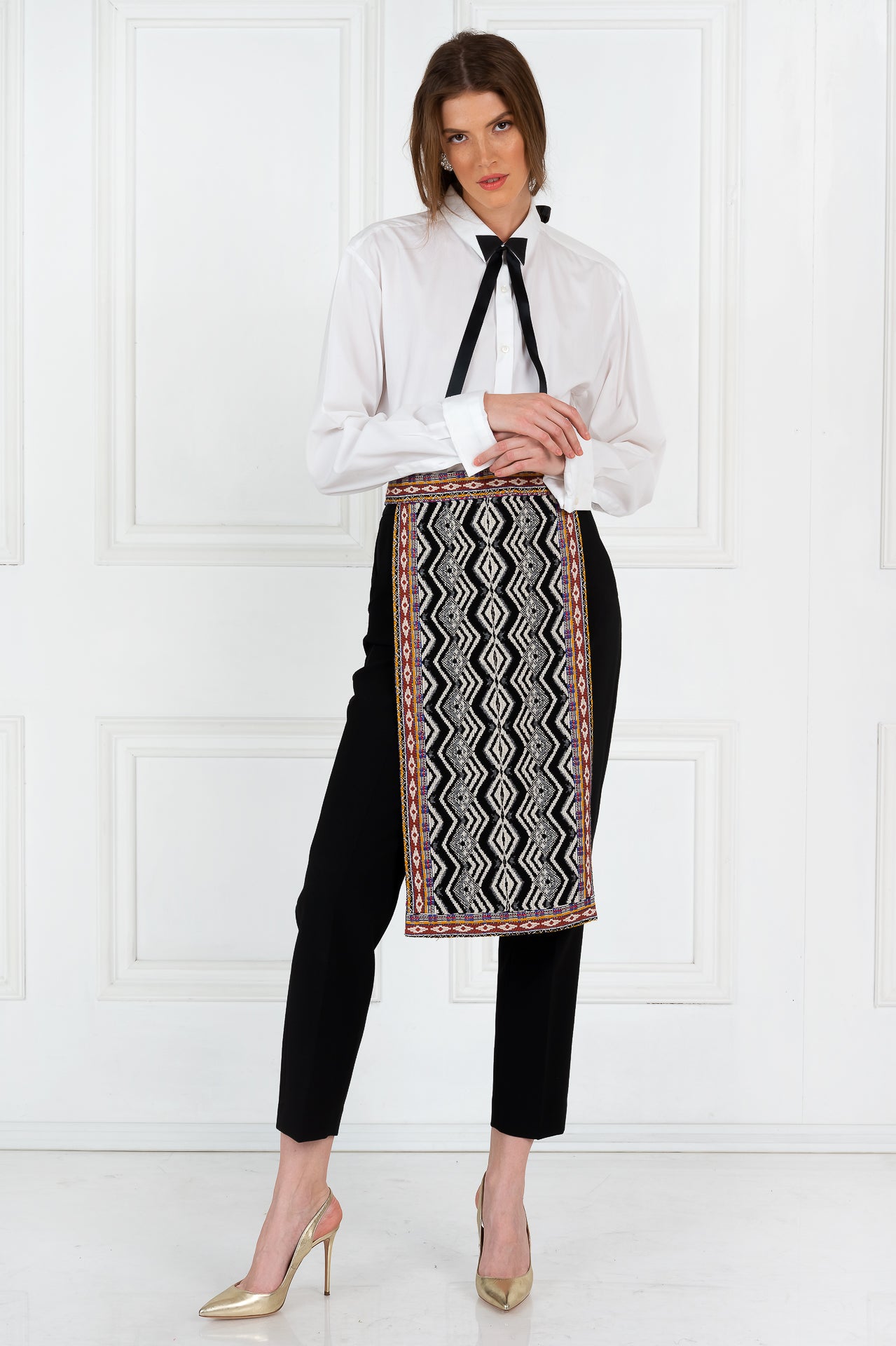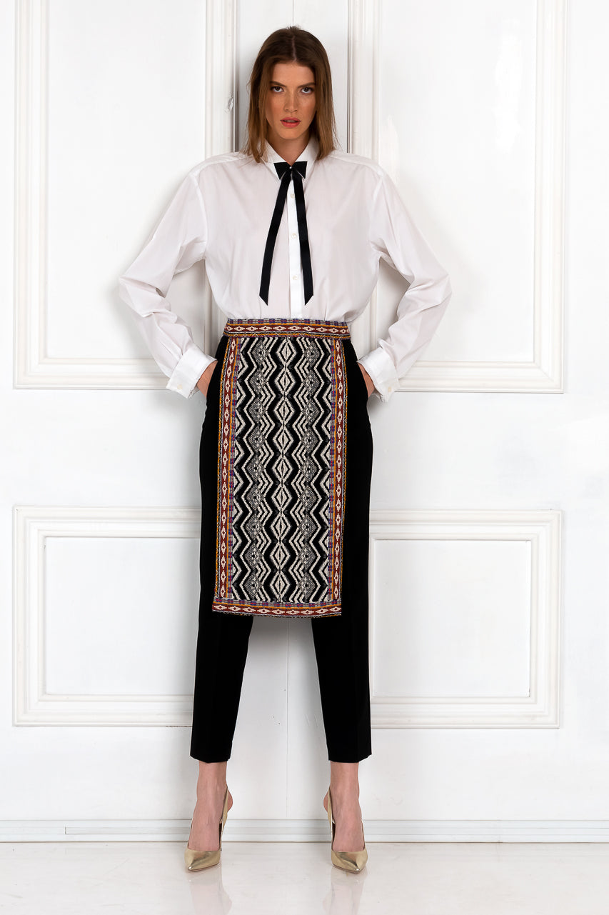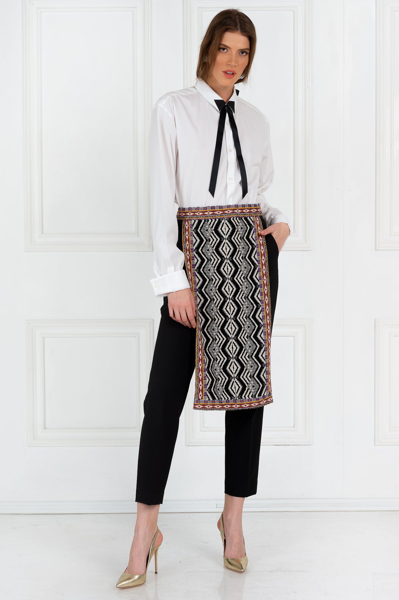 - O cămașă albă cu mâneci bufante, o pereche de pantaloni conici și o fotă tradițională - Alternativa ideală în cazul în care vrei să oferi un suflu fresh hainelor office. Poți opta pentru o fotă colorată, care integrează modele geometrice, pentru a contrasta celelalte elemente ale ținutei. Completează totul cu pantofi stiletto și accesorii fine.