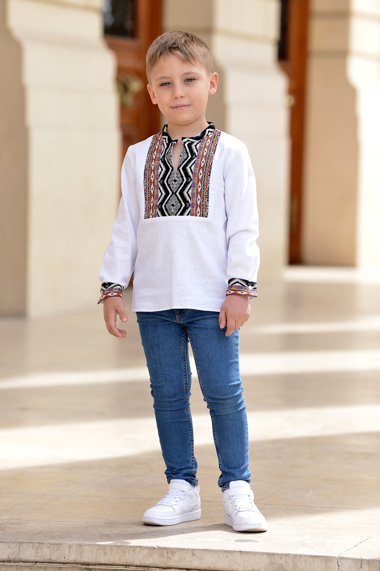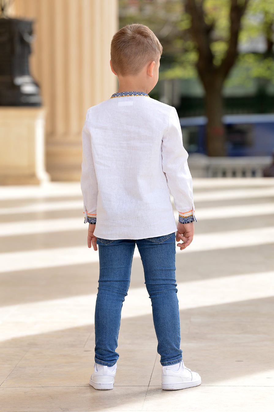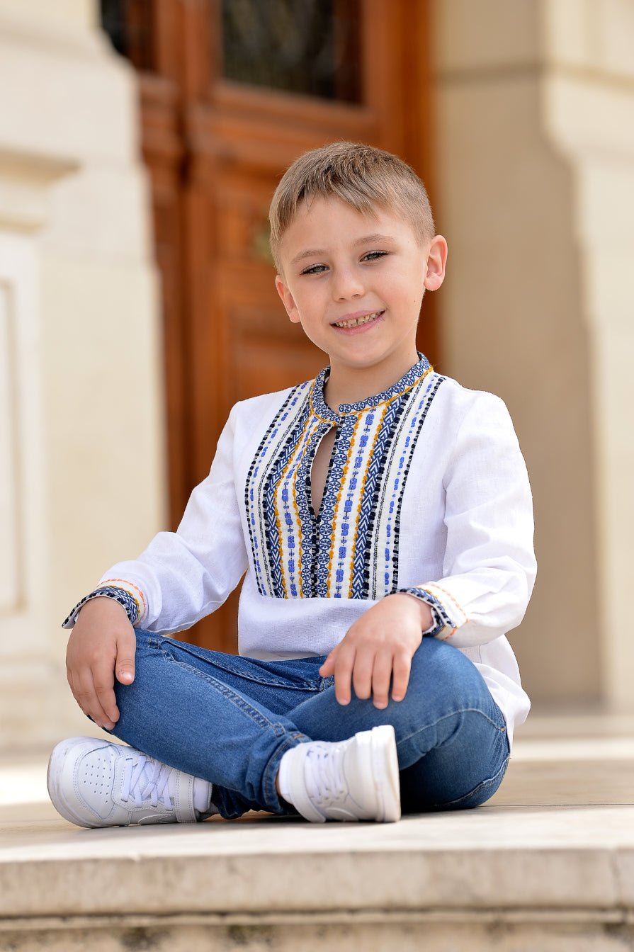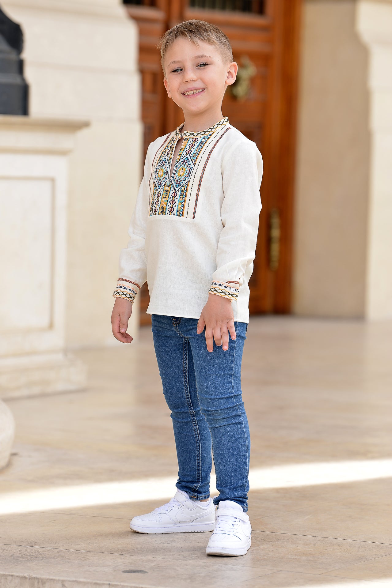 Cămașă Coloana Recunoștinței - Un model cu adevărat unicat, tocmai datorită țesăturilor delicate pe care le integrează. Este o variantă pe care cel mic o poate purta la orice eveniment la care participă. Culorile folosite se îmbină armonios, chiar dacă sunt folosite și nuanțe mai intense.