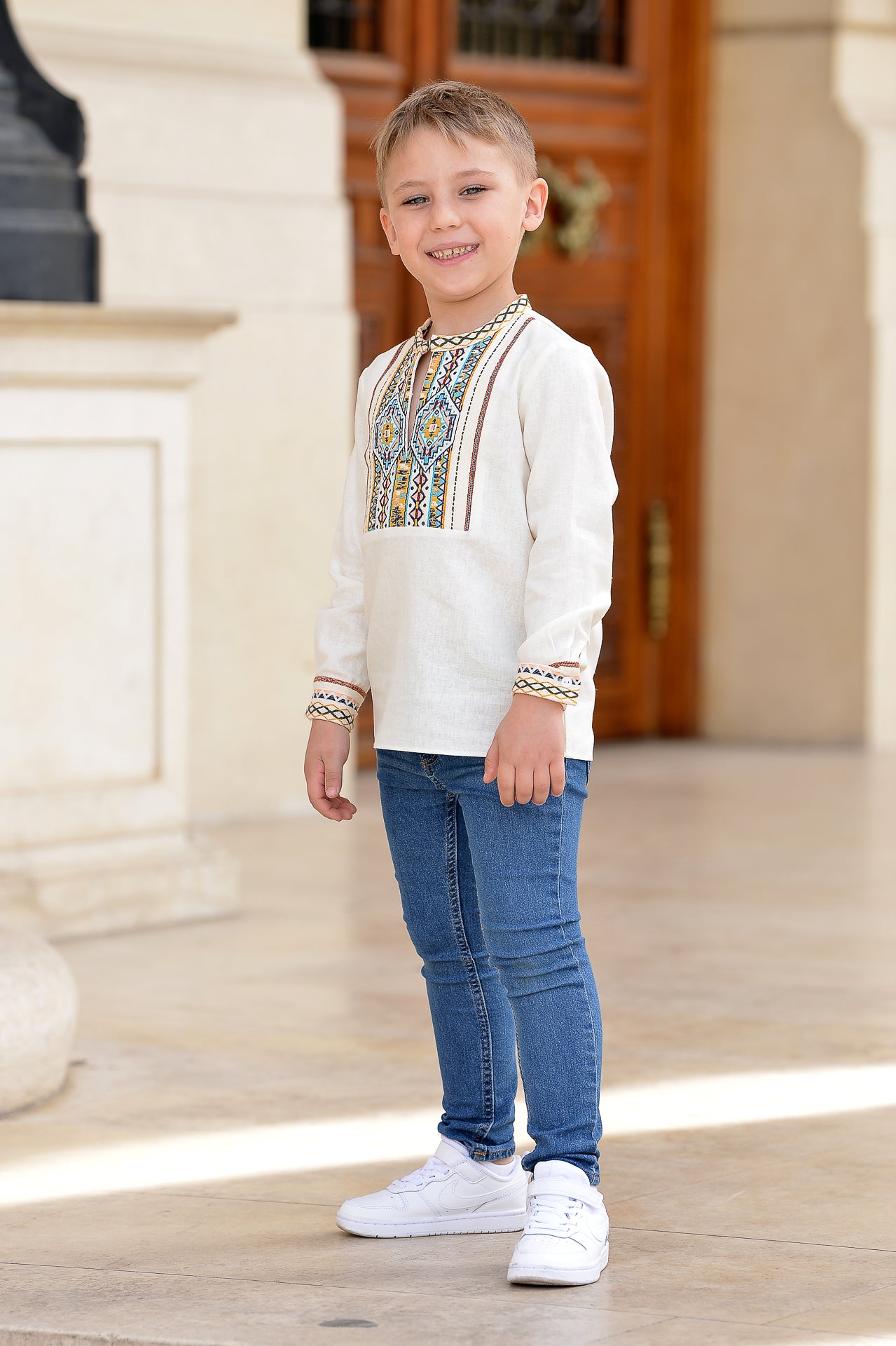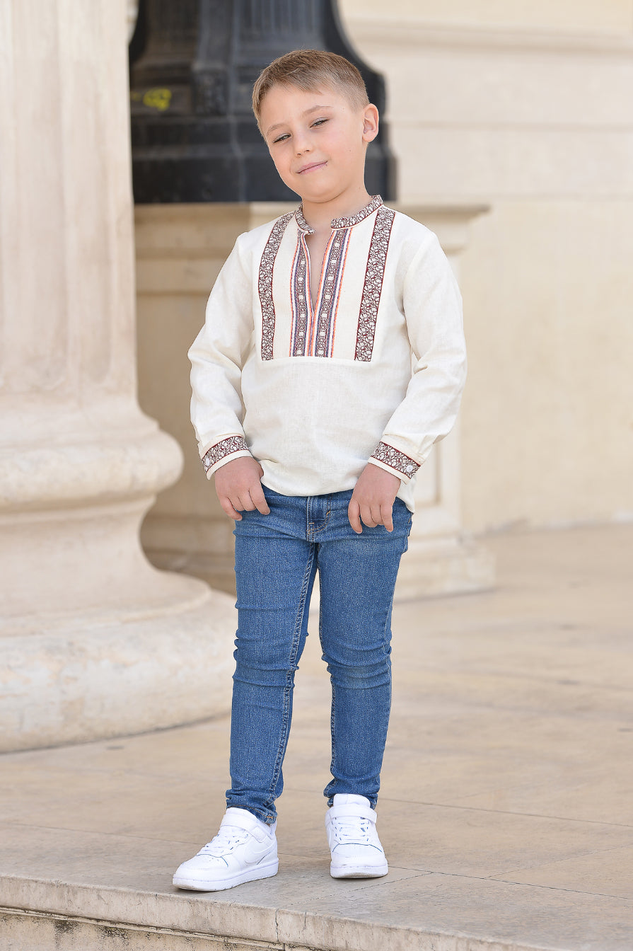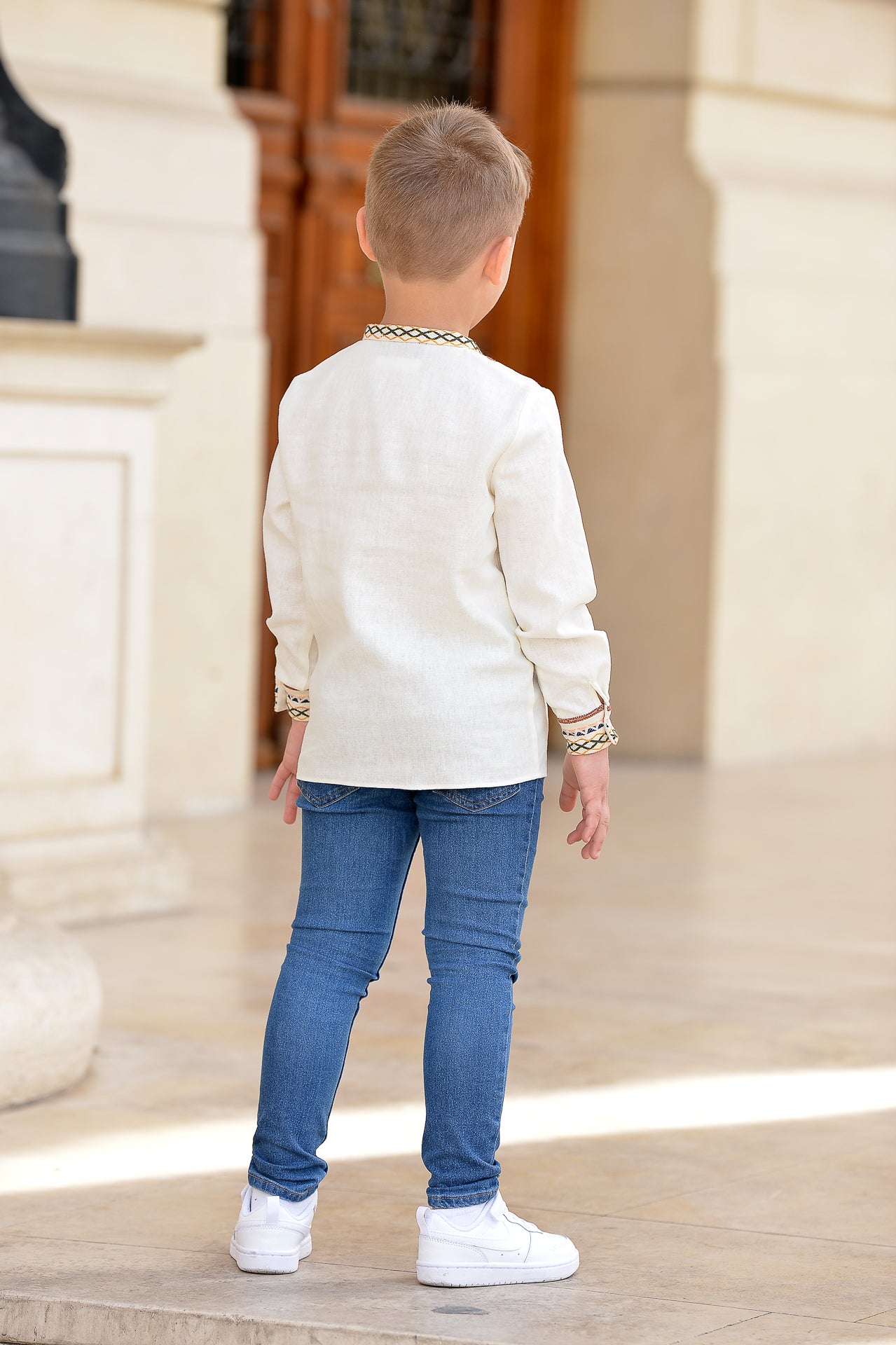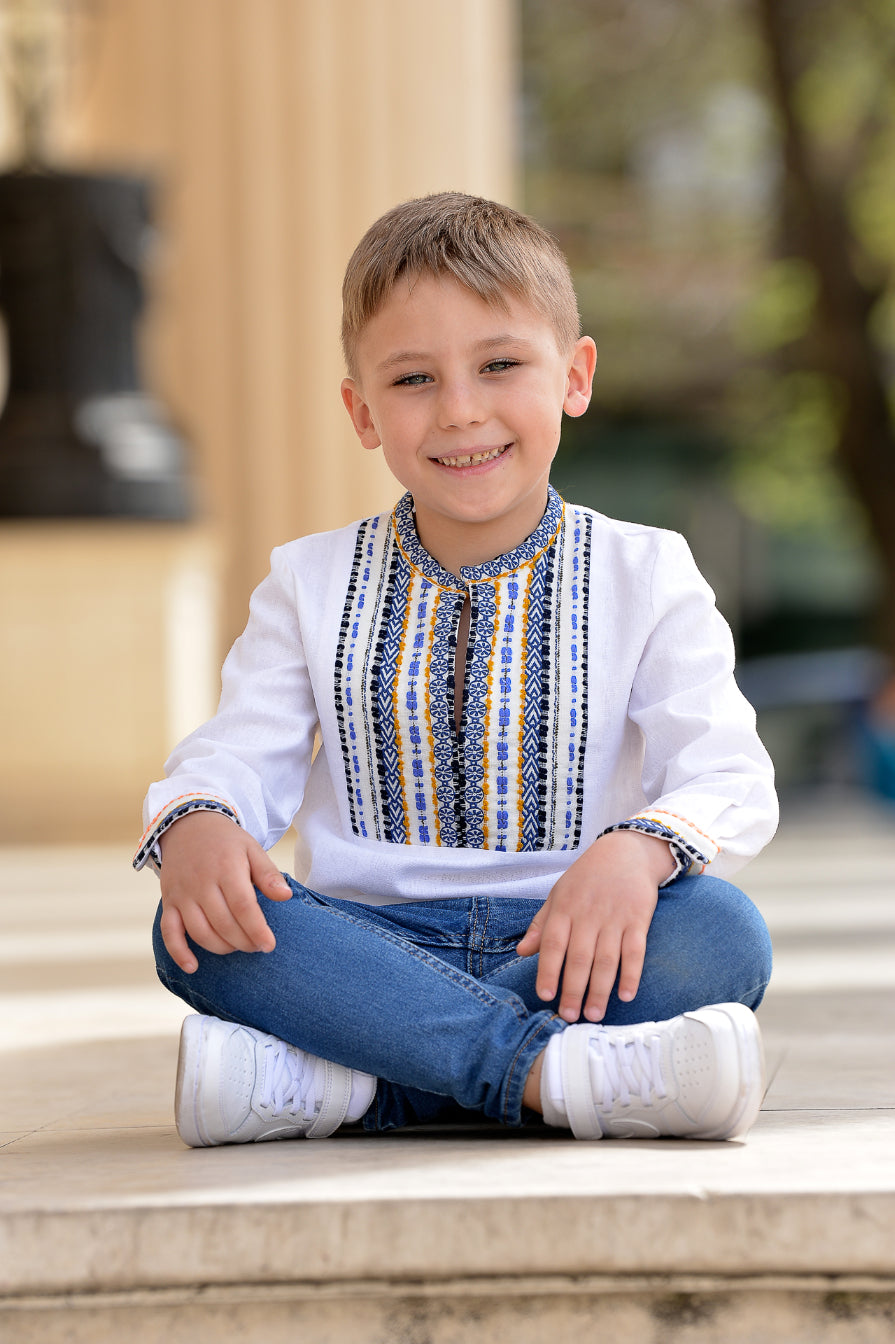 Cămașă Coloana Recunoștinței - Un model cu adevărat unicat, tocmai datorită țesăturilor delicate pe care le integrează. Este o variantă pe care cel mic o poate purta la orice eveniment la care participă. Culorile folosite se îmbină armonios, chiar dacă sunt folosite și nuanțe mai intense.