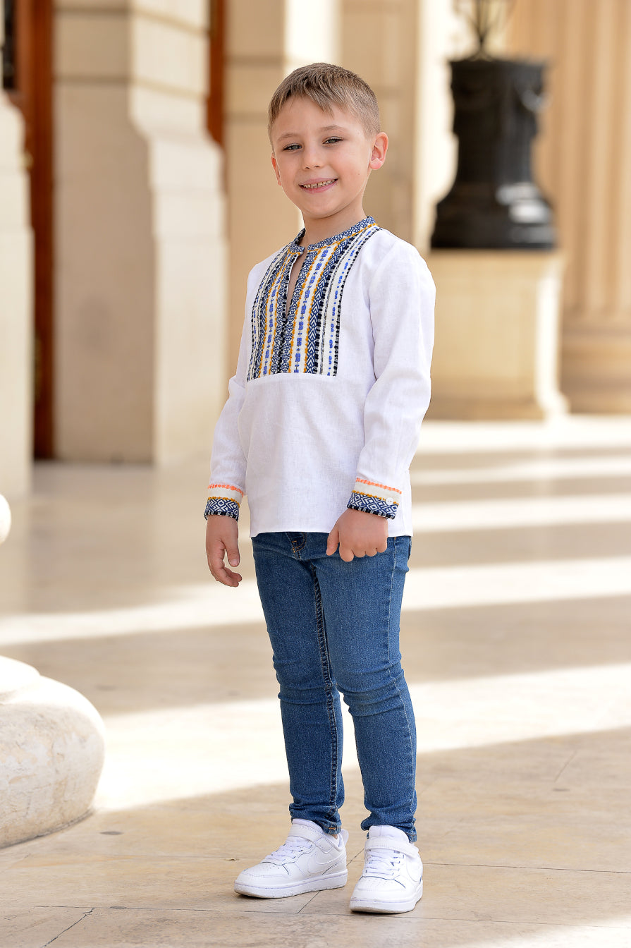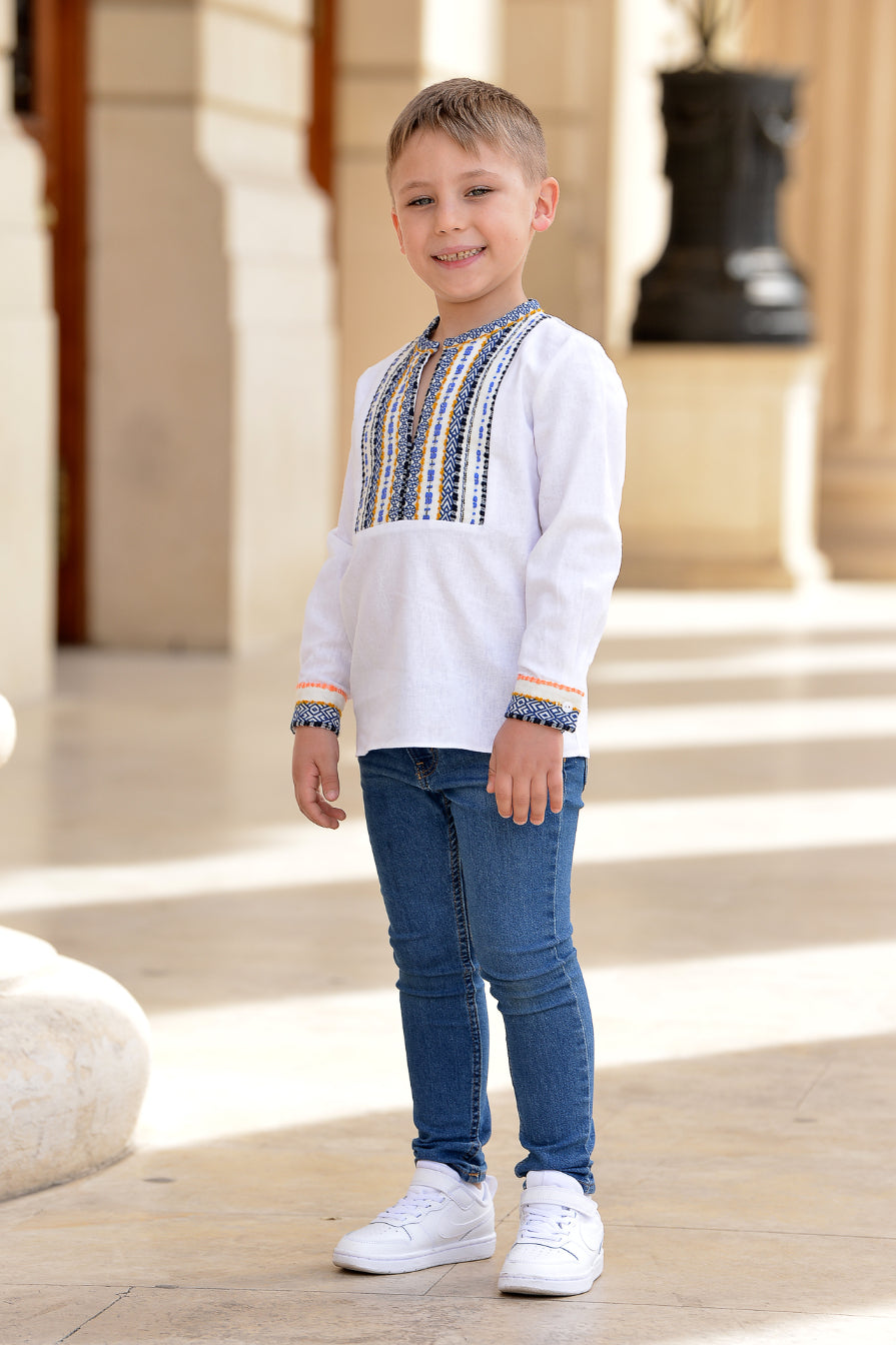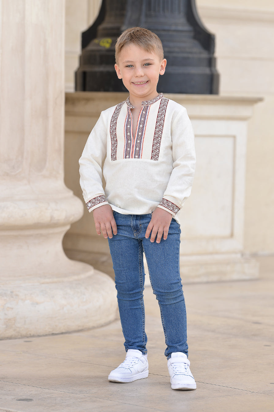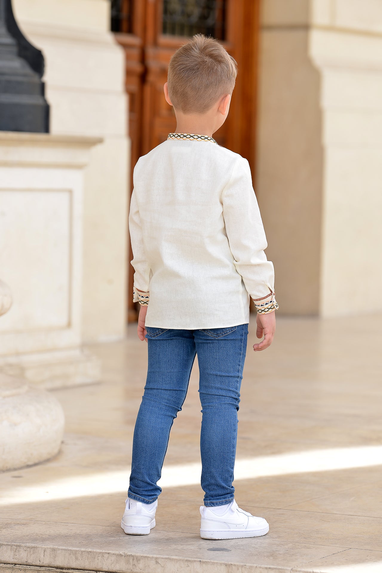 Cămașă Coloana Recunoștinței - Un model cu adevărat unicat, tocmai datorită țesăturilor delicate pe care le integrează. Este o variantă pe care cel mic o poate purta la orice eveniment la care participă. Culorile folosite se îmbină armonios, chiar dacă sunt folosite și nuanțe mai intense.
