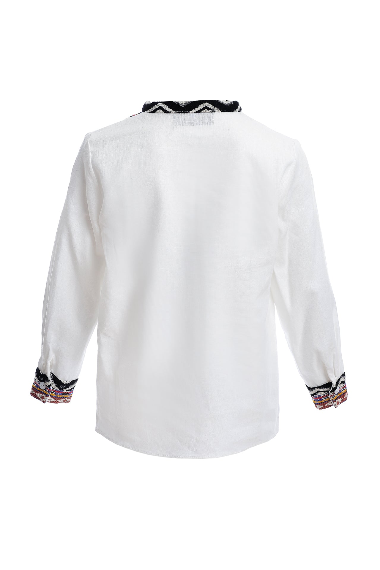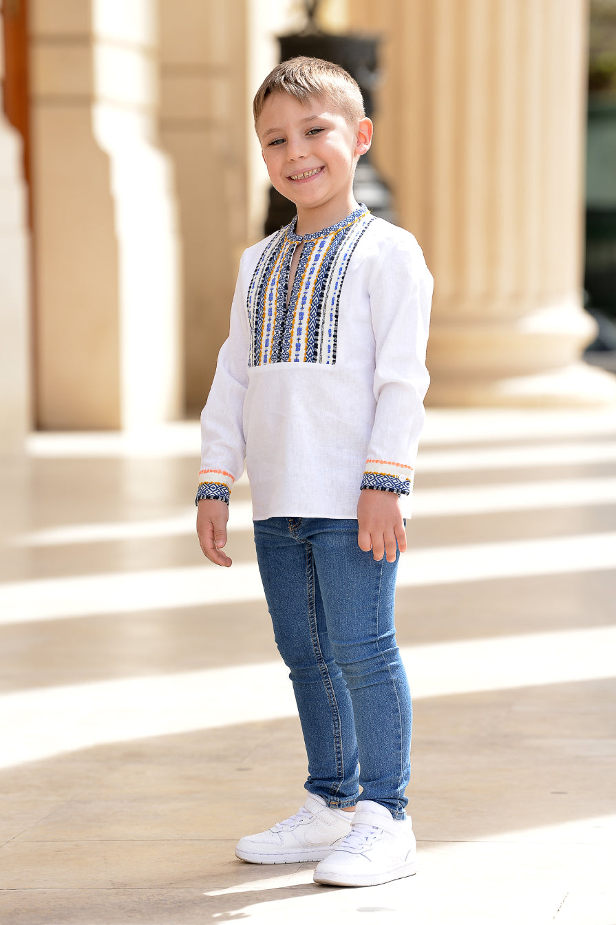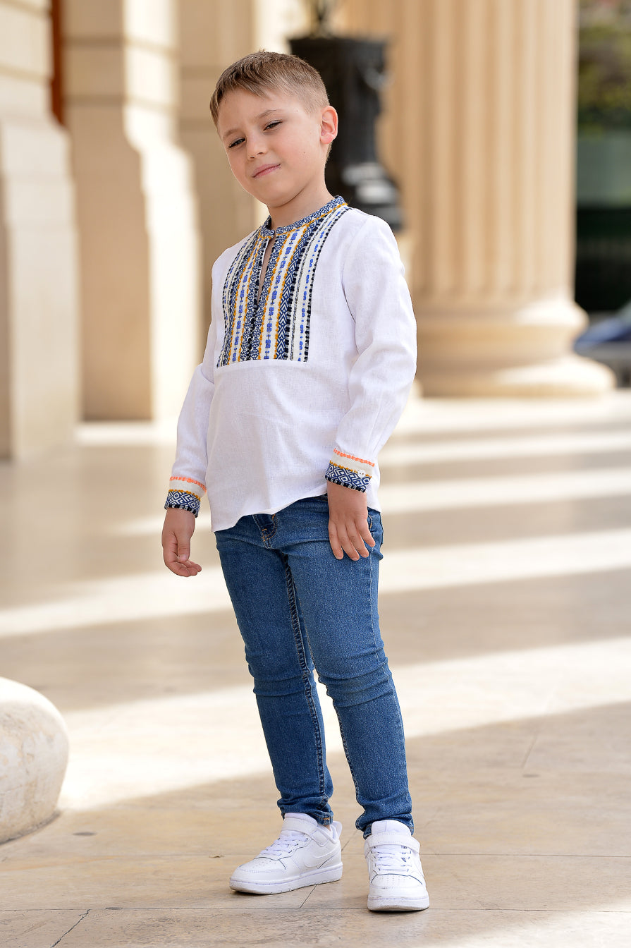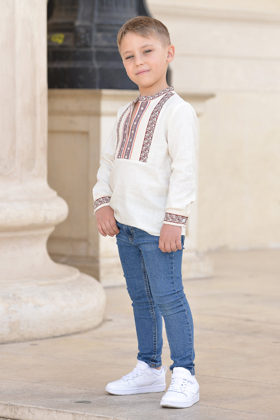 Cămașă Coloana Recunoștinței - Un model cu adevărat unicat, tocmai datorită țesăturilor delicate pe care le integrează. Este o variantă pe care cel mic o poate purta la orice eveniment la care participă. Culorile folosite se îmbină armonios, chiar dacă sunt folosite și nuanțe mai intense.