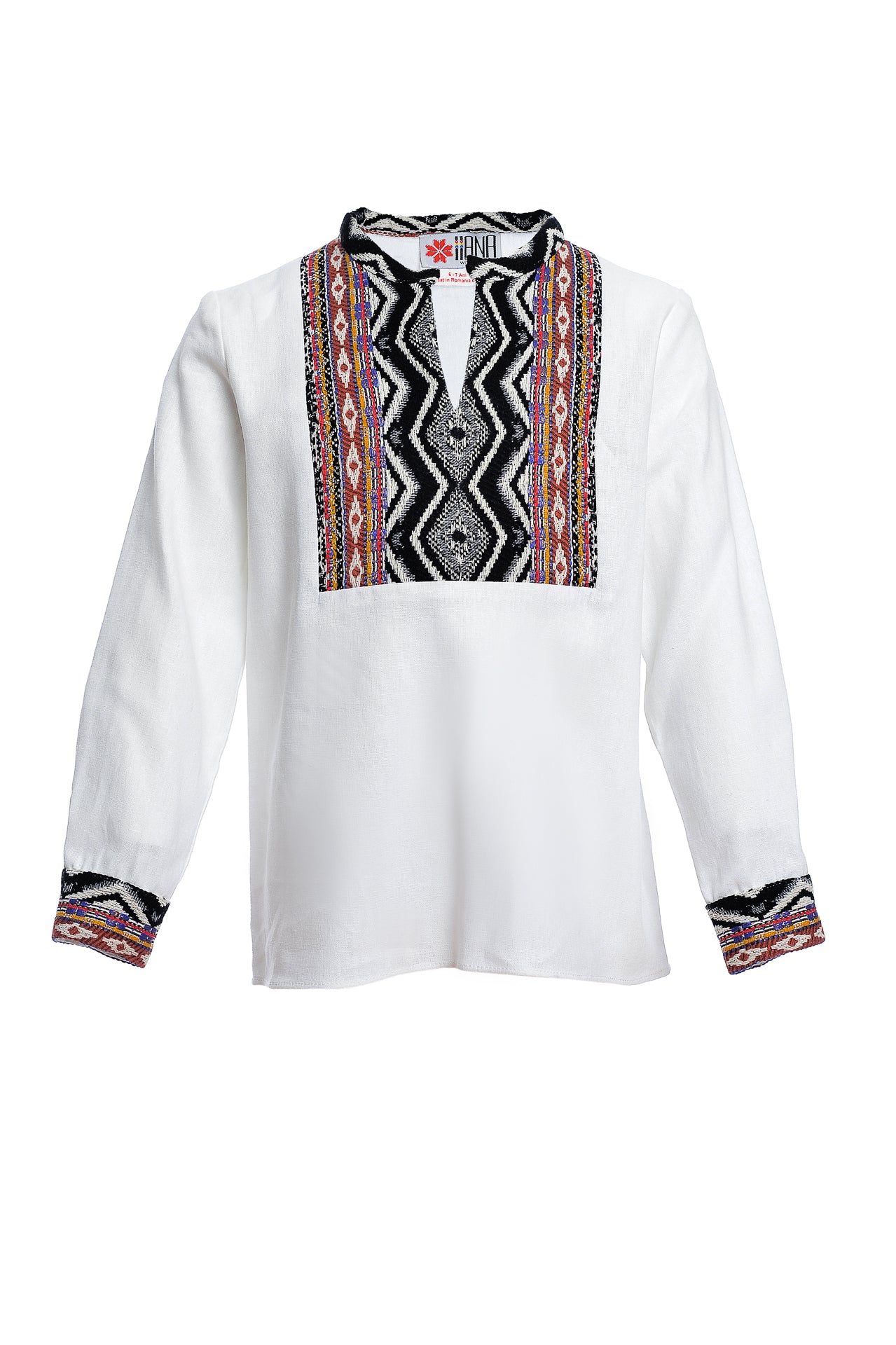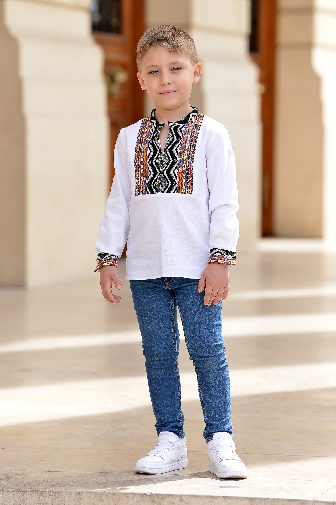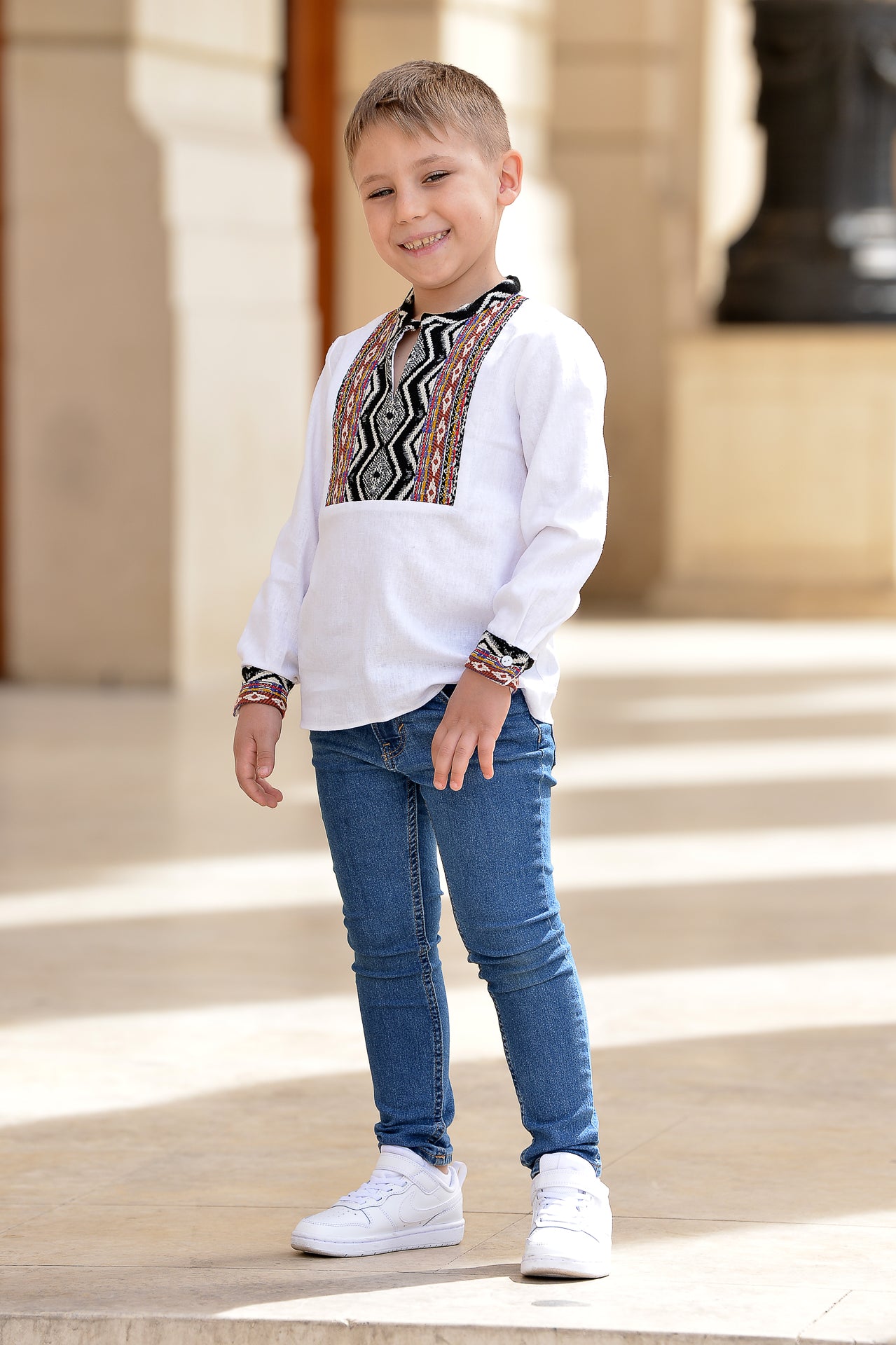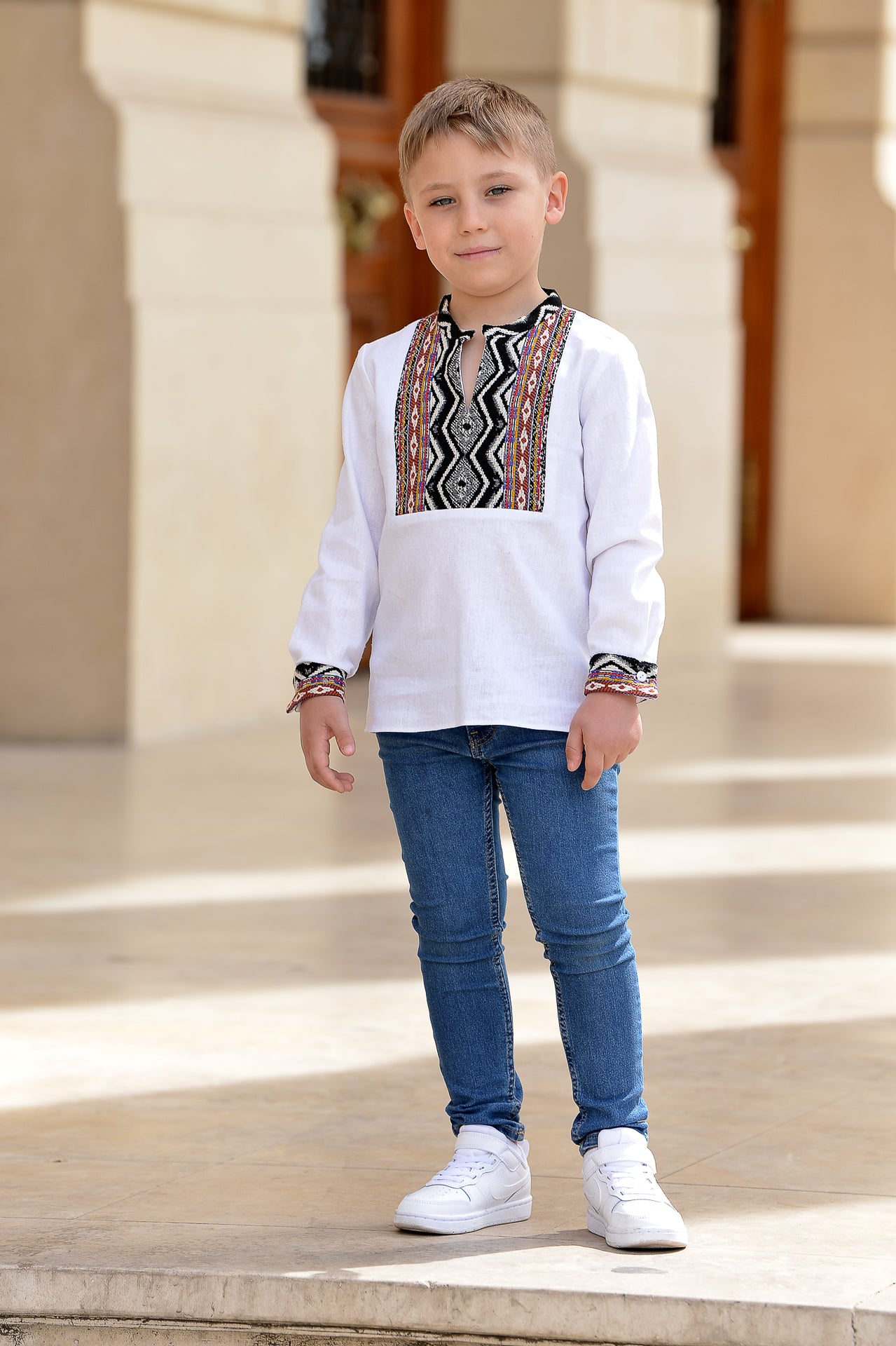 Ie copii băieți tip horă - Inspirată din folclor, ia subliniază, prin intermediul esteticii abordate, momentele de sărbătoare, când oamenii se prindeau în horă și dansau până în zori. Este o alternativă multicoloră, care se va potrivi de minune firilor dinamice, cărora le place să iasă în evidență.
