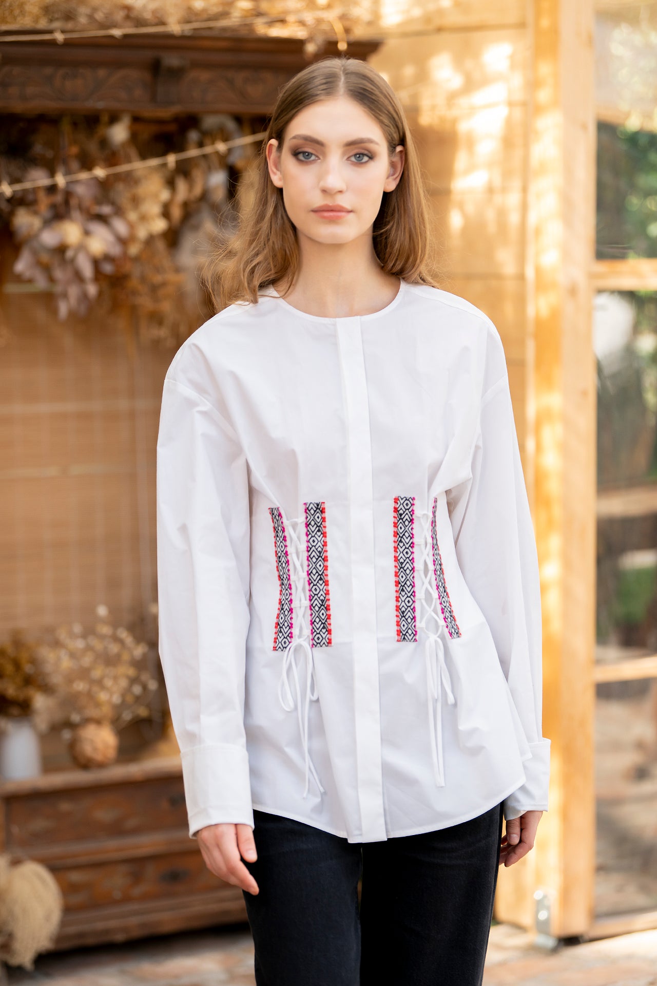 Cămașa este confecționată din bumbac premium și jacquard etnic țesut cu motive geometrice.