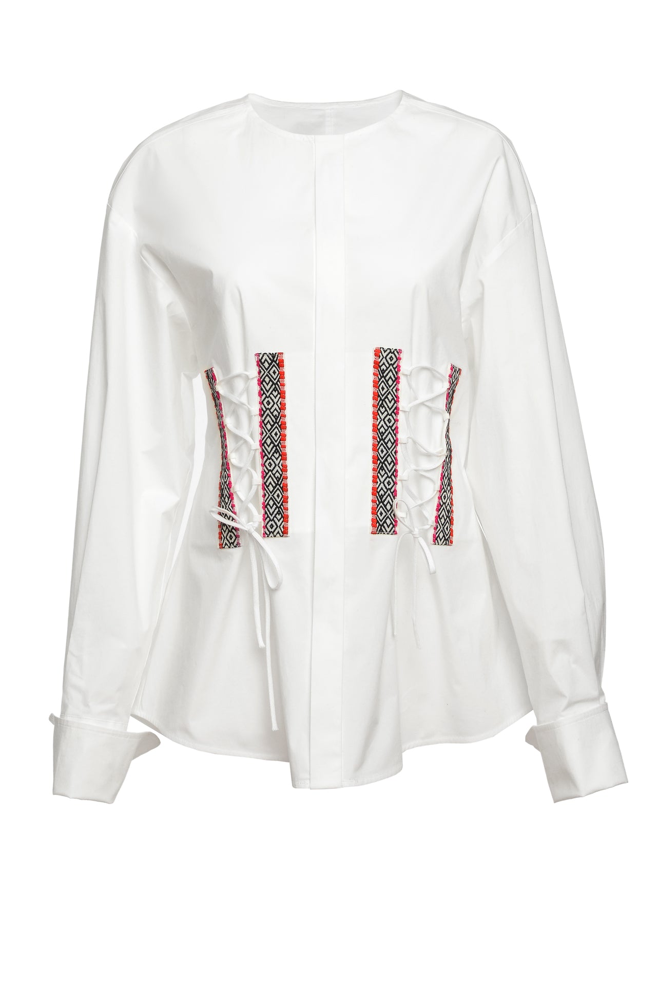 Camașa Nora are un tipar lejer, cu umărul căzut, manșete late, fentă dublă și șnur reglabil în talie.