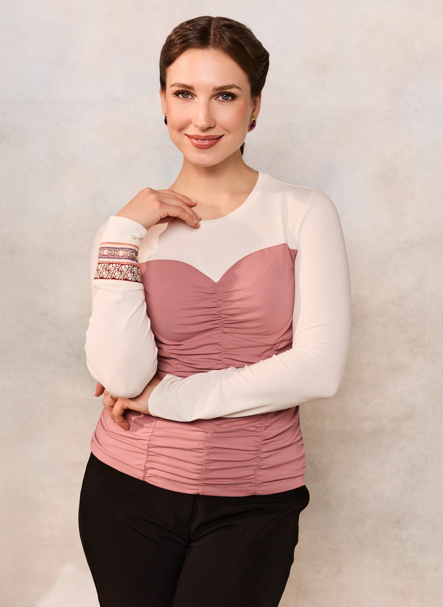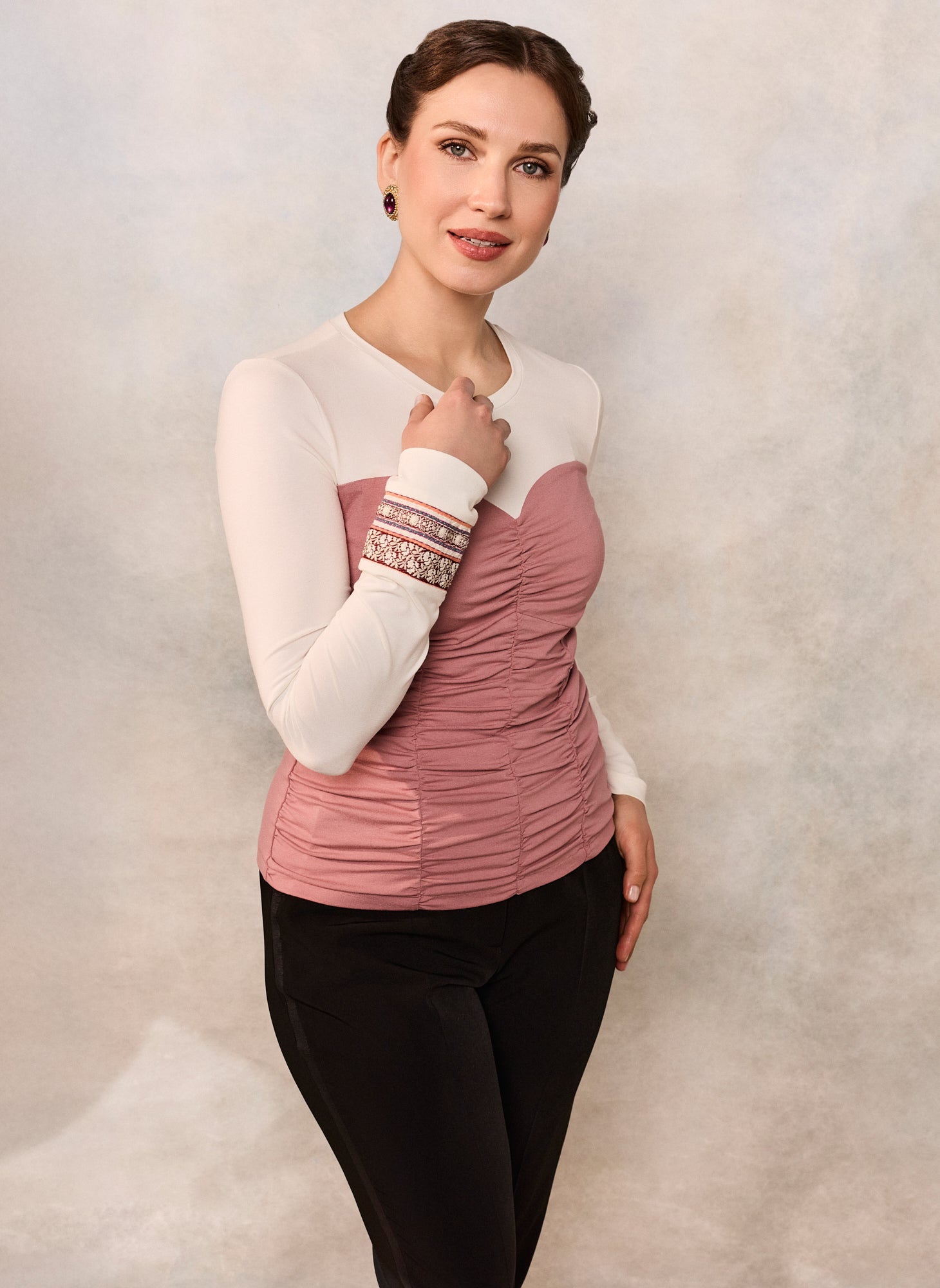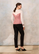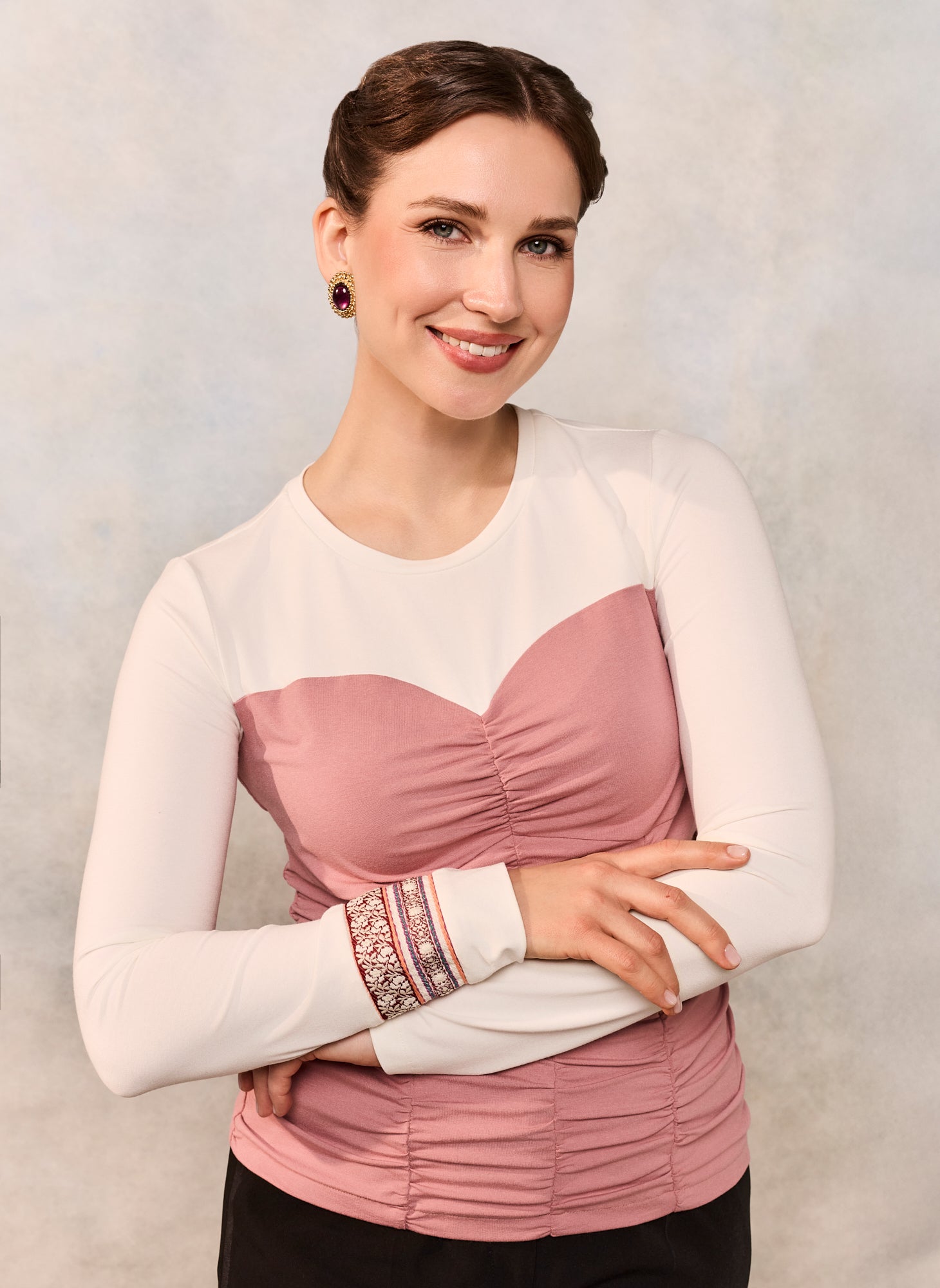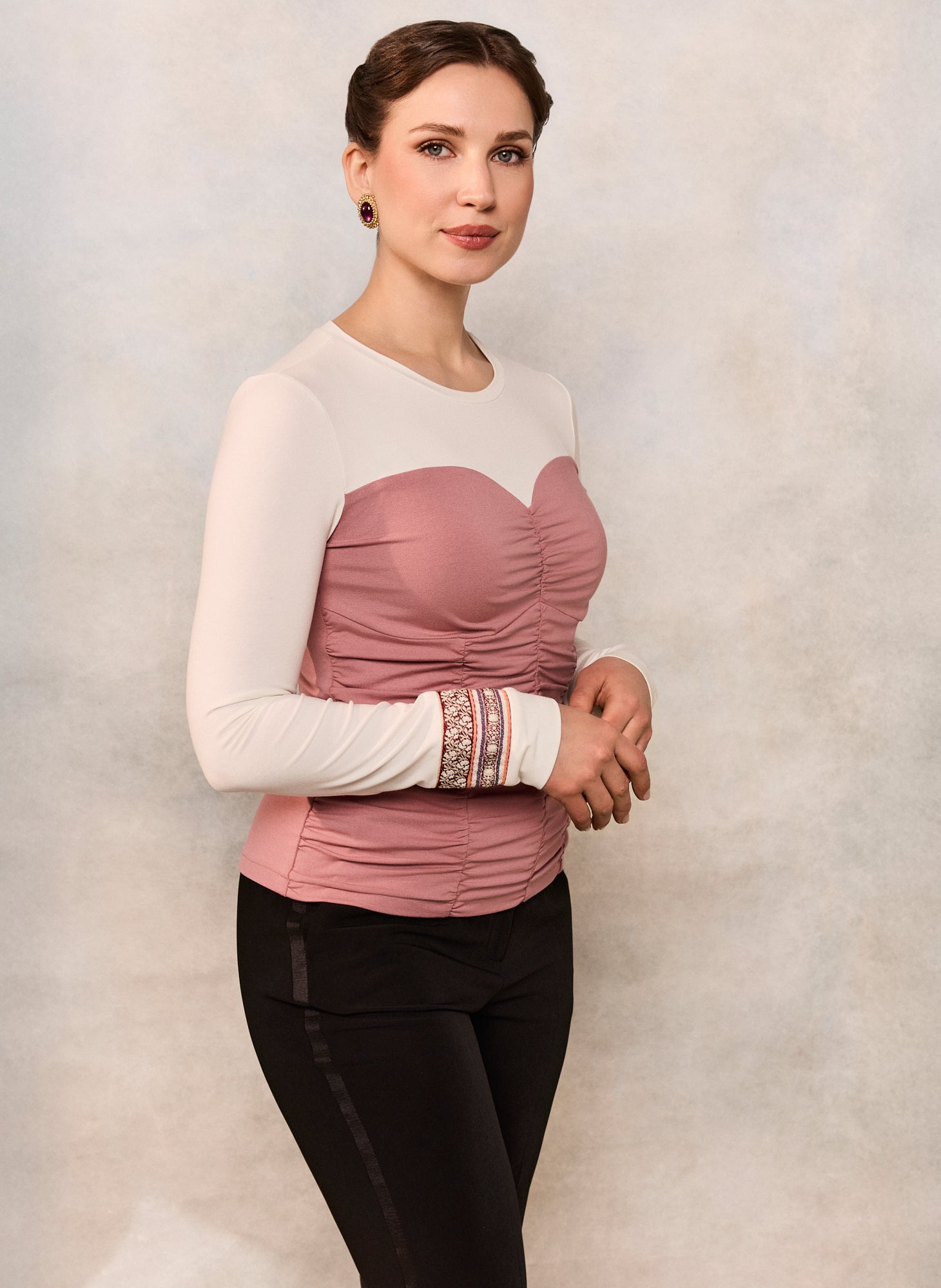 Bluză din jerseu cu corset și brățară țesută alb cu roz pudră