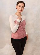 Bluza are un tipar cambrat, însă pe față și pe spate are detalii încrețite pentru a masca mesele delicioase.