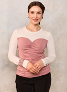Bluza cu corset și brățară țesută este confecționată din jerseu elastic din viscoză în 2 culori, alb și roz pudră.