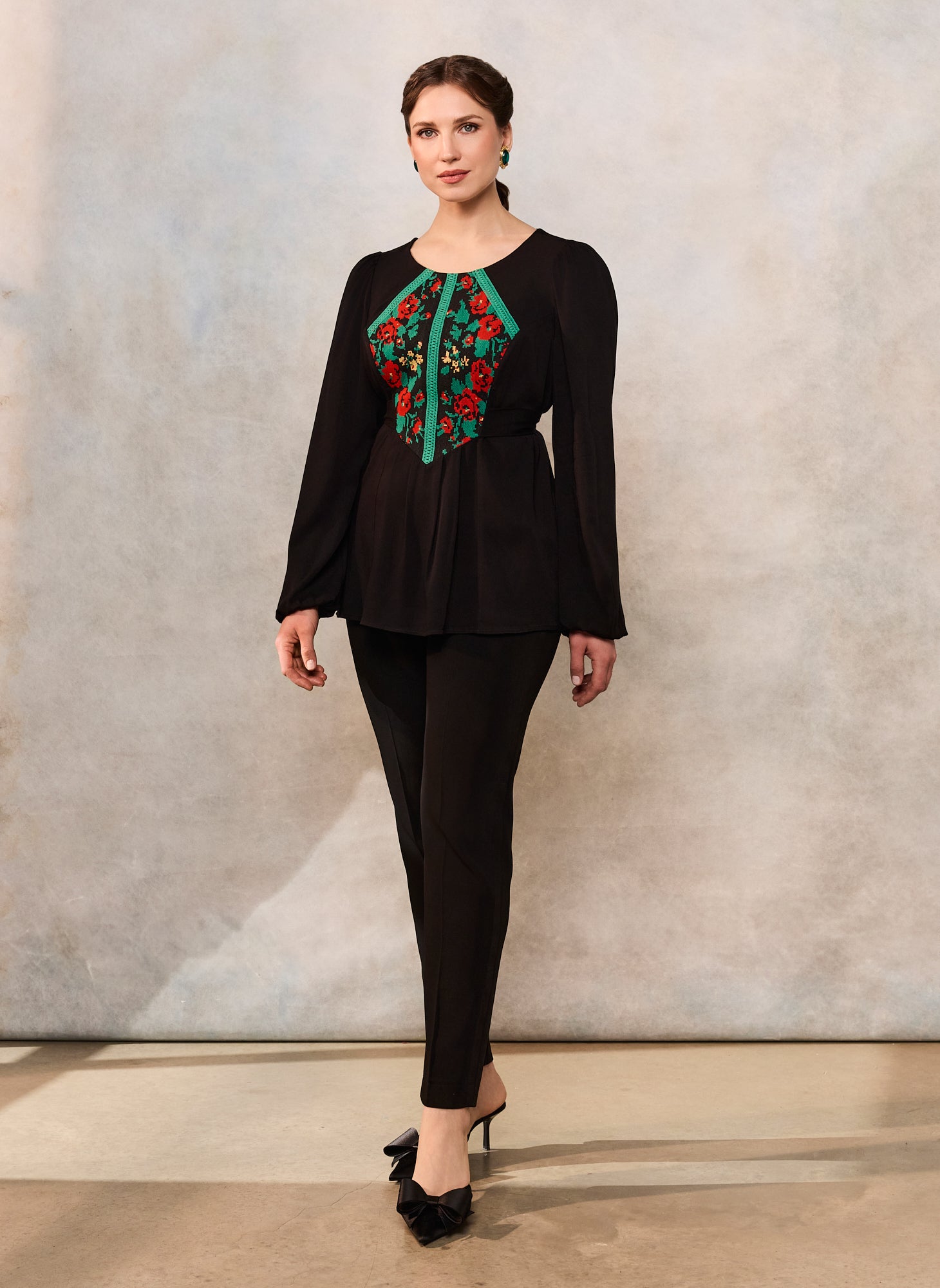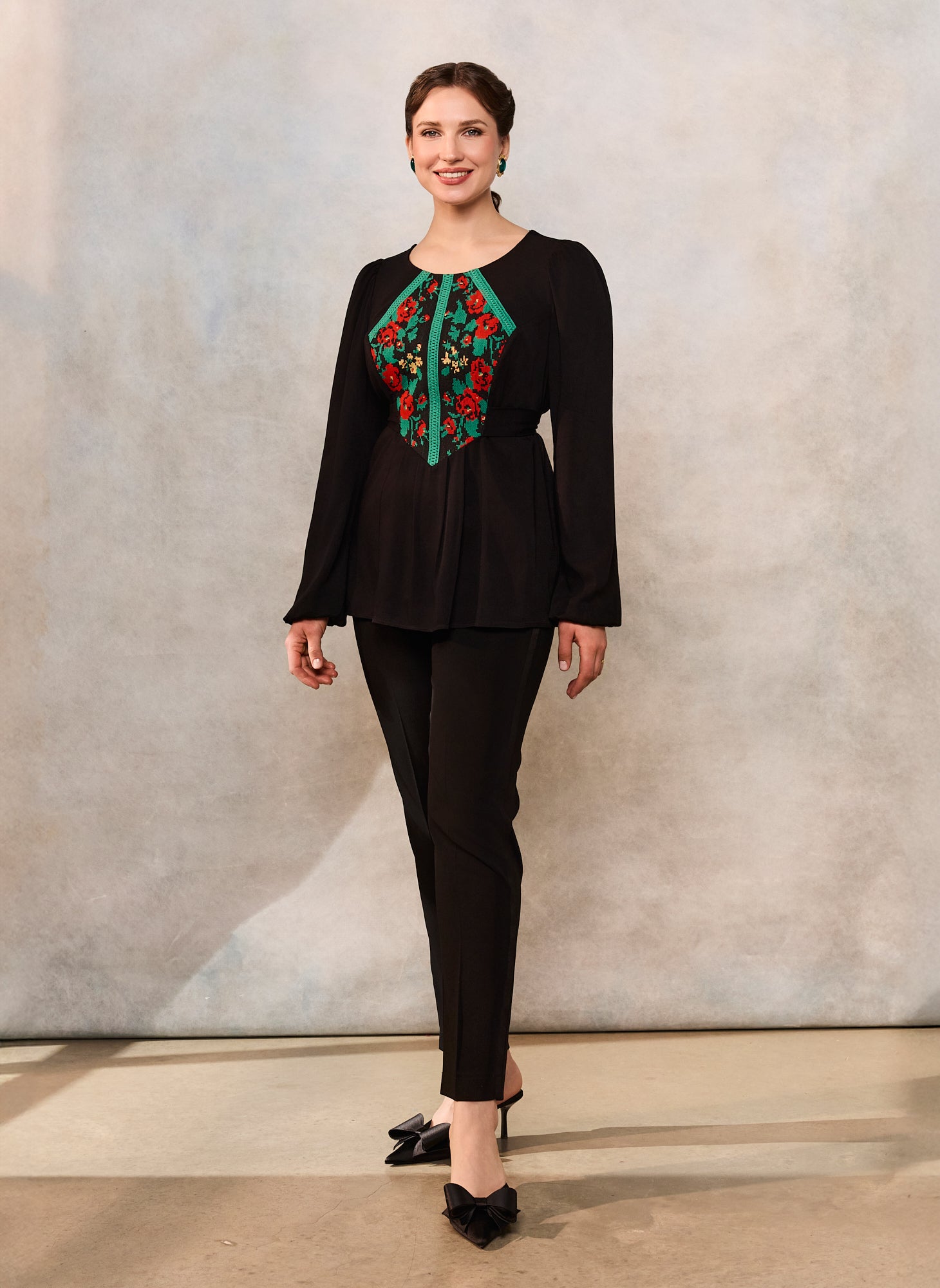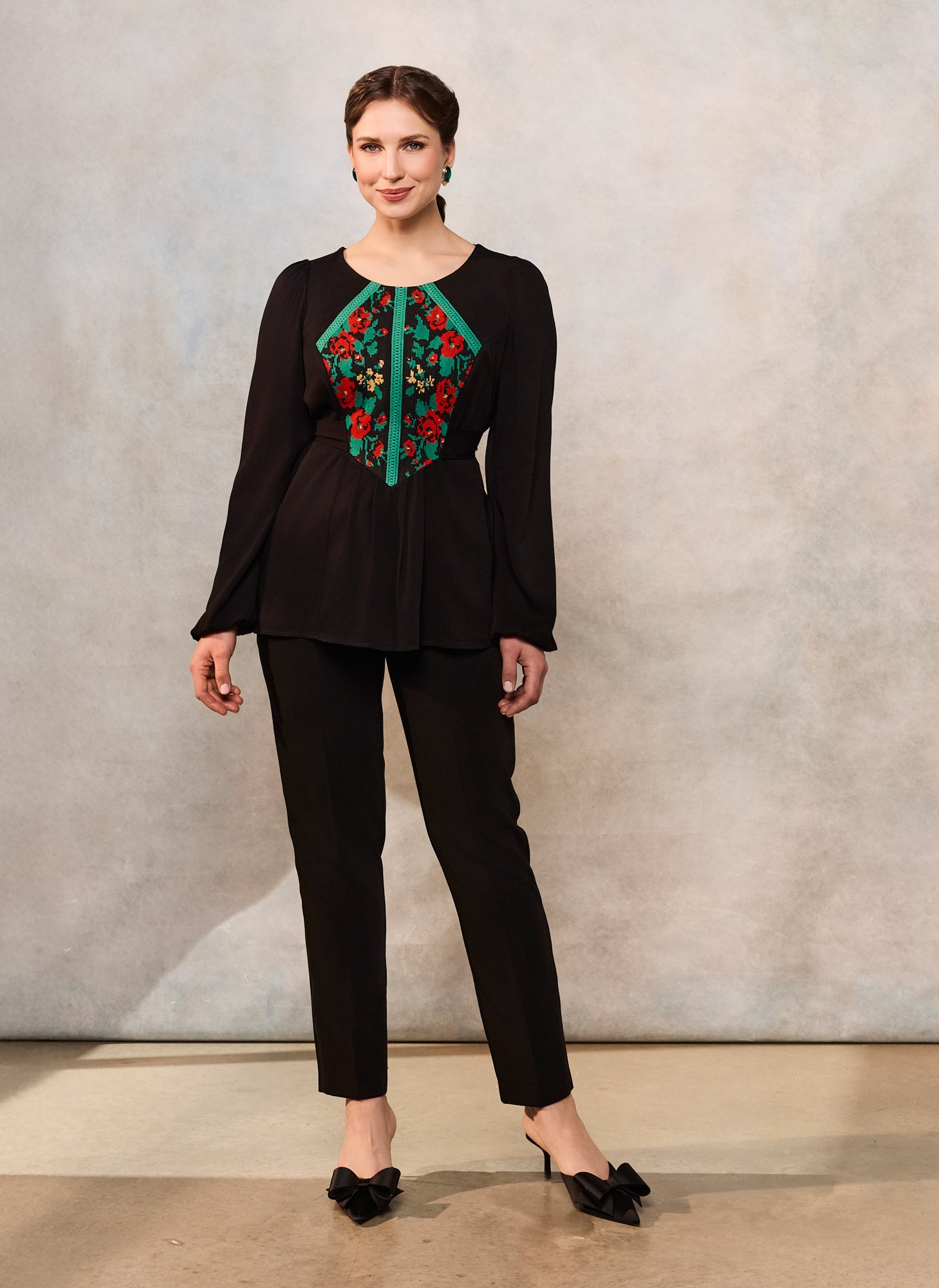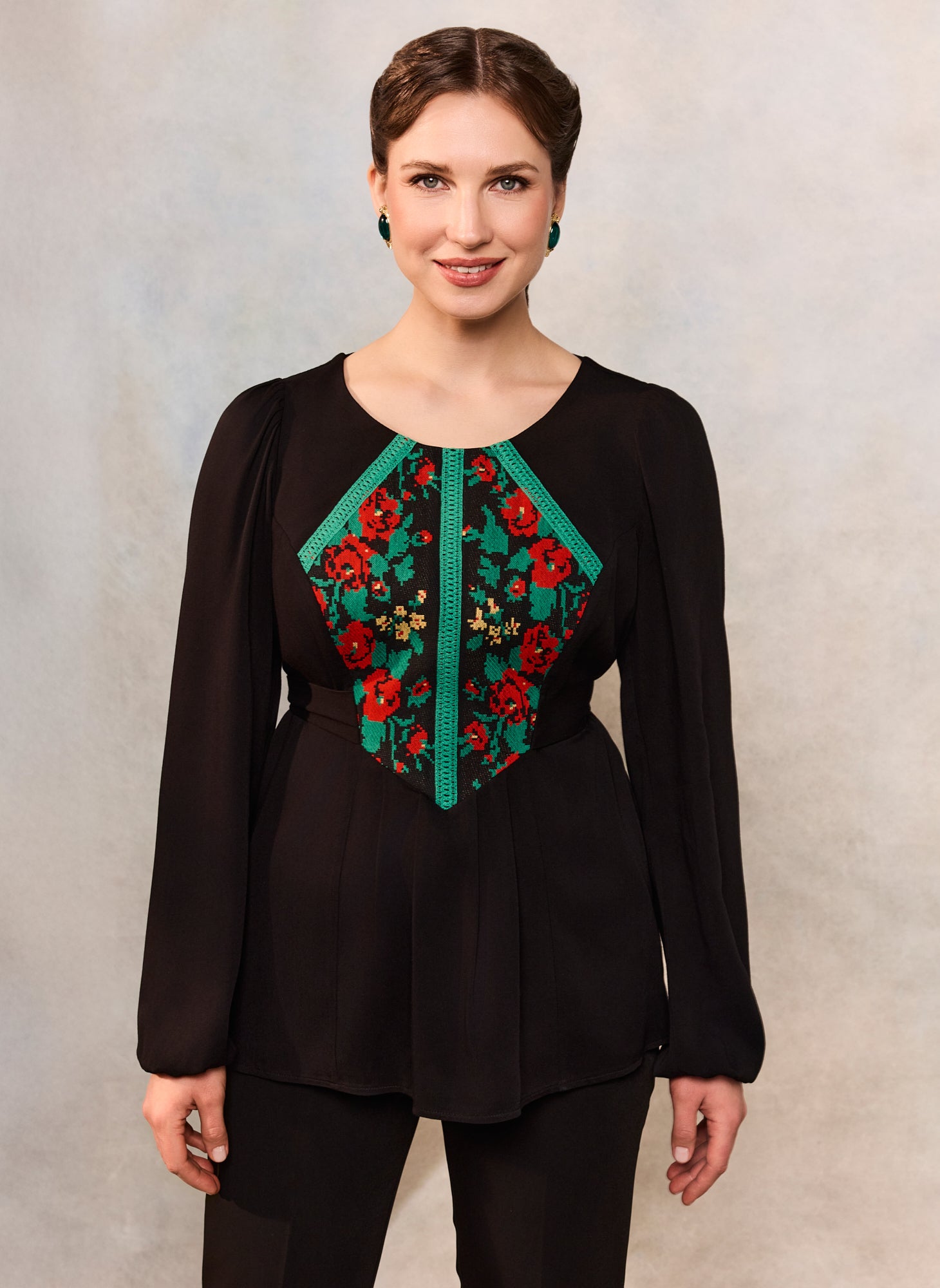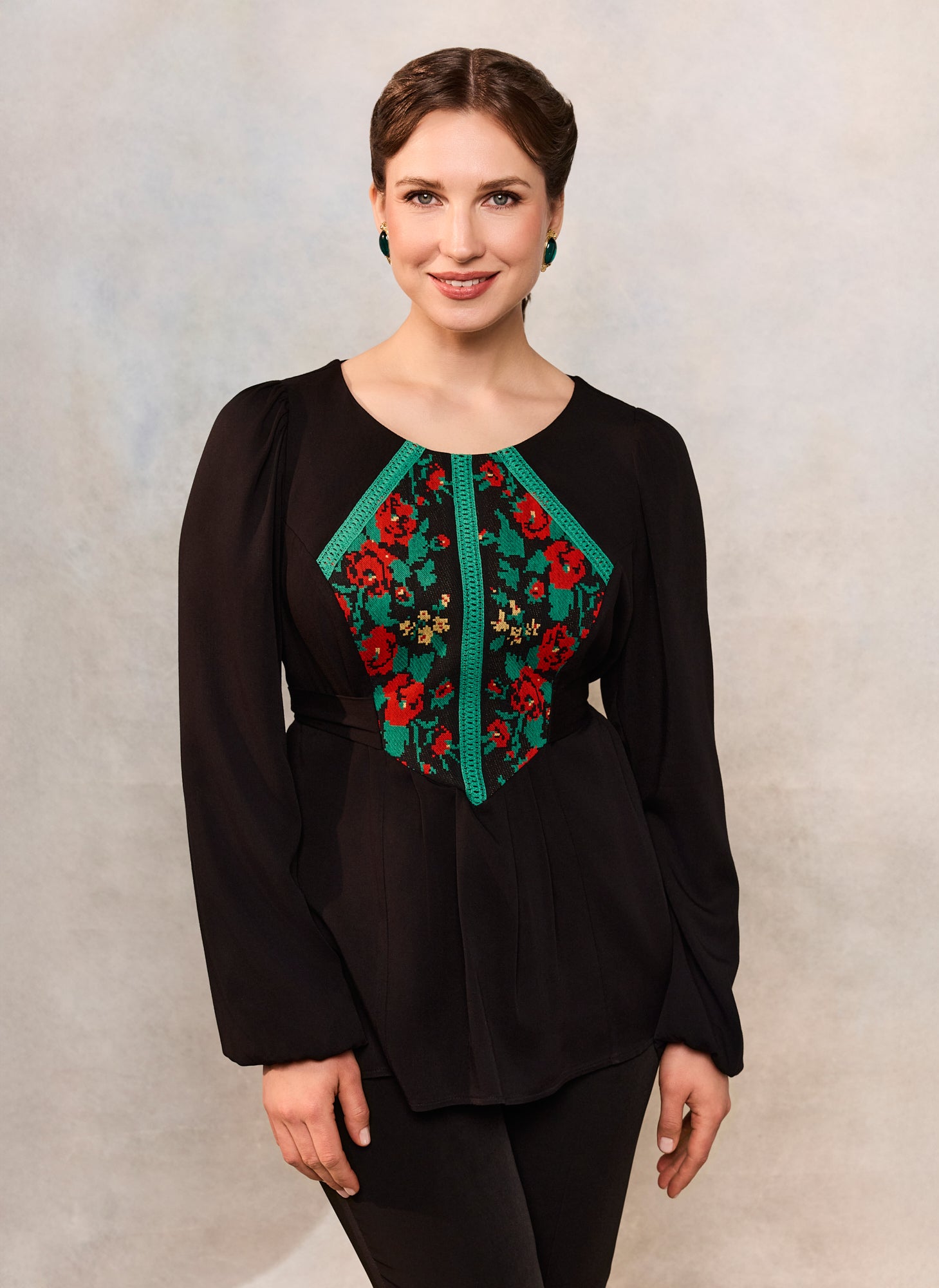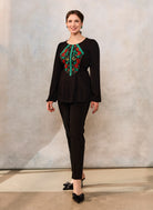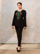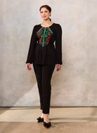 Bluza etno cu corset românesc este confecționată din viscoză neagră premium, cu densitate medie și cădere frumoasă, jacquard floral țesut la război și dantelă tradițională verde.
