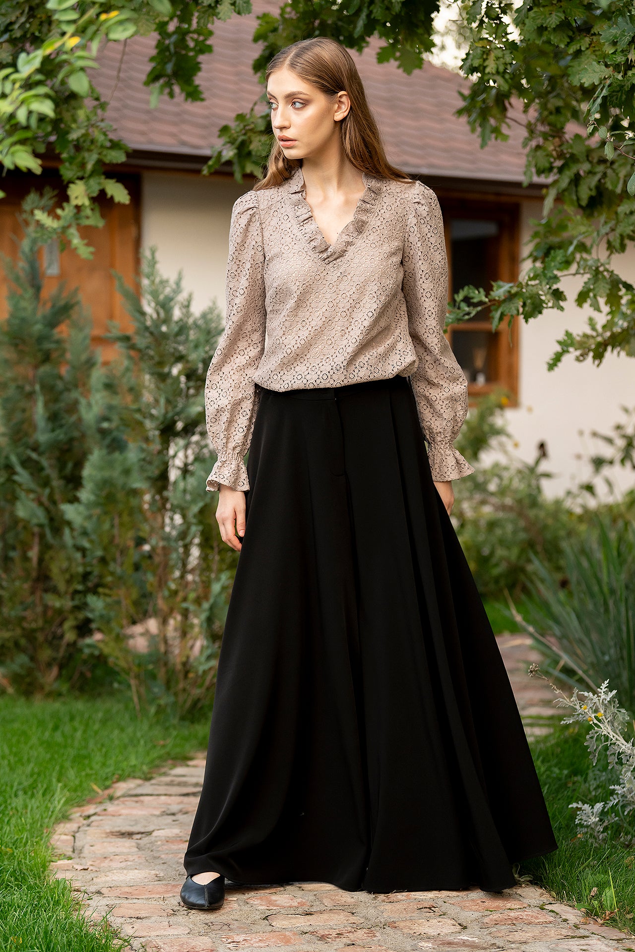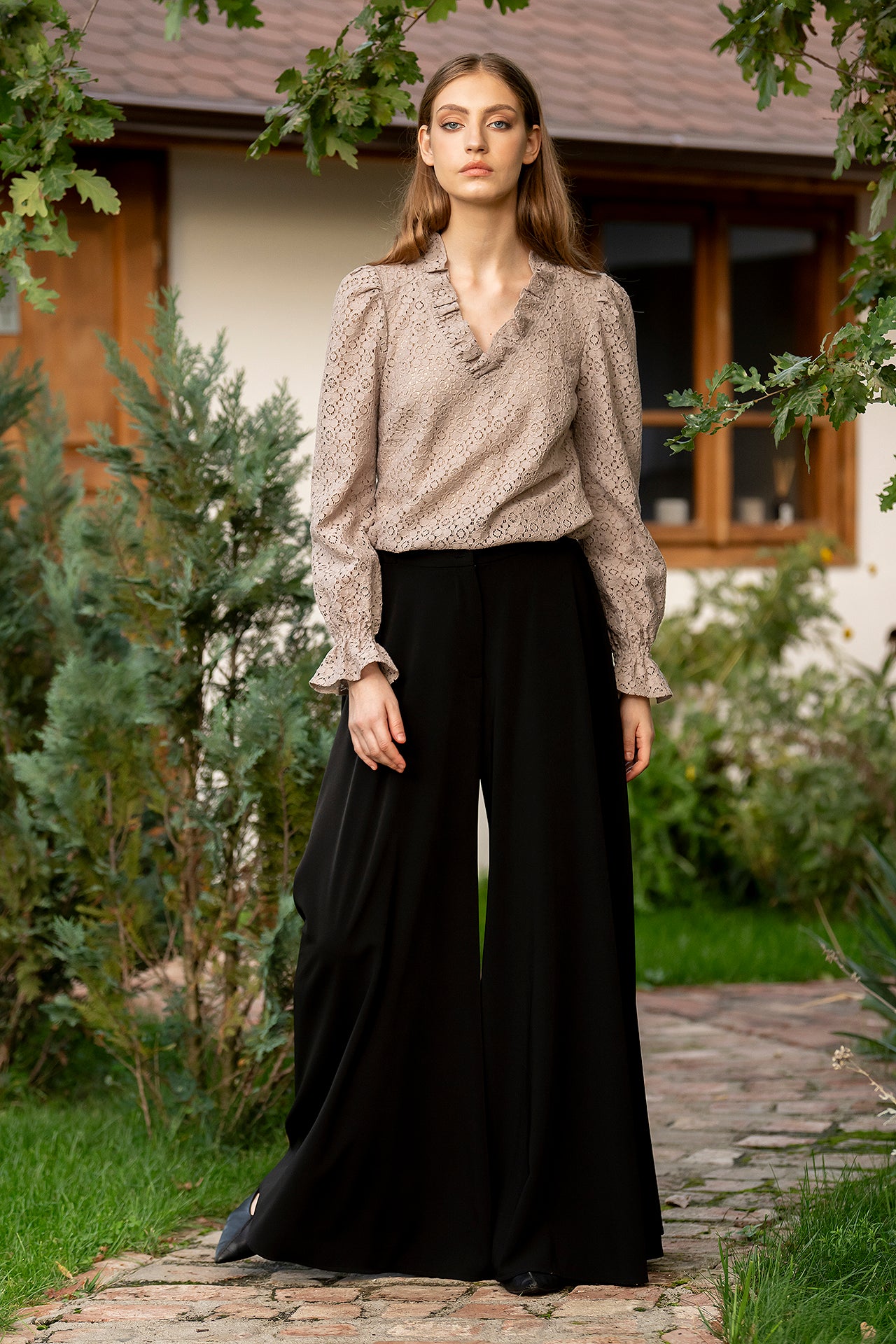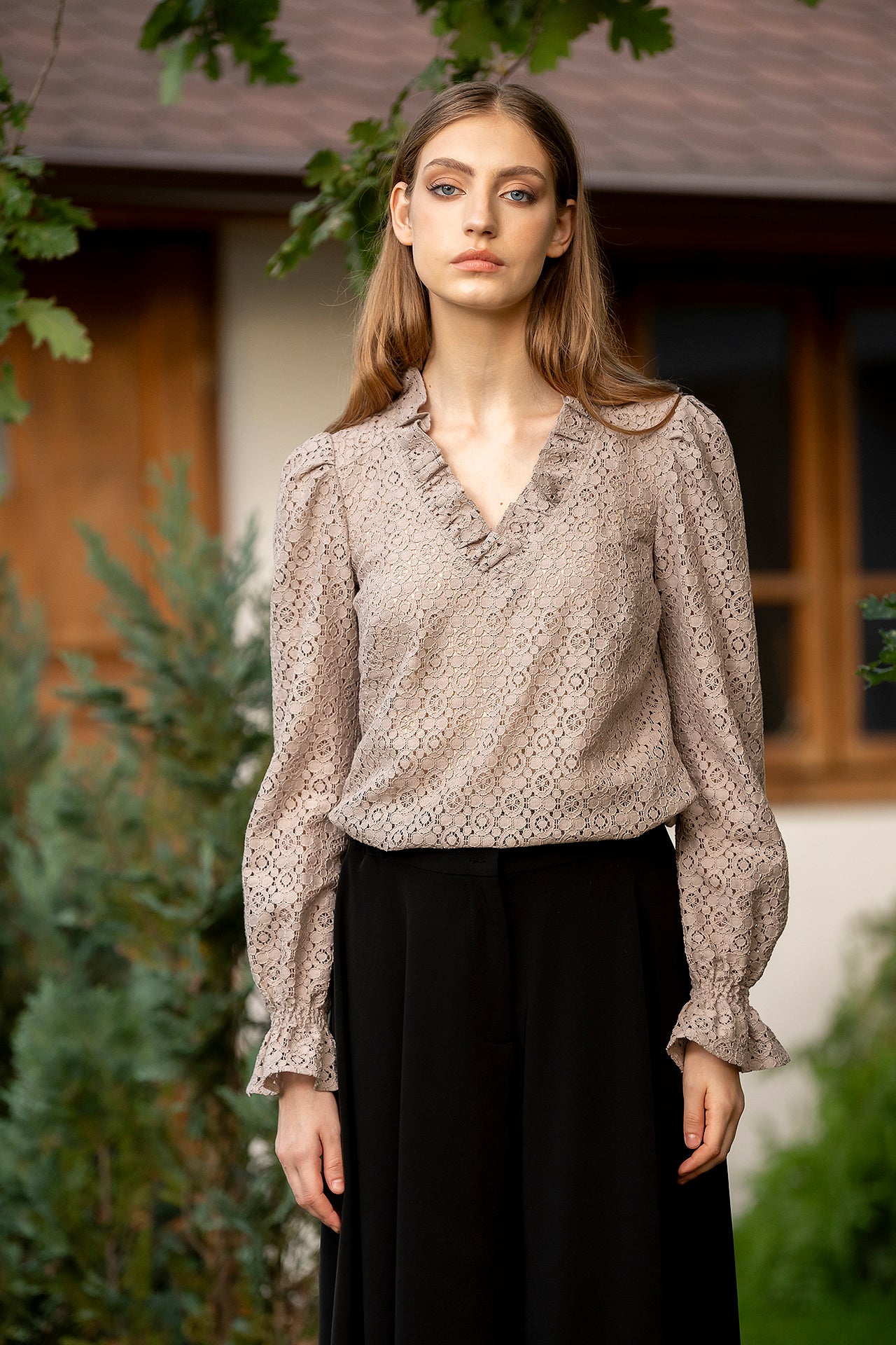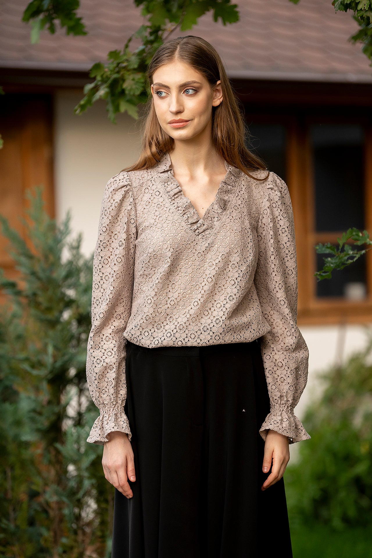 Bluza Ozana are un croi lejer, cu decolteul în anchior, paspoalat cu volan din dantelă.