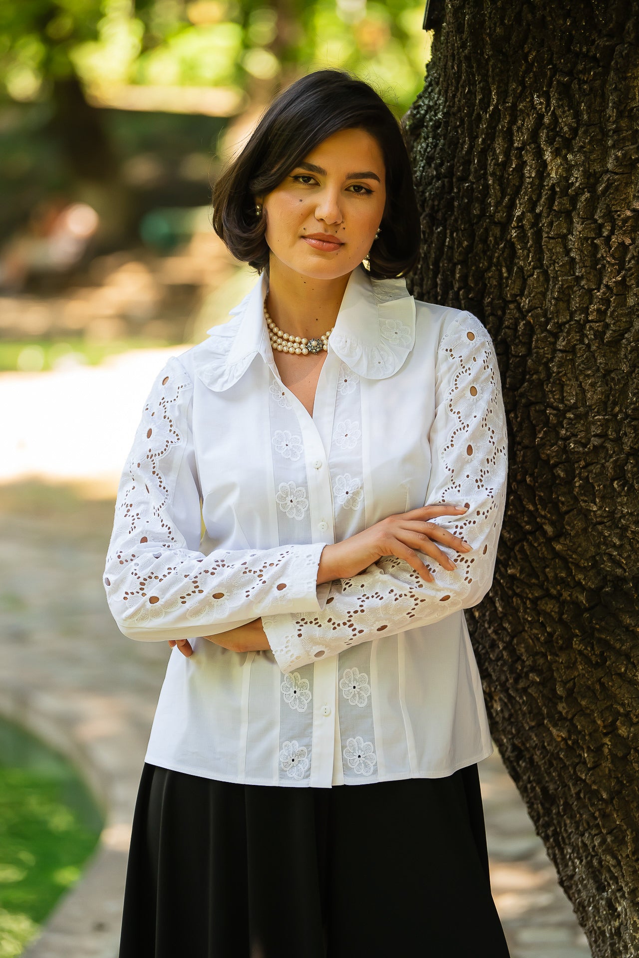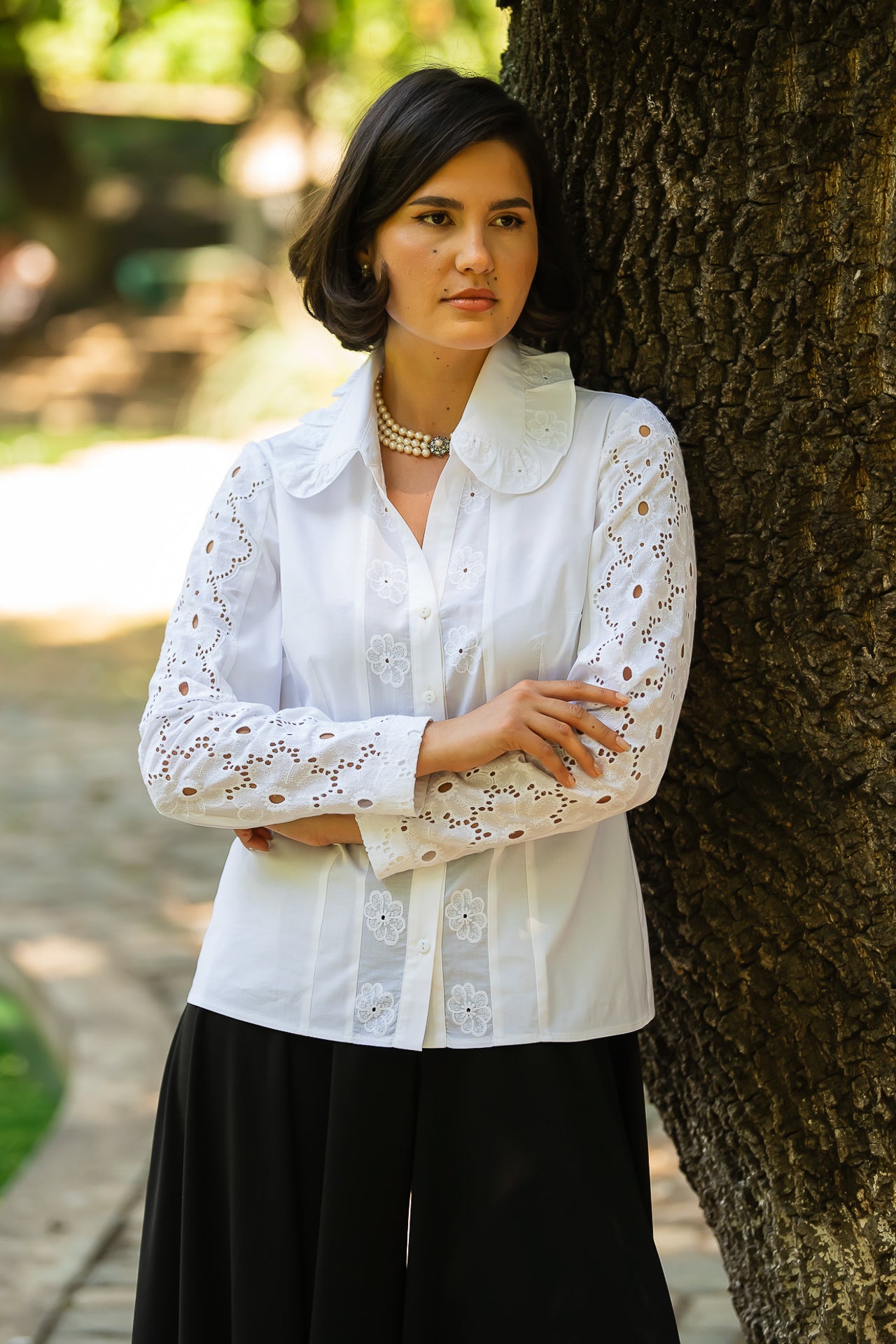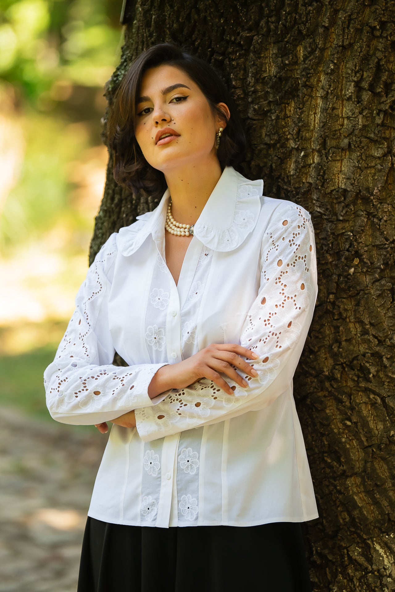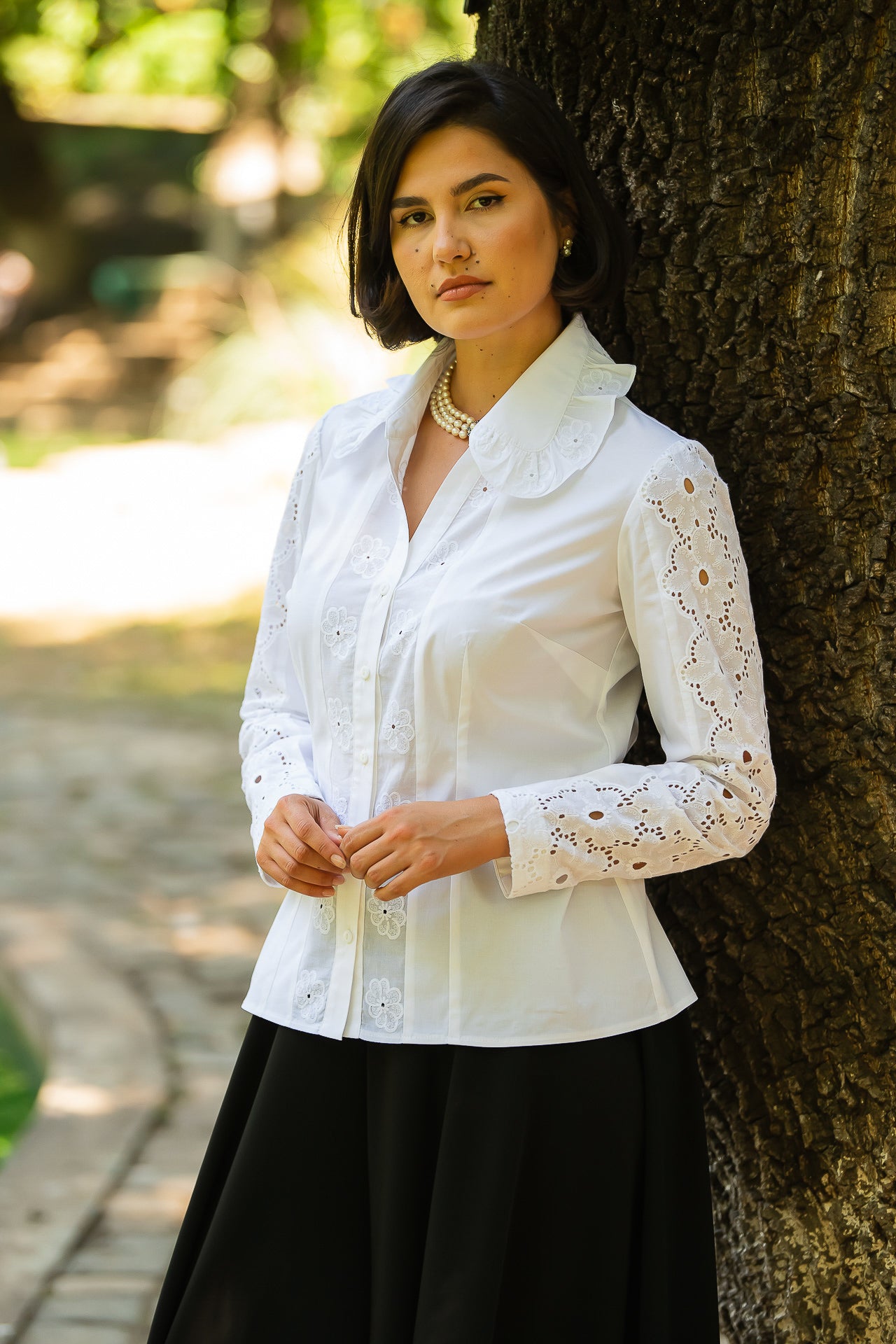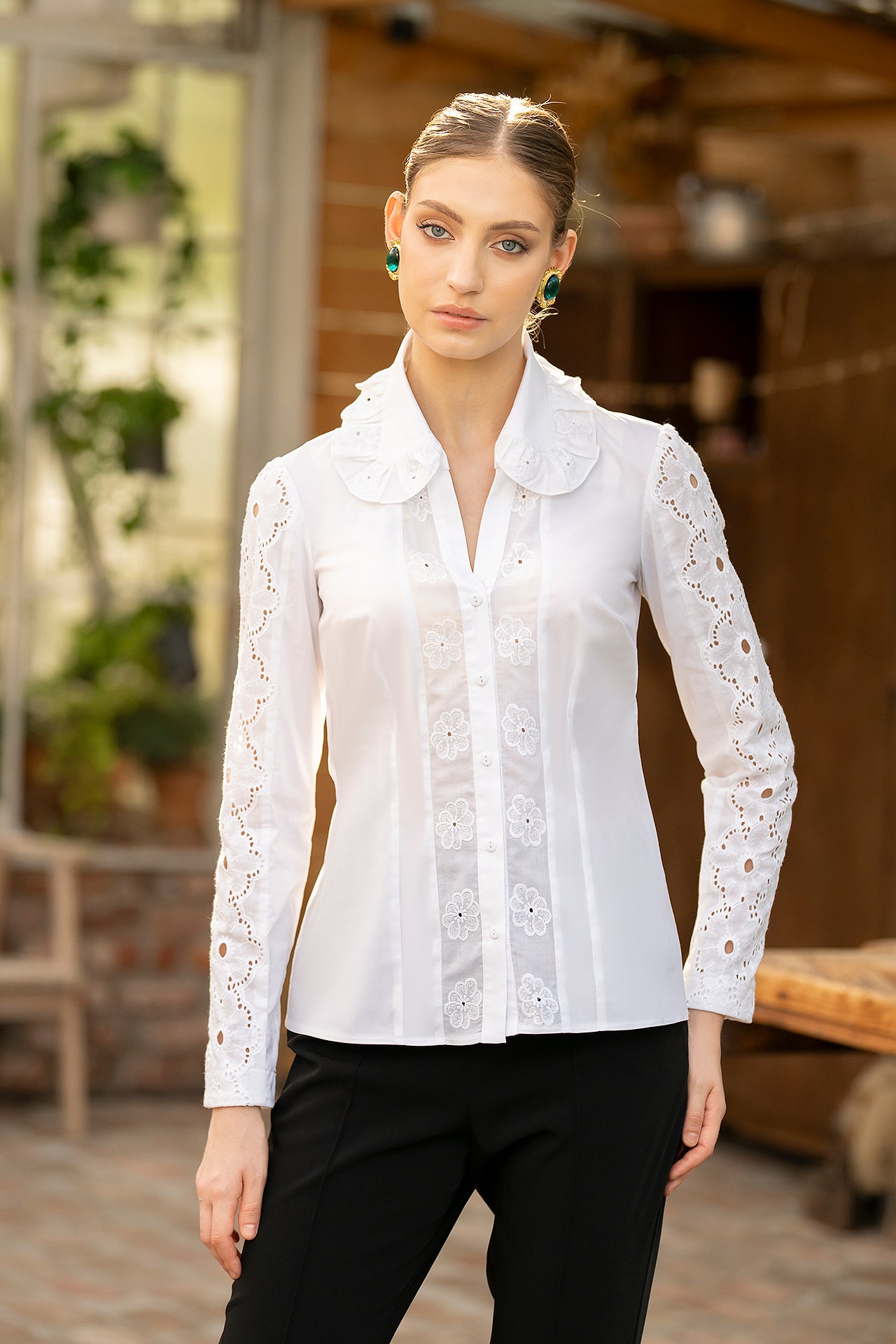 Cămașa cu broderie florală este o piesă feminină, elegantă și rafinată, care poate fi integrată cu succes într-o ținută elegantă cât și într-o ținută relaxată, cu fustă sau pantaloni.