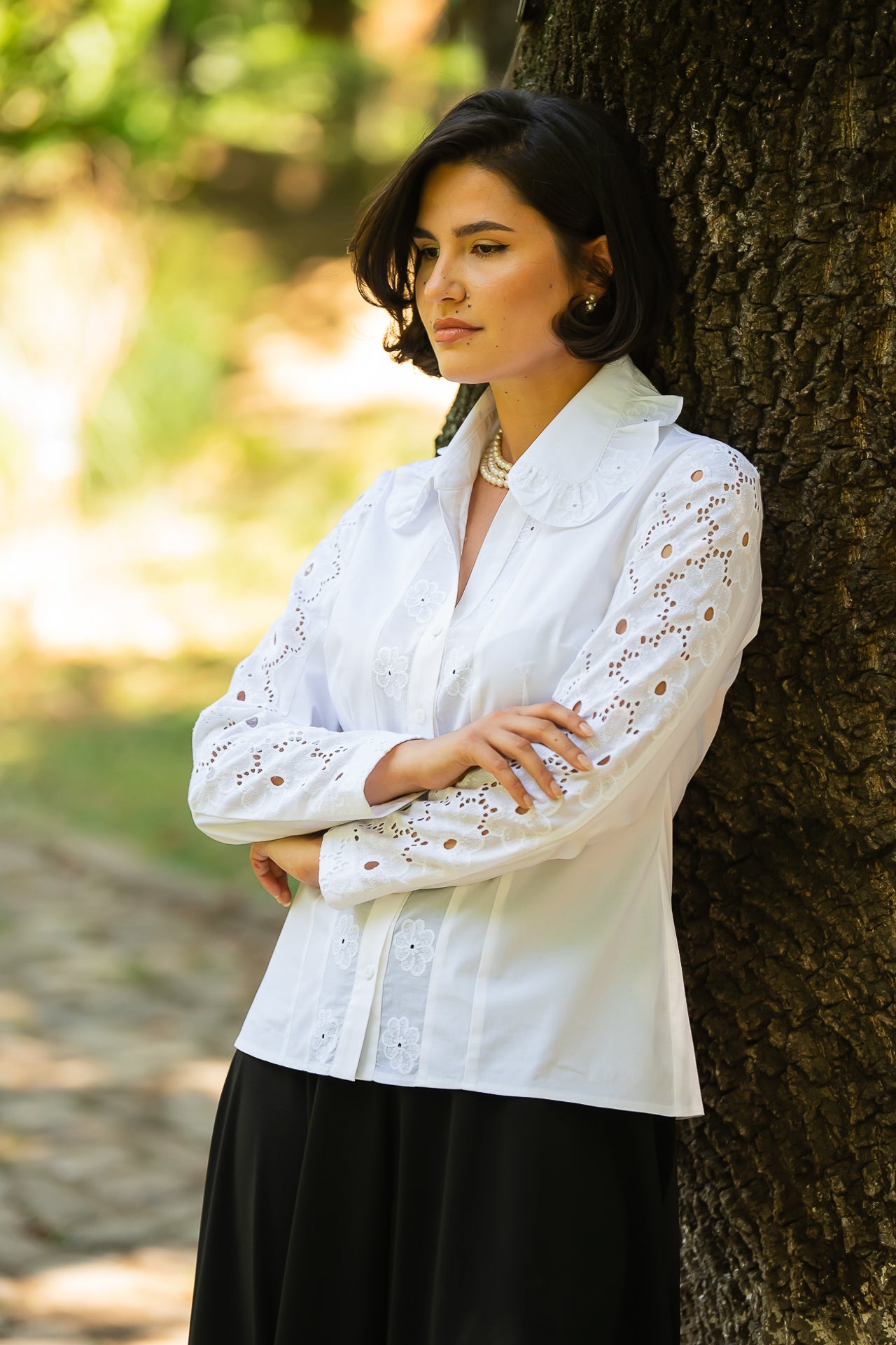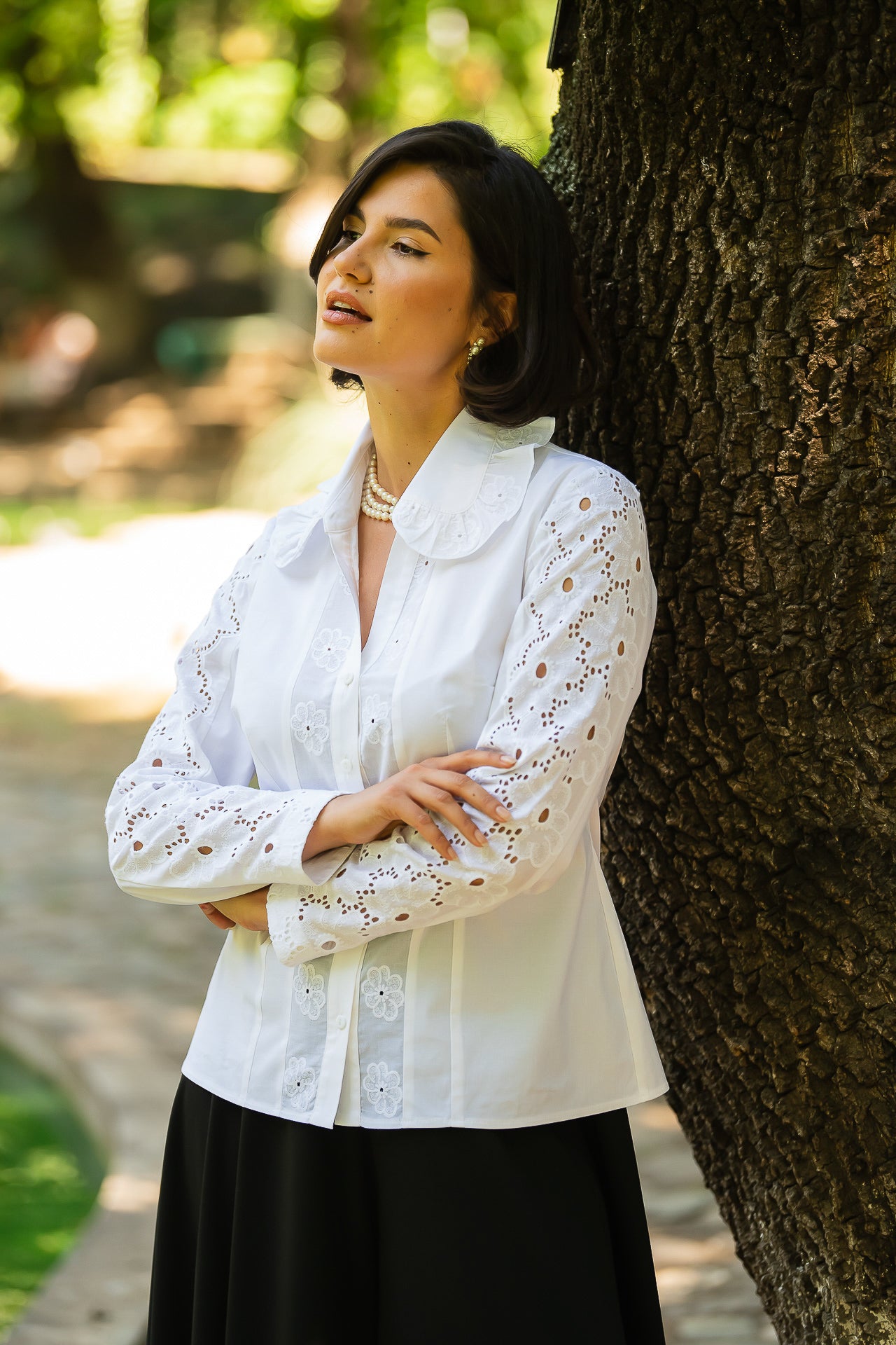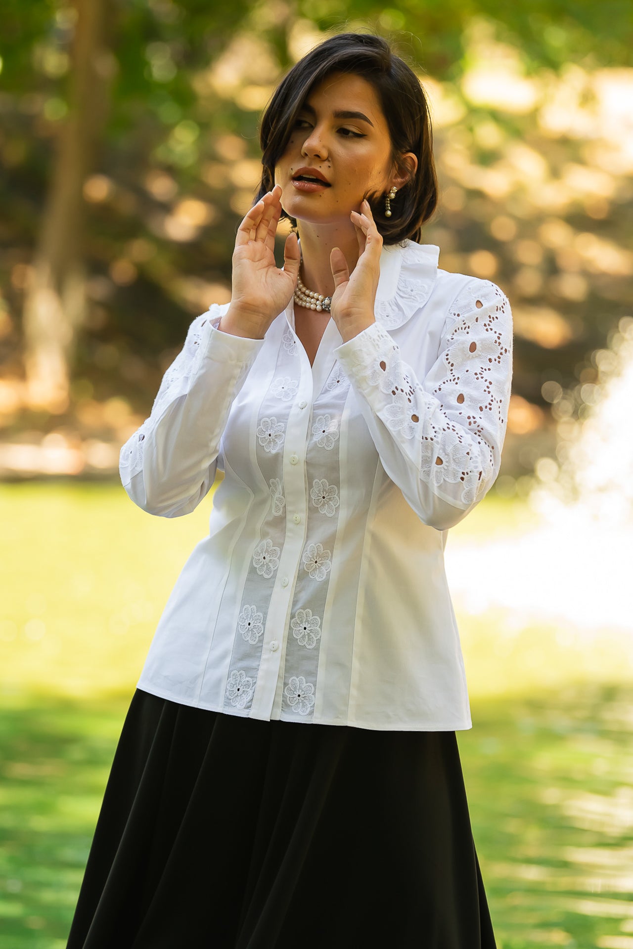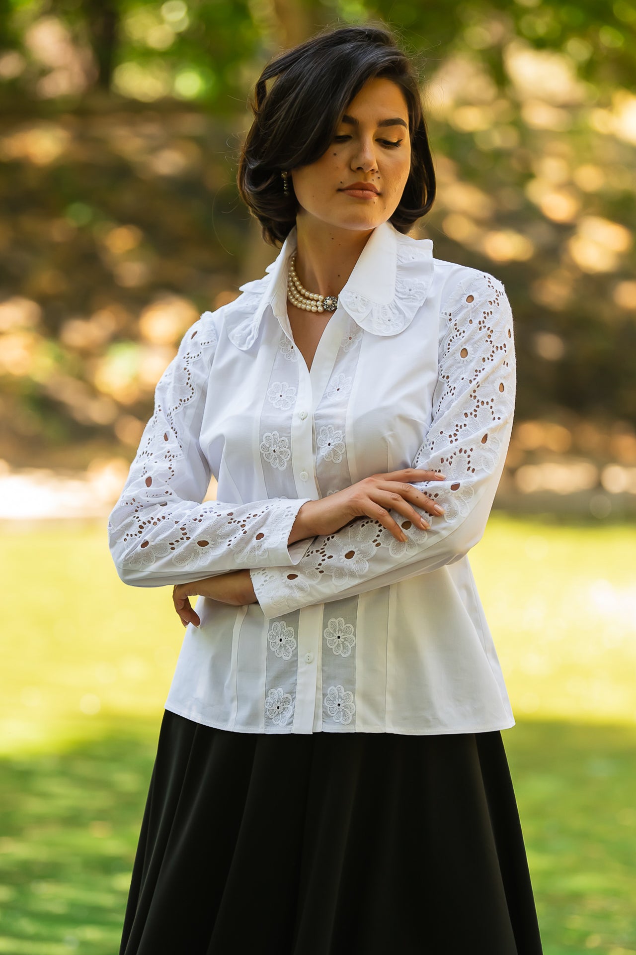 Cămașa cu broderie florală este o piesă feminină, elegantă și rafinată, care poate fi integrată cu succes într-o ținută elegantă cât și într-o ținută relaxată, cu fustă sau pantaloni.