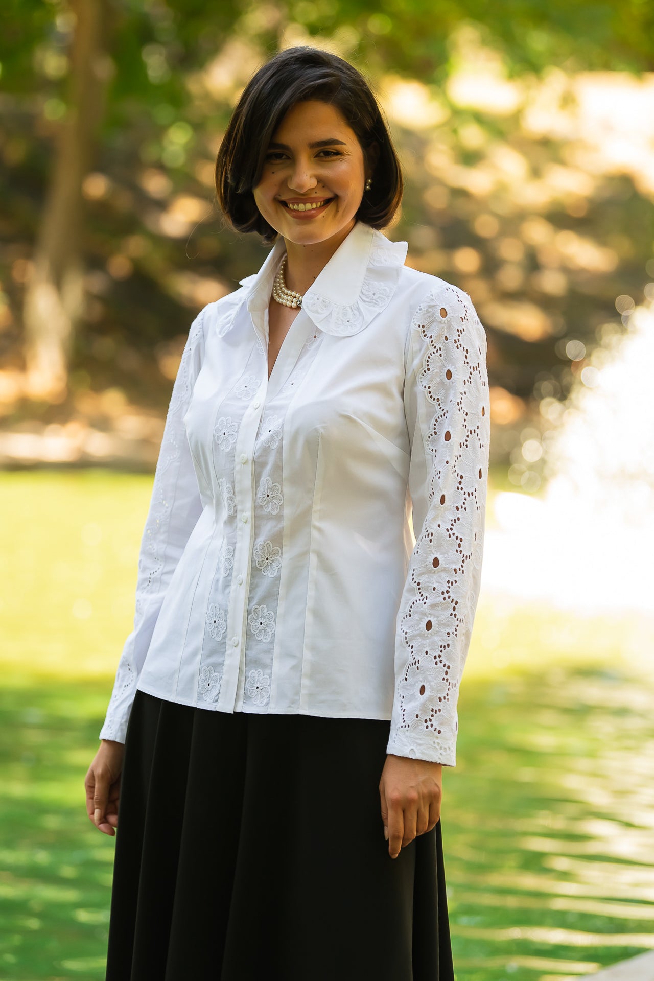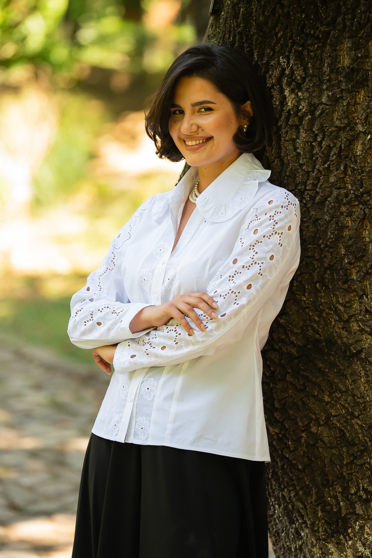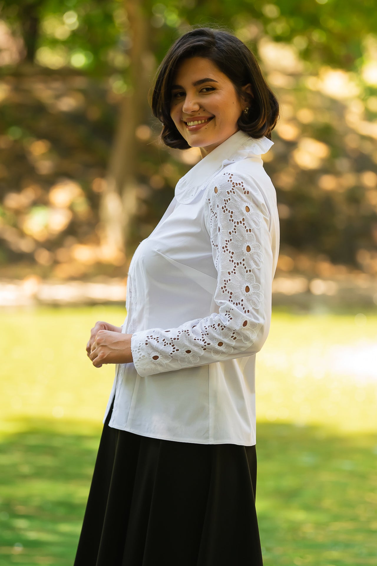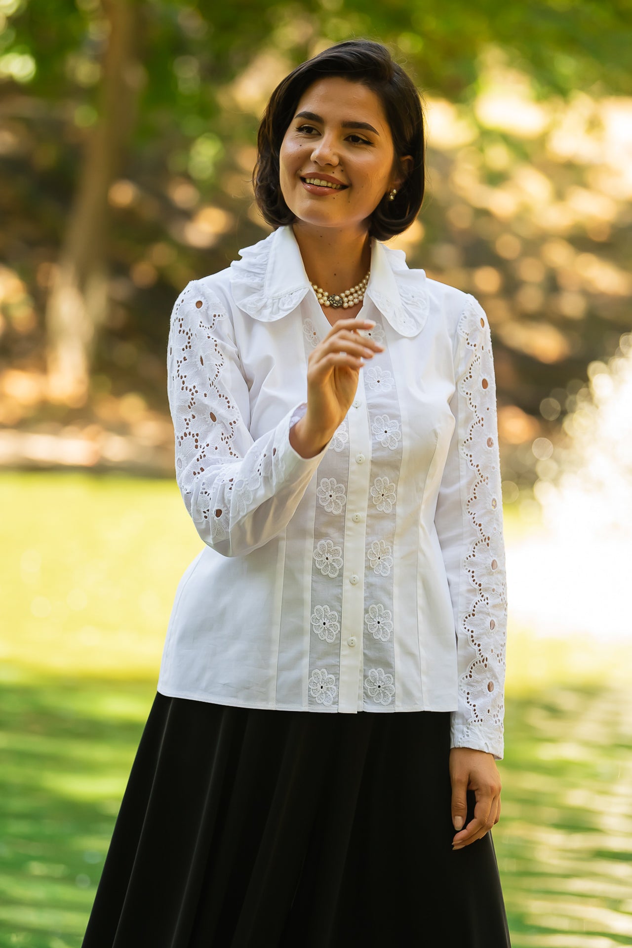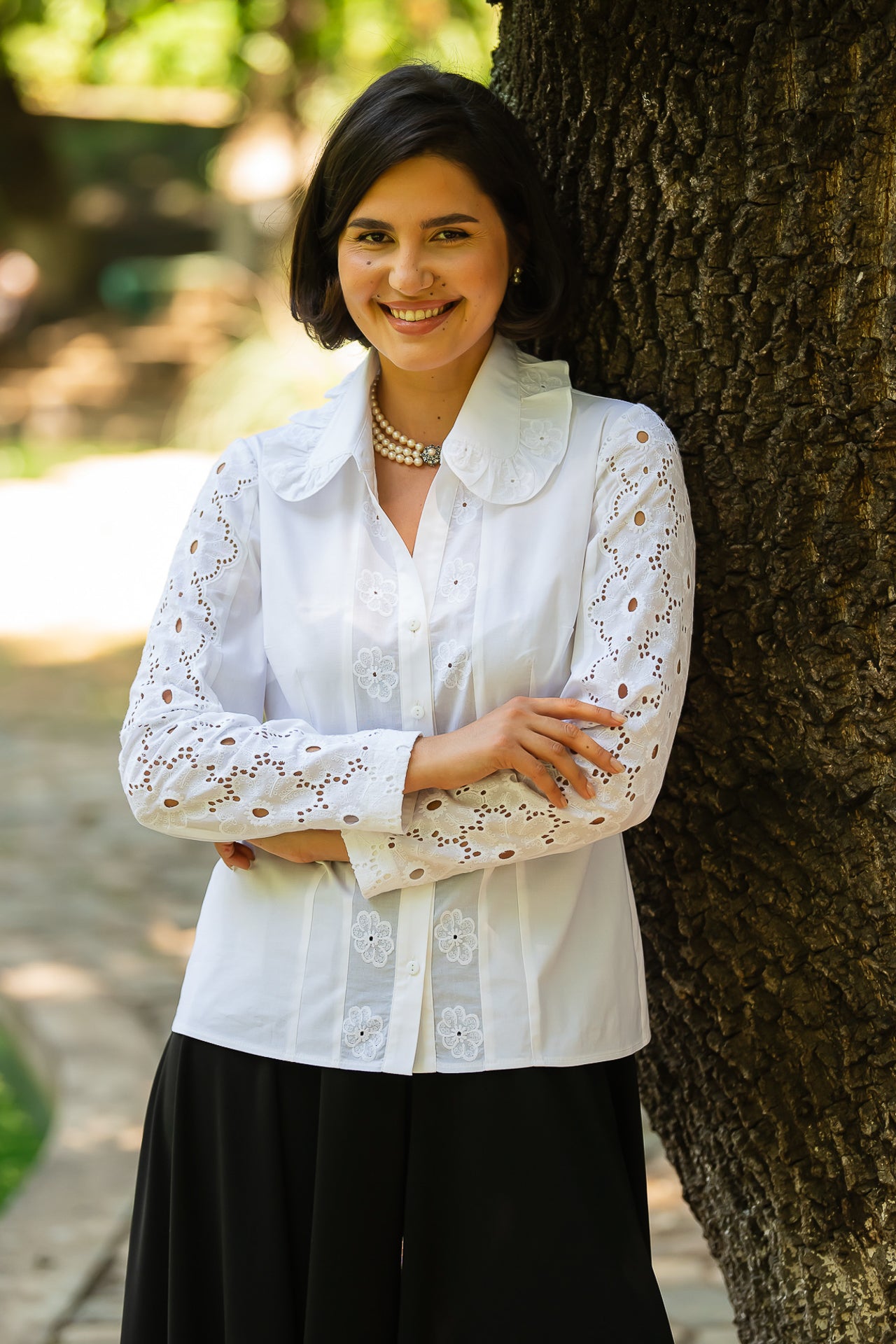 Cămașa cu broderie florală este o piesă feminină, elegantă și rafinată, care poate fi integrată cu succes într-o ținută elegantă cât și într-o ținută relaxată, cu fustă sau pantaloni.