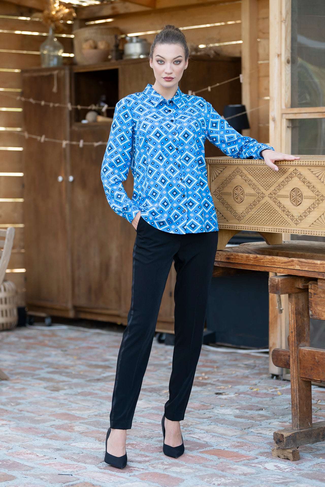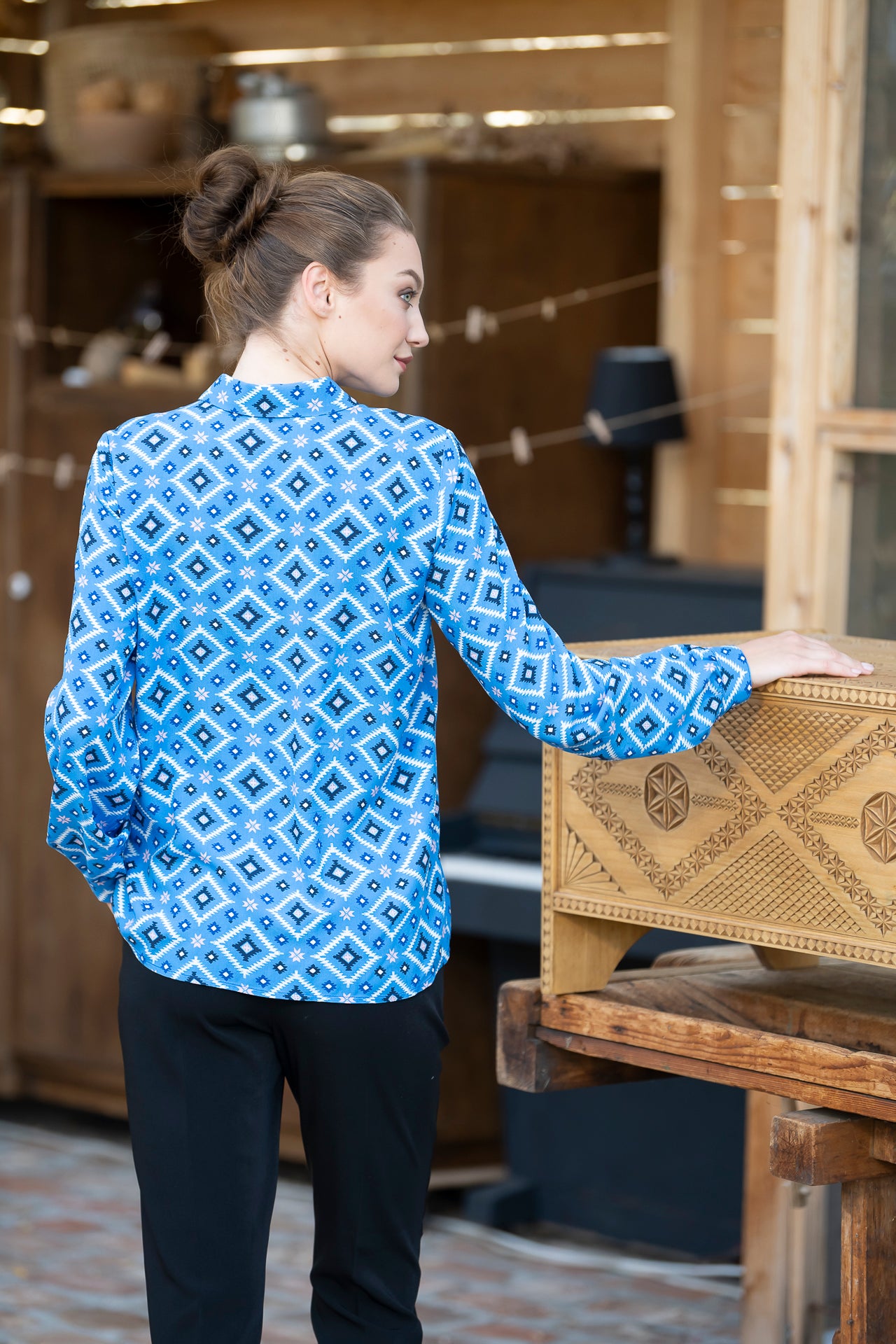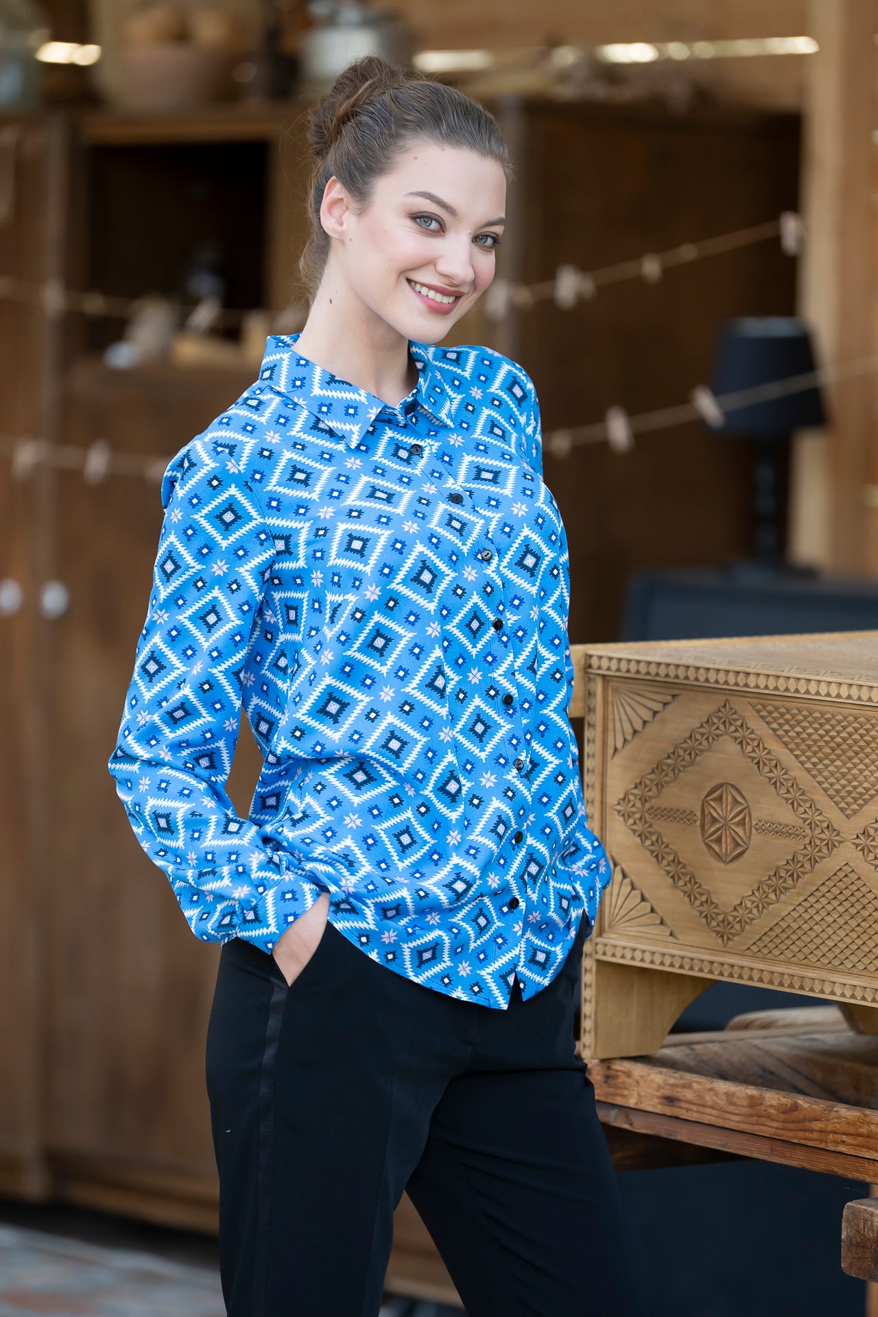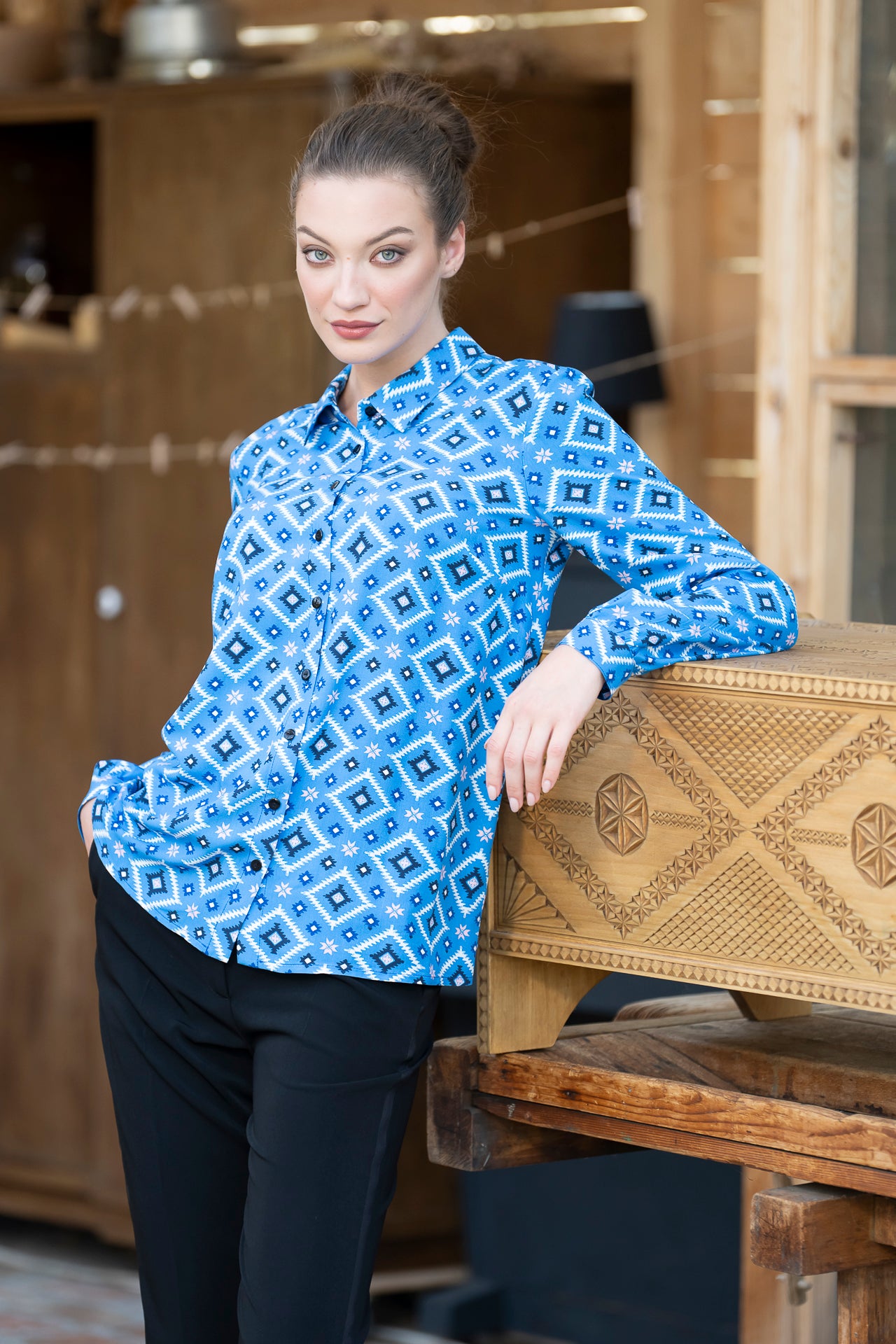 Cămașa albastră rombul vieții este confecționată din viscoză premium, imprimată digital cu motive tradiționale.