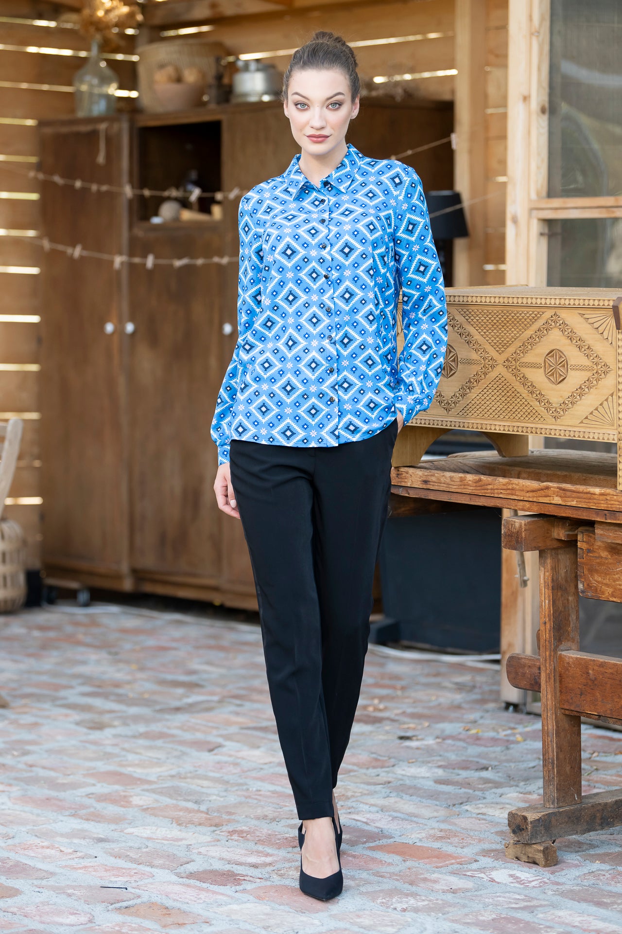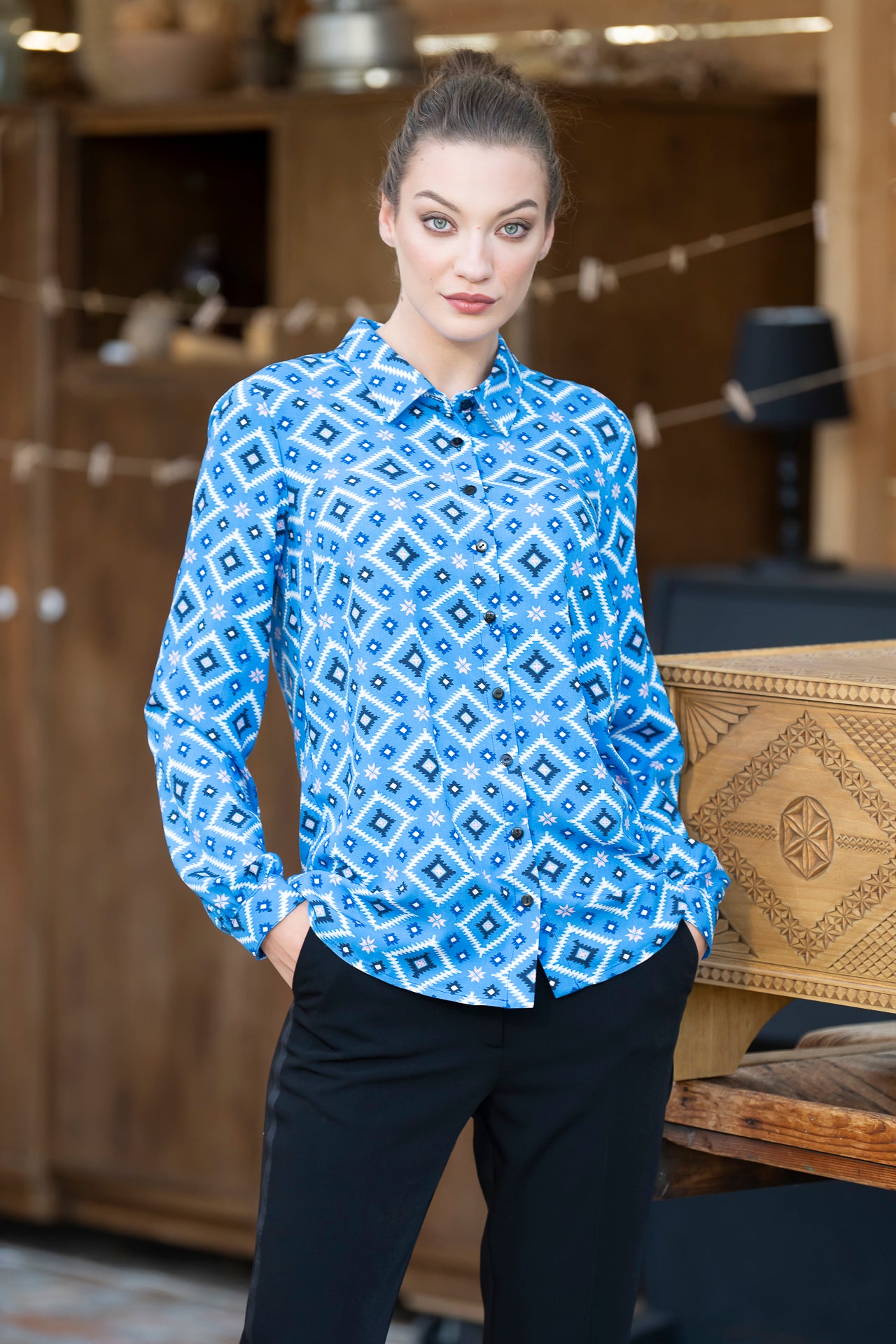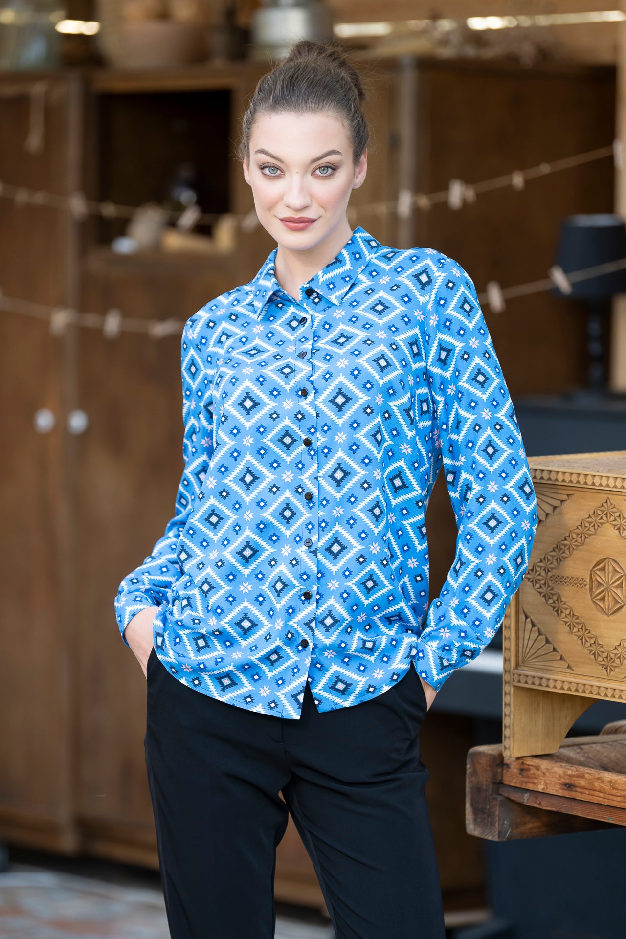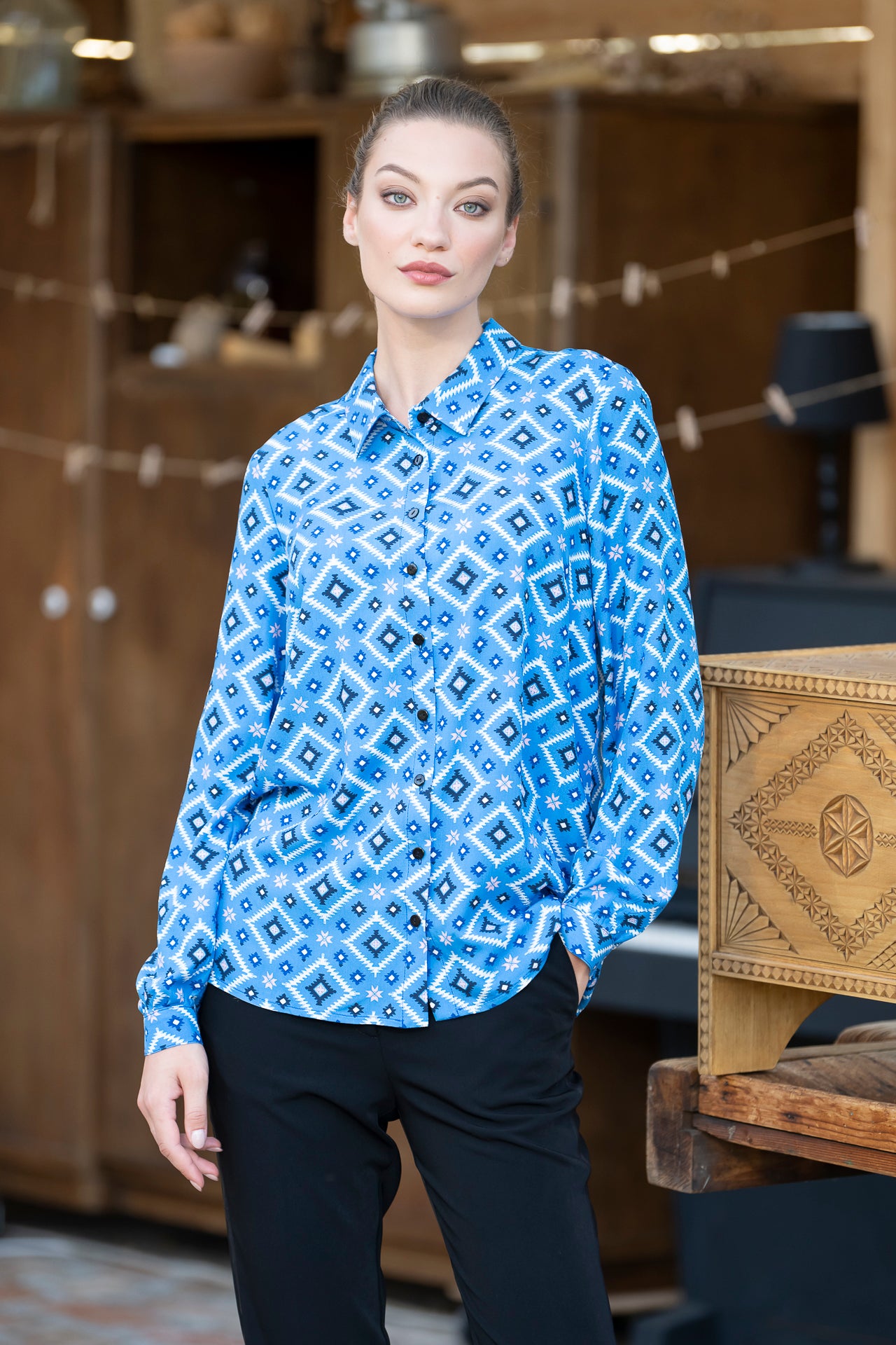 Cămașa albastră rombul vieții este confecționată din viscoză premium, imprimată digital cu motive tradiționale.