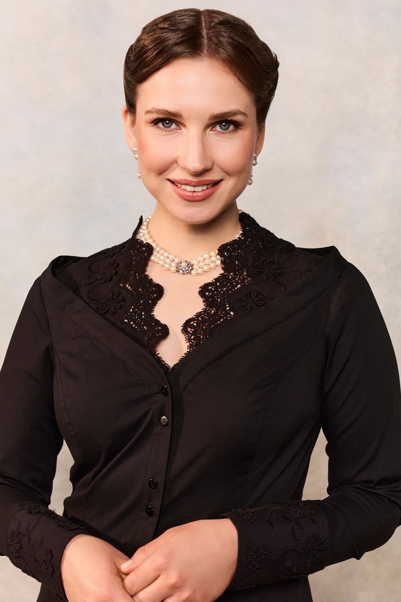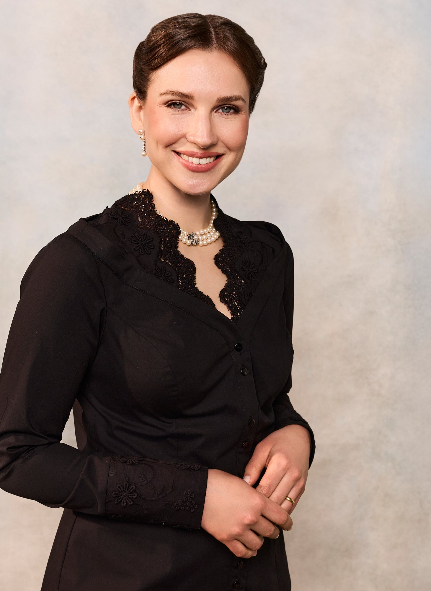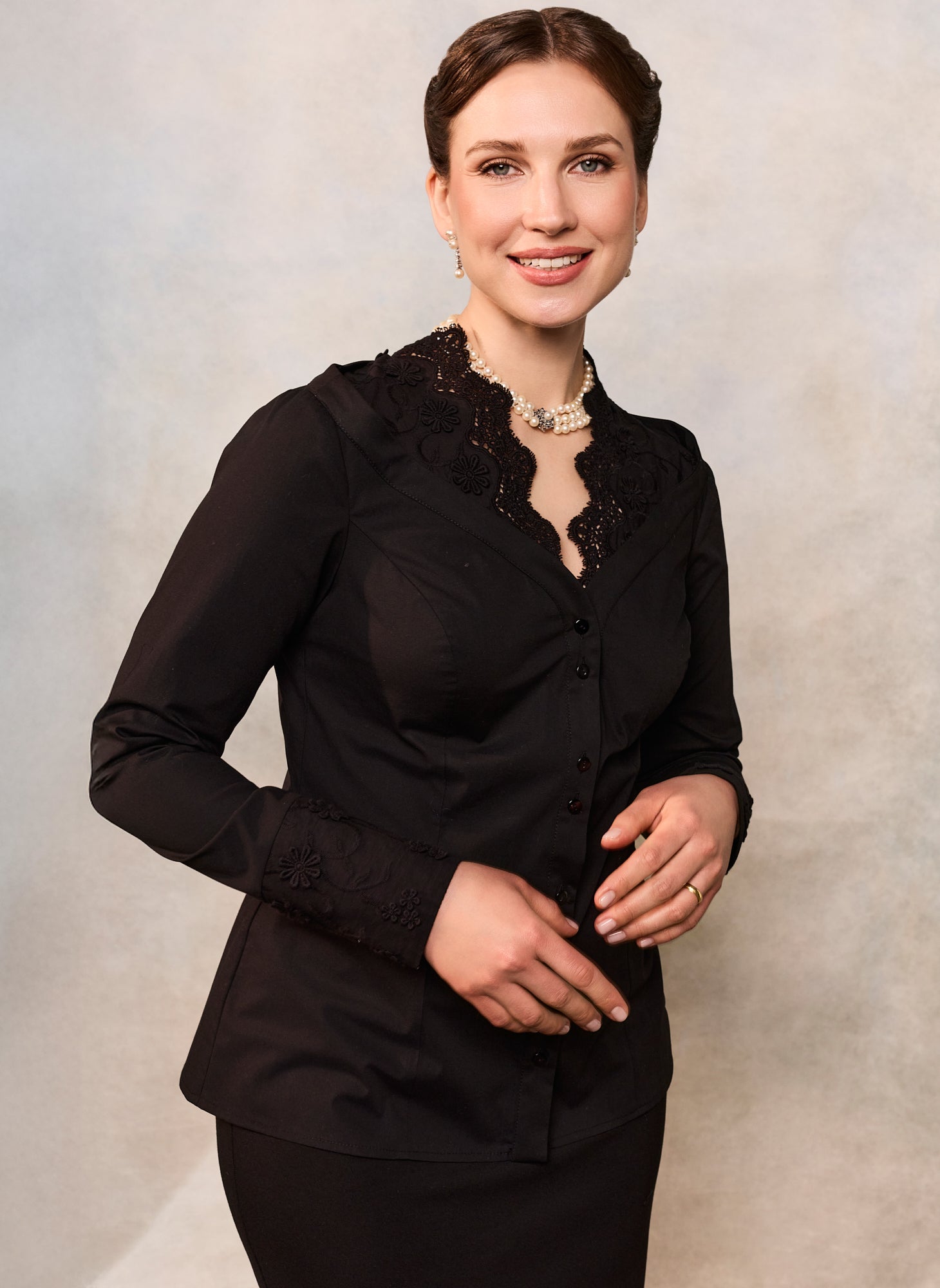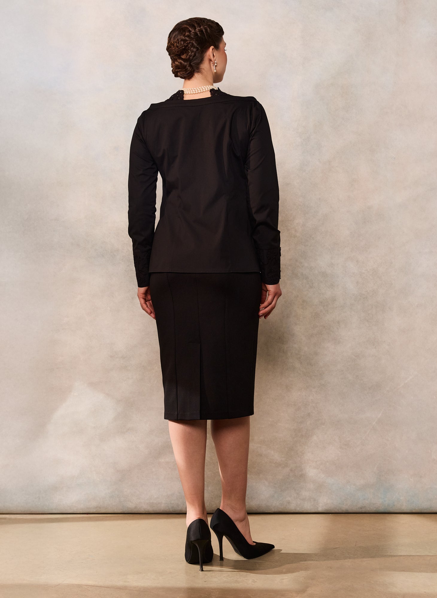 Este confecționată din poplin negru de bumbac și este înnobilată cu dantelă și broderie florală tridimensională.