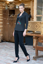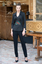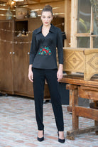 Cămașa este confecționată din poplin negru fin, de densitate medie cu elastan și este accesorizată pe talie cu jacquard etnic țesut la război cu motive florale.