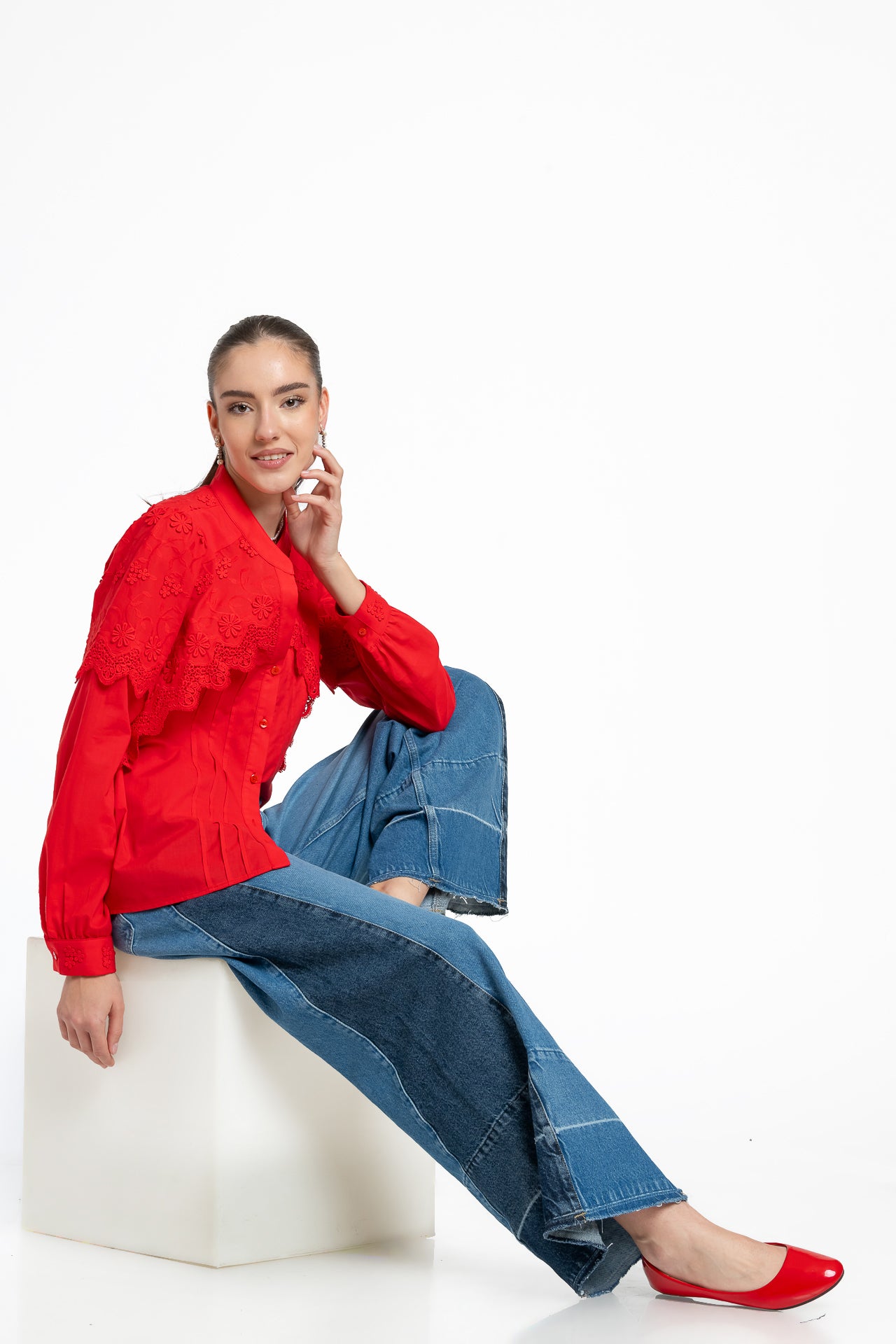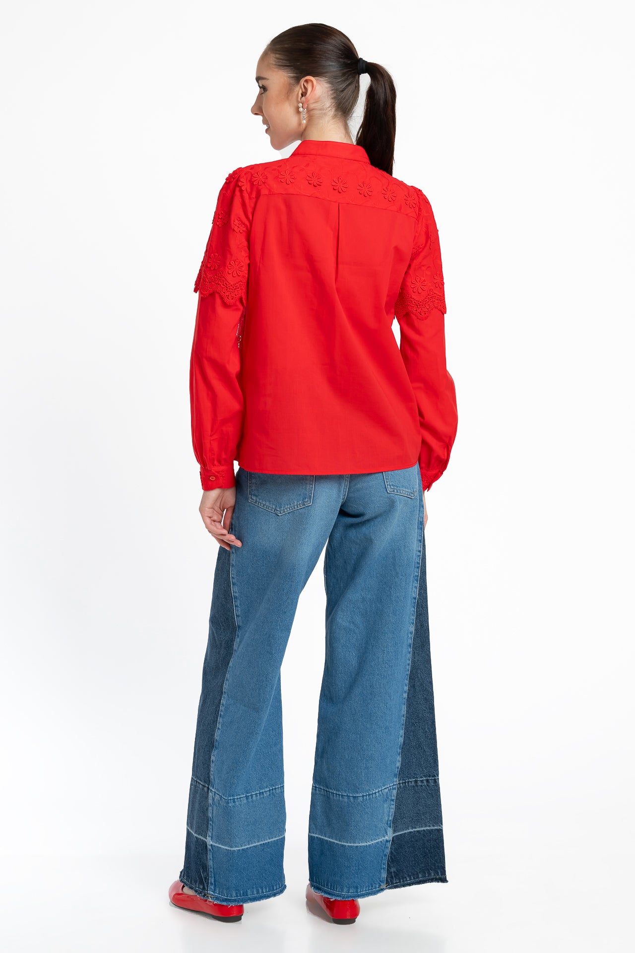 Cămașa roșie din batist de bumbac și broderie tridimensională