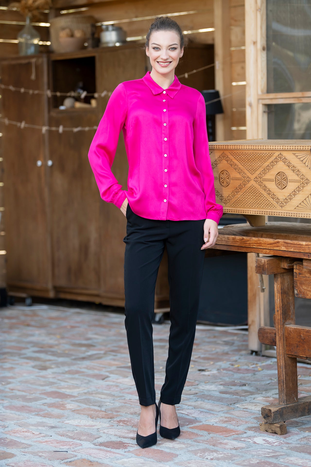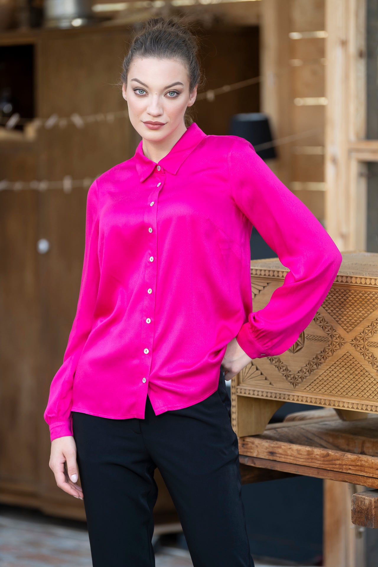 Cămașa roz fucsia este confecționată dintr-un mix satinat de viscoză cu mătase.