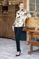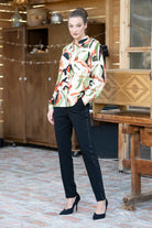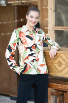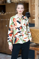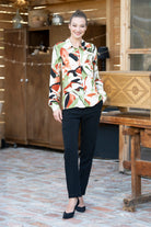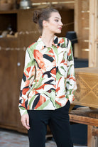 Cămașa sevalet de toamnă este confecționată din viscoză premium, imprimată digital cu motive geometrice în culorile toamnei.