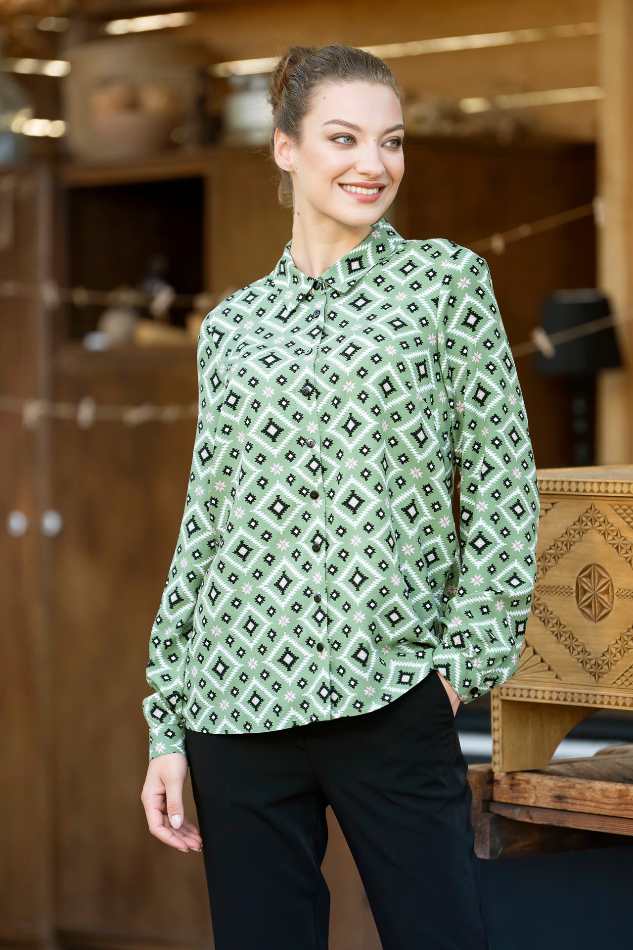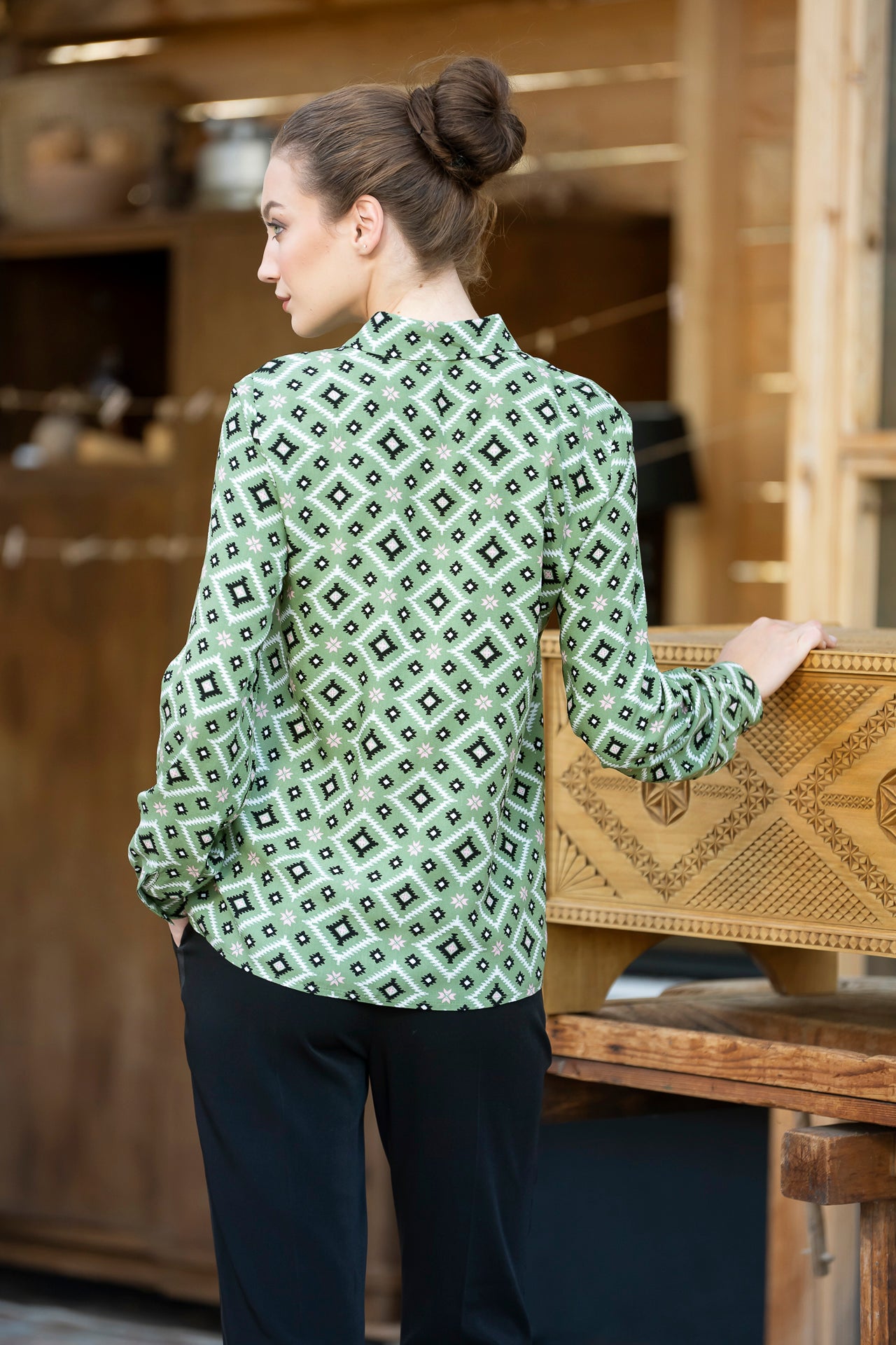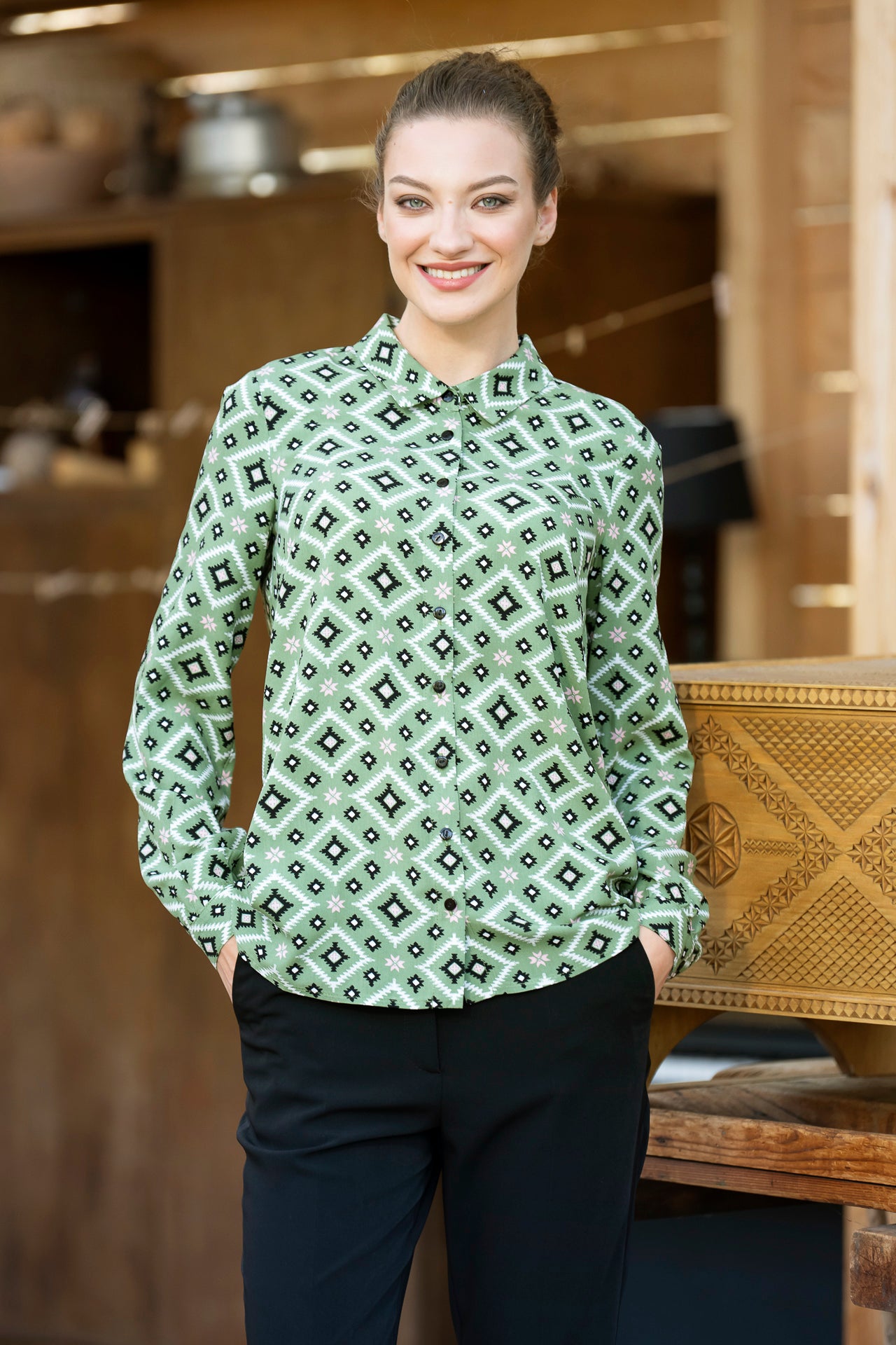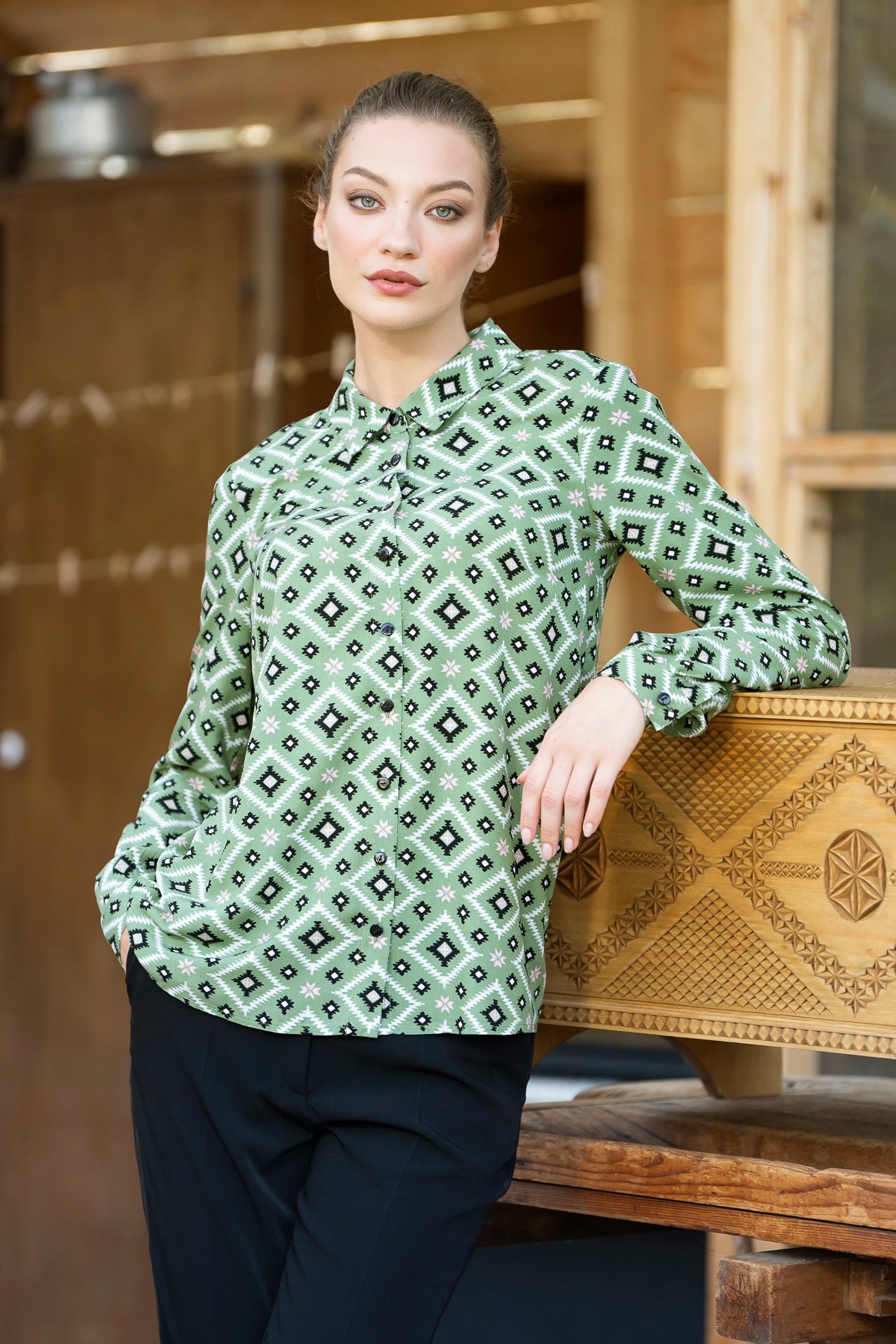 Cămașa verde măsliniu rombul vieții este confecționată din viscoză premium, imprimată digital cu motive tradiționale.