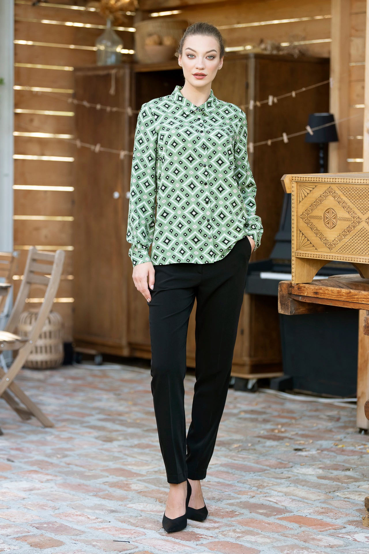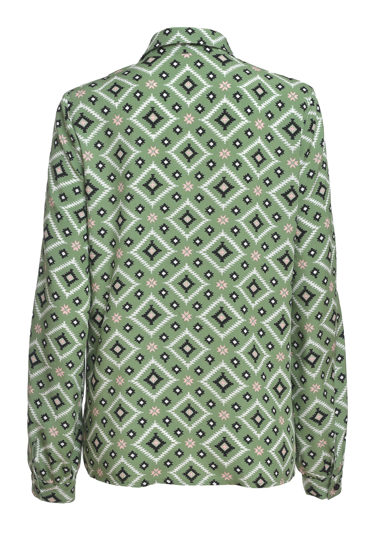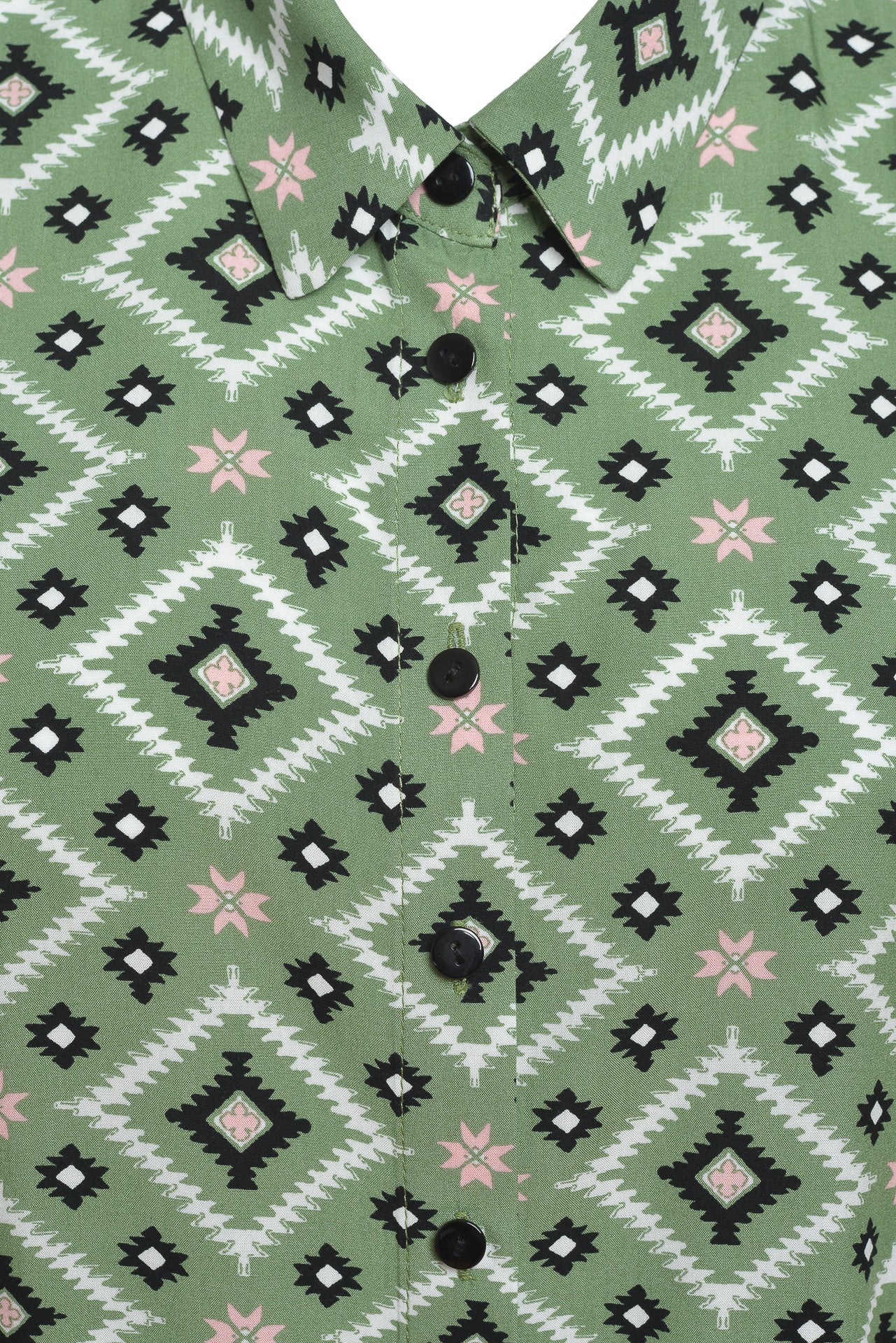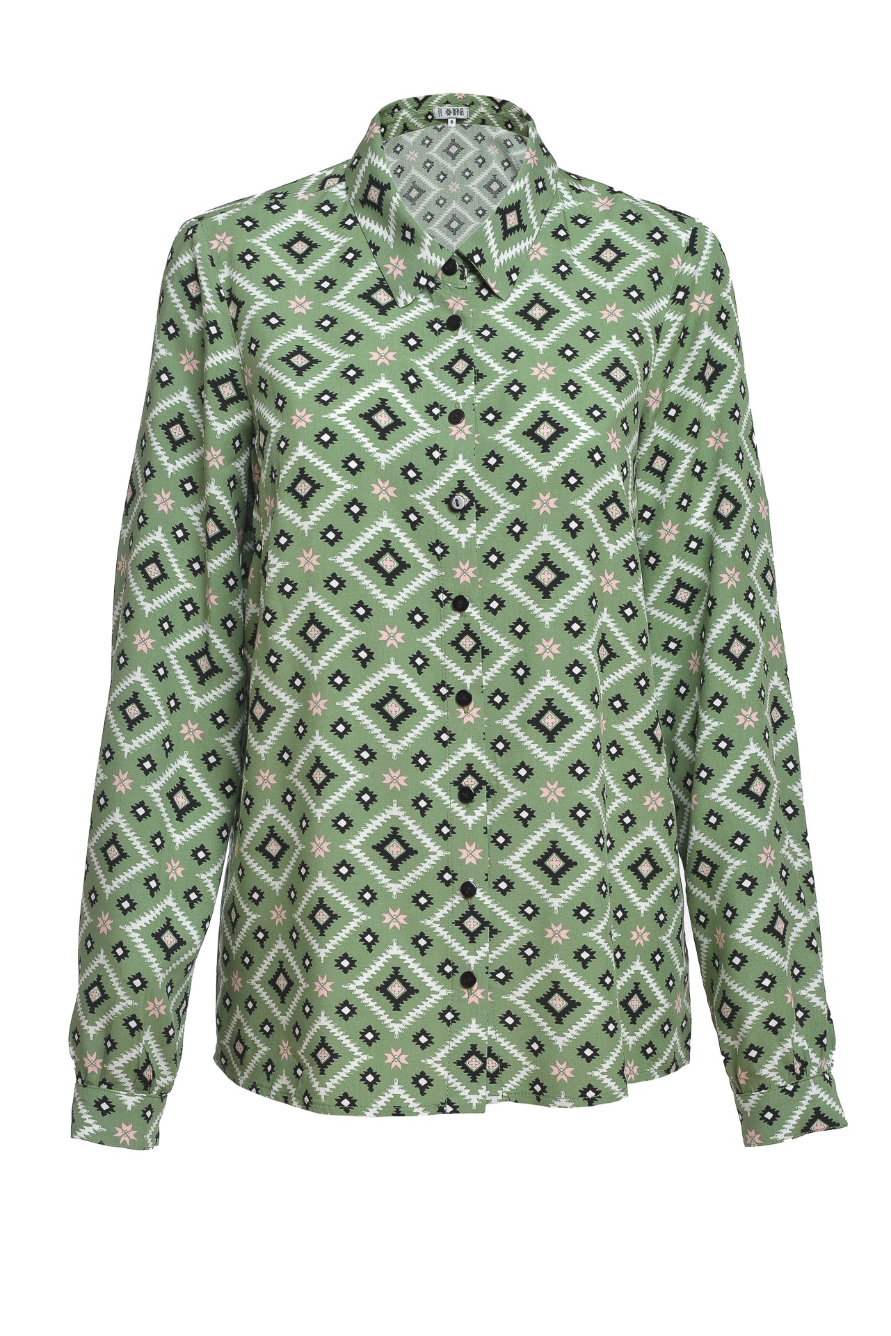 Cămașa verde măsliniu rombul vieții este confecționată din viscoză premium, imprimată digital cu motive tradiționale.