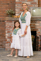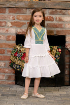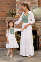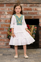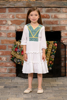 Rochița Viviana pentru fetițe este confecționată din pânză albă din bumbac și jacquard etnic țesut cu motive tradiționale.