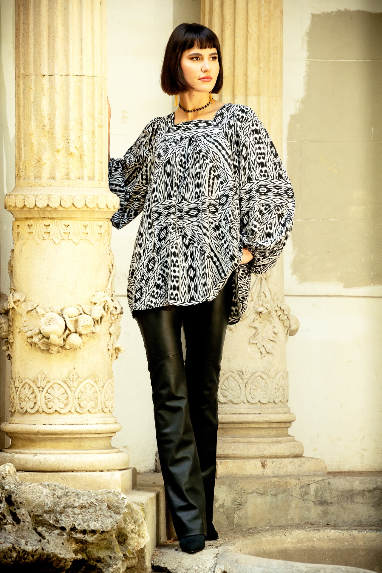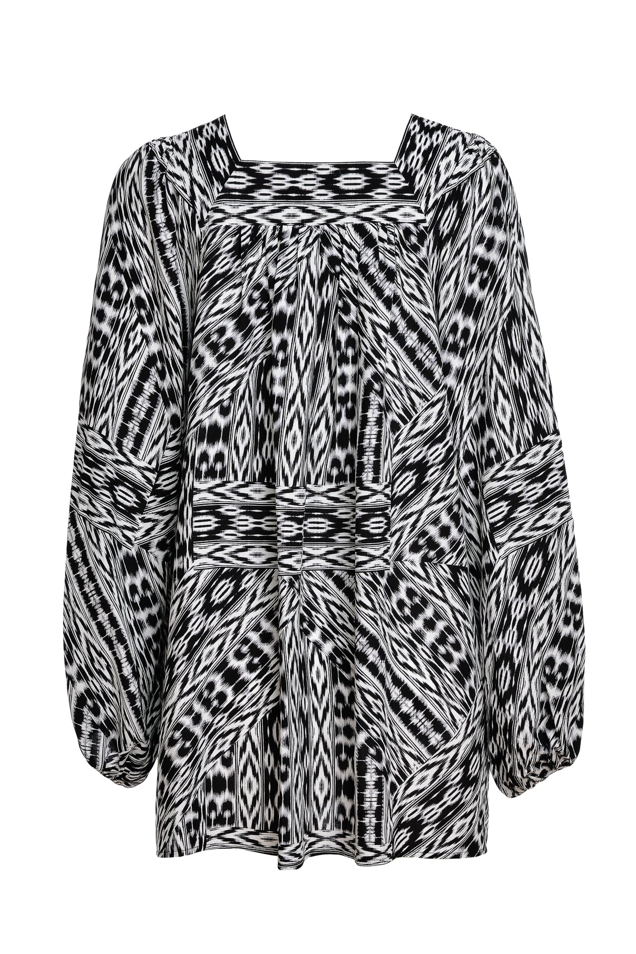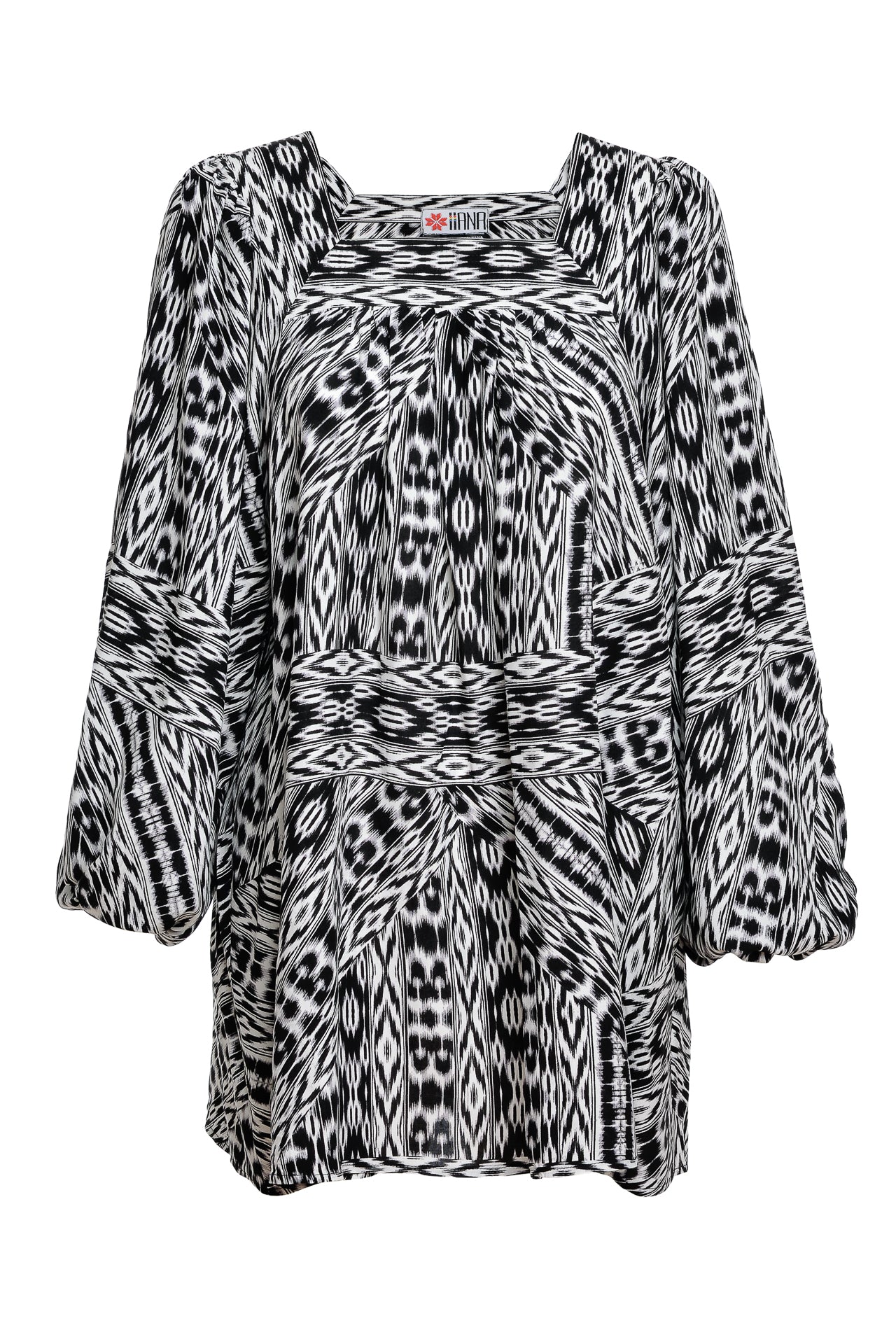 Bluza Darena alb negru este confecționată din vâscoză imprimată digital cu motive geometrice. Are un croi lejer, cu mâneci bufante. Decolteul pătrat este prezent atât în partea din față, cât și în cea din spate.