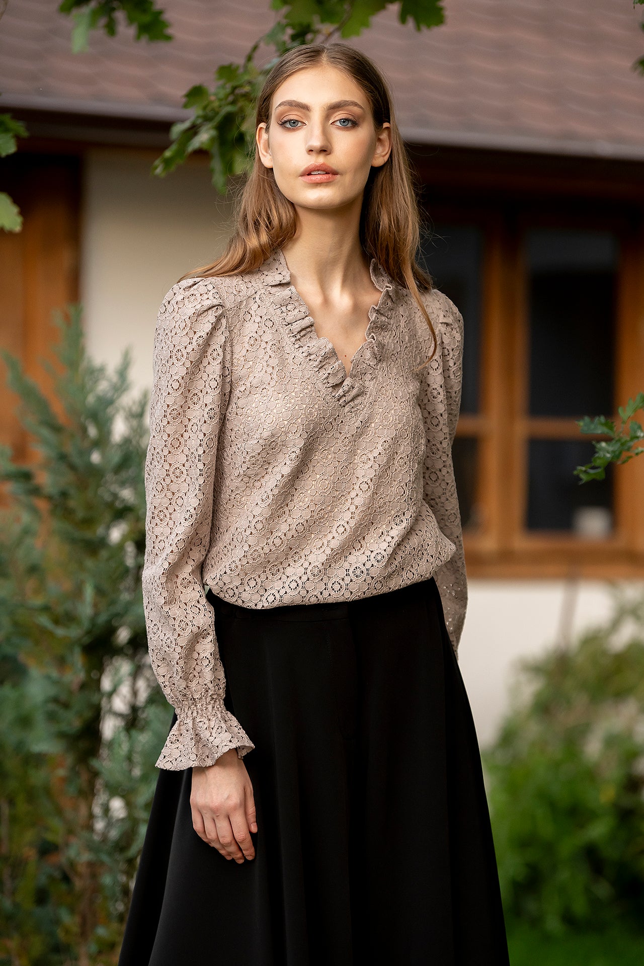 Bluza Ozana are un croi lejer, cu decolteul în anchior, paspoalat cu volan din dantelă.