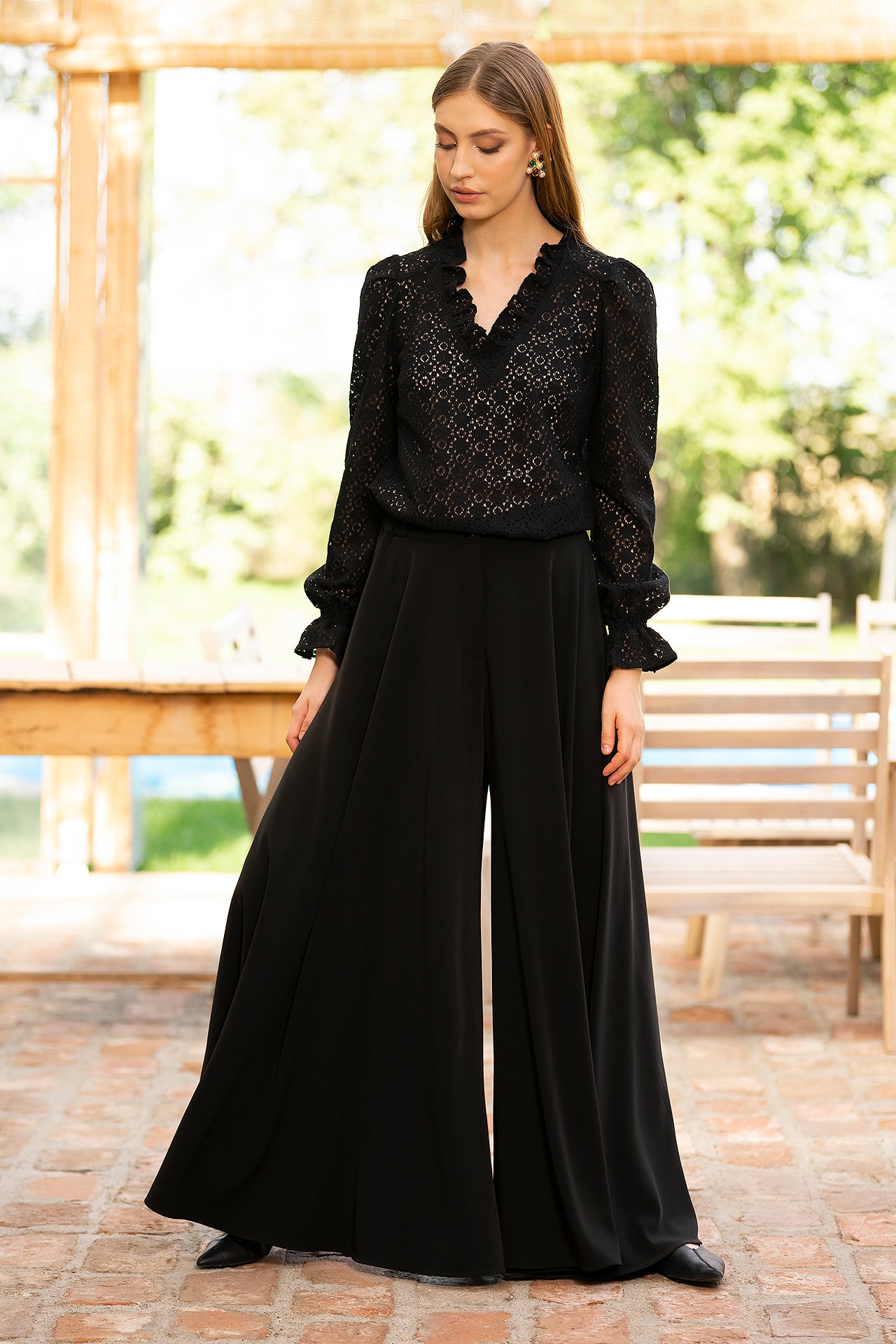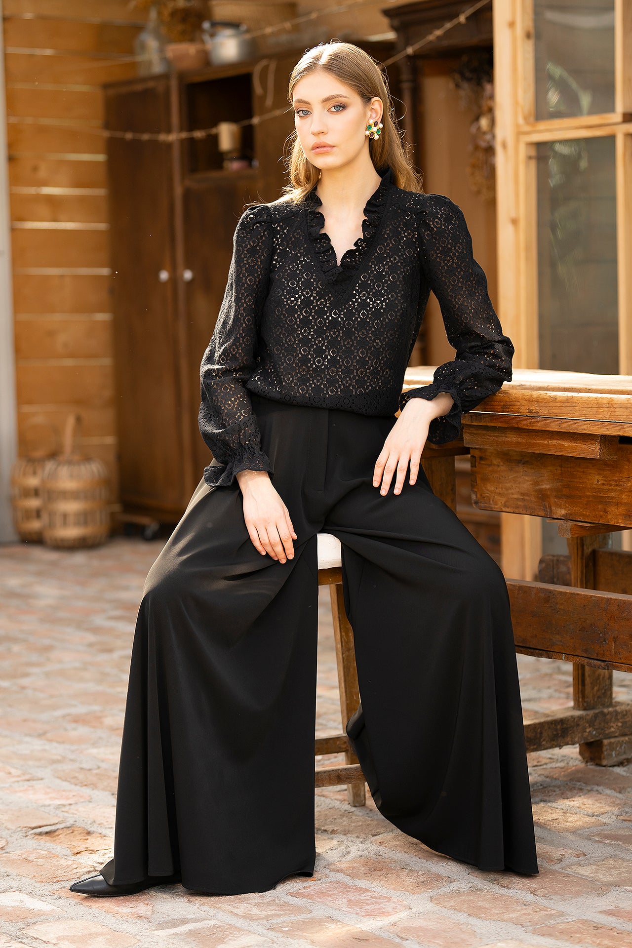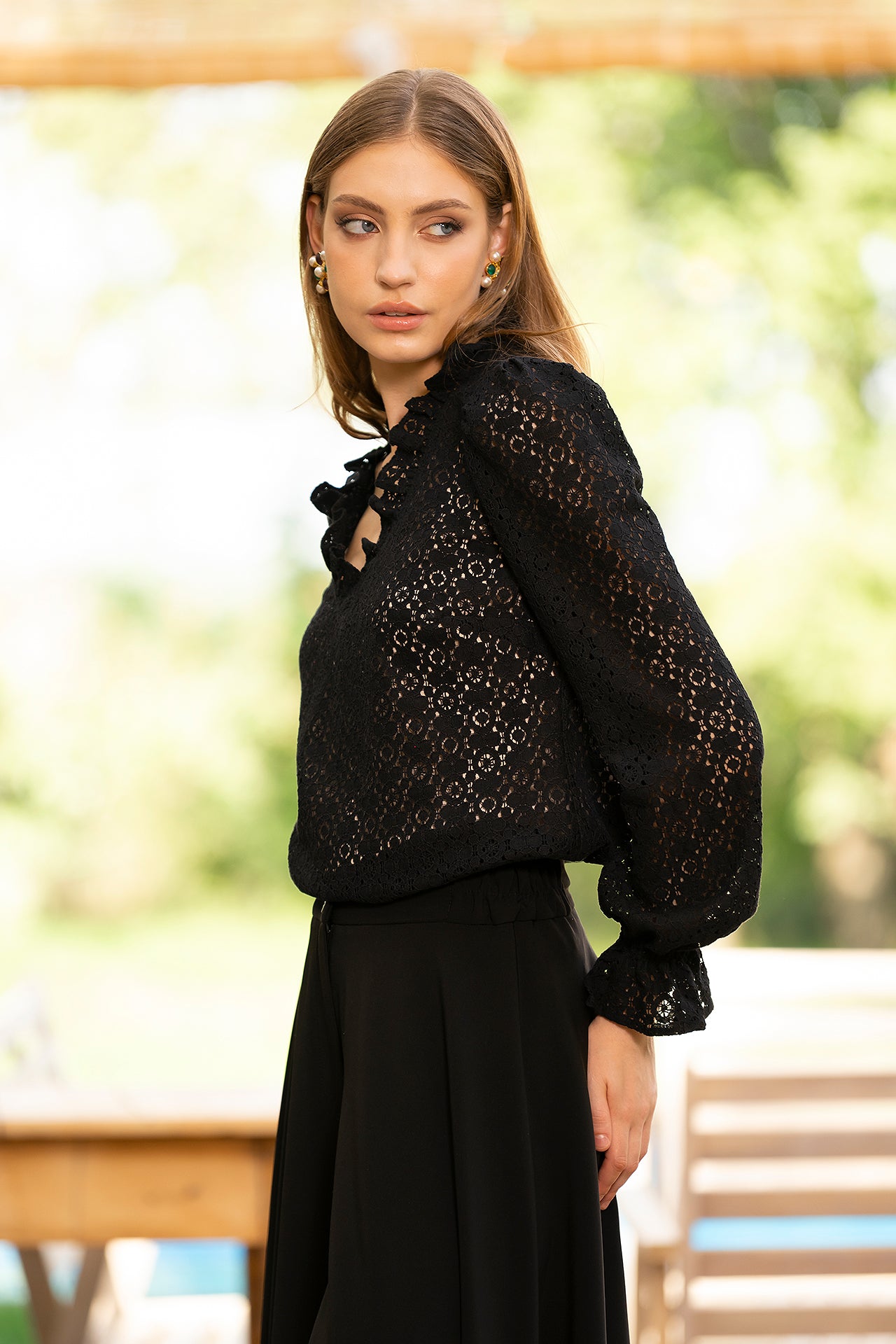 Bluza Irma are un croi lejer, cu decolteul în anchior, paspoalat cu volan din dantelă.
