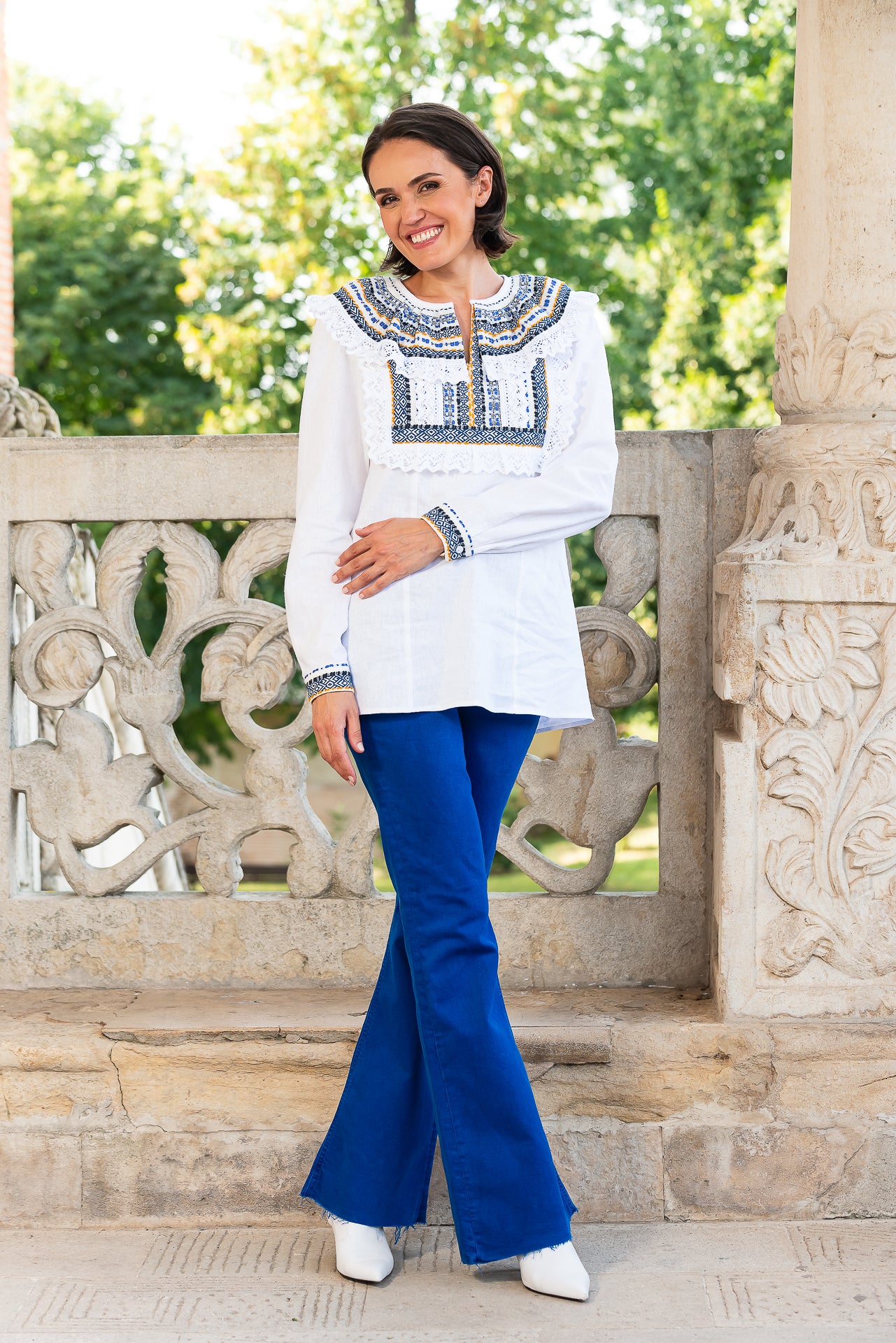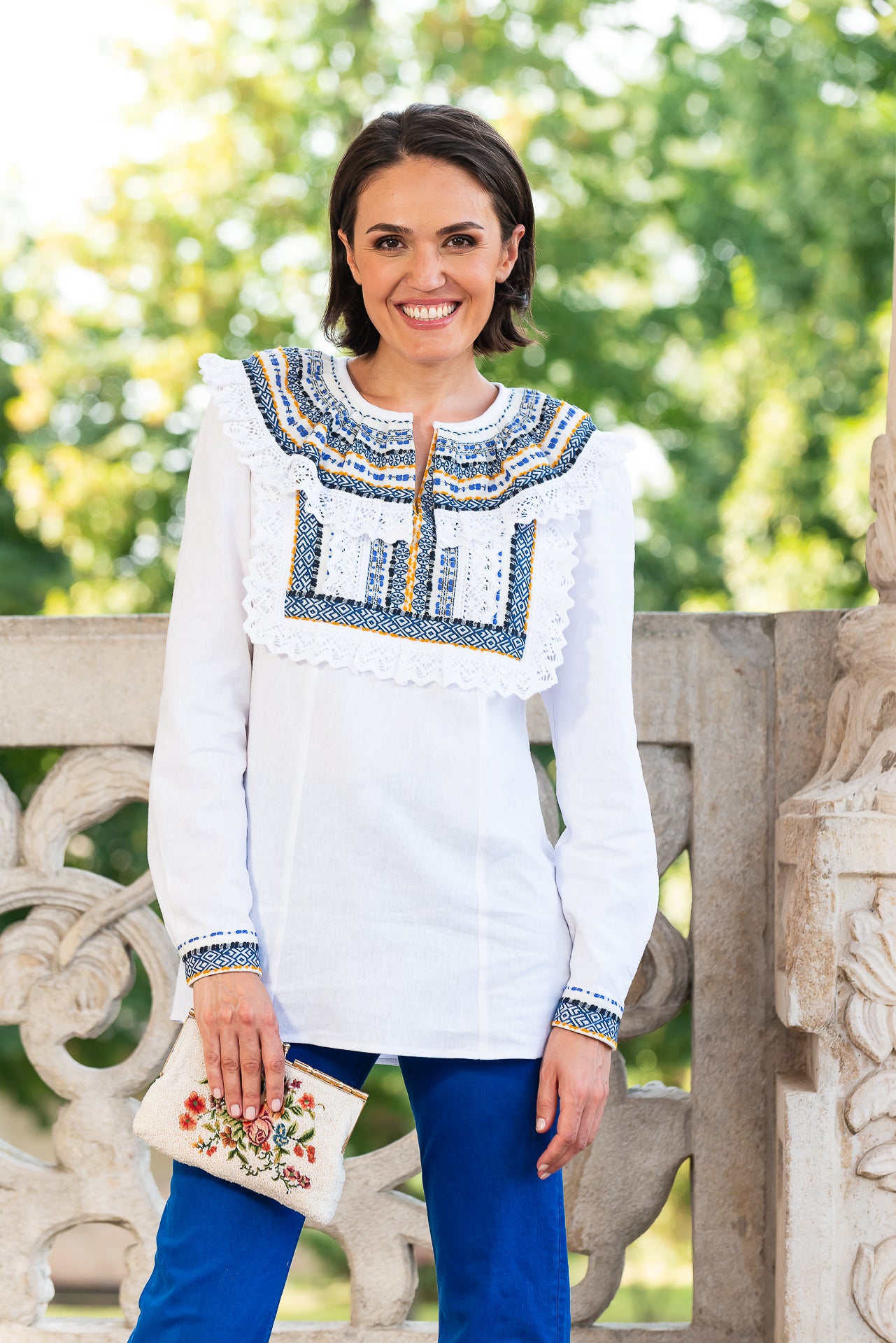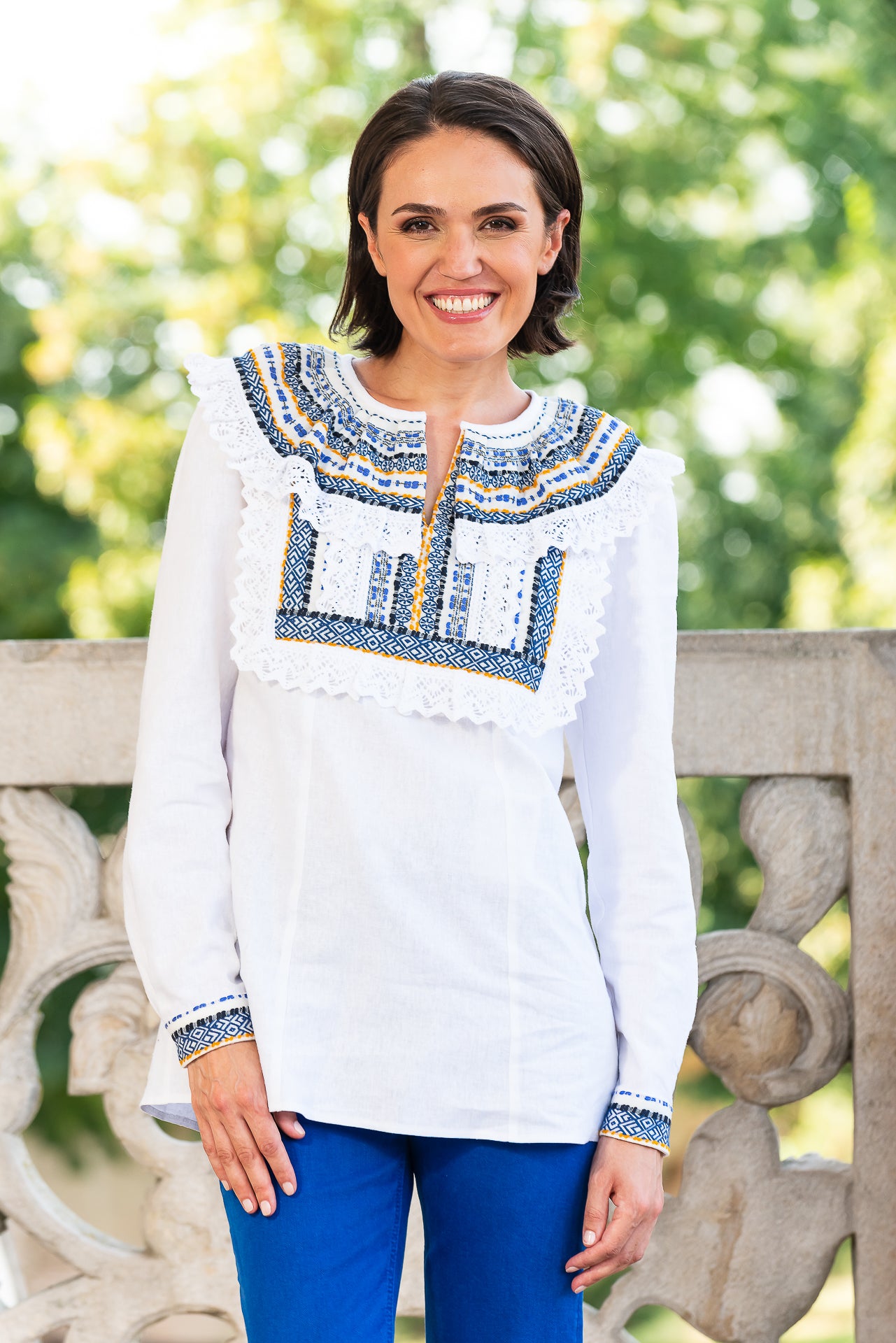 Cămașa Bihoreanca este confecționată din in cu manșetele, platca și gulerul generos din jacquard etnic țesut, paspoalat cu dantelă tradițională  de bumbac.