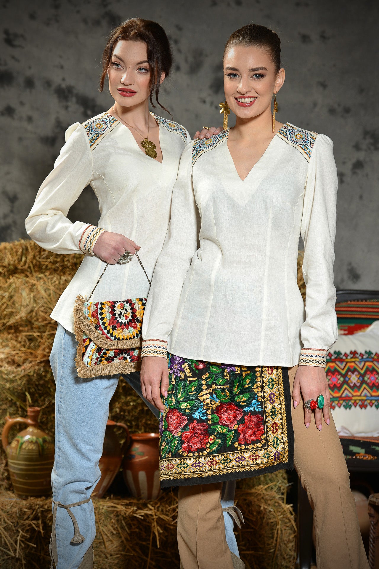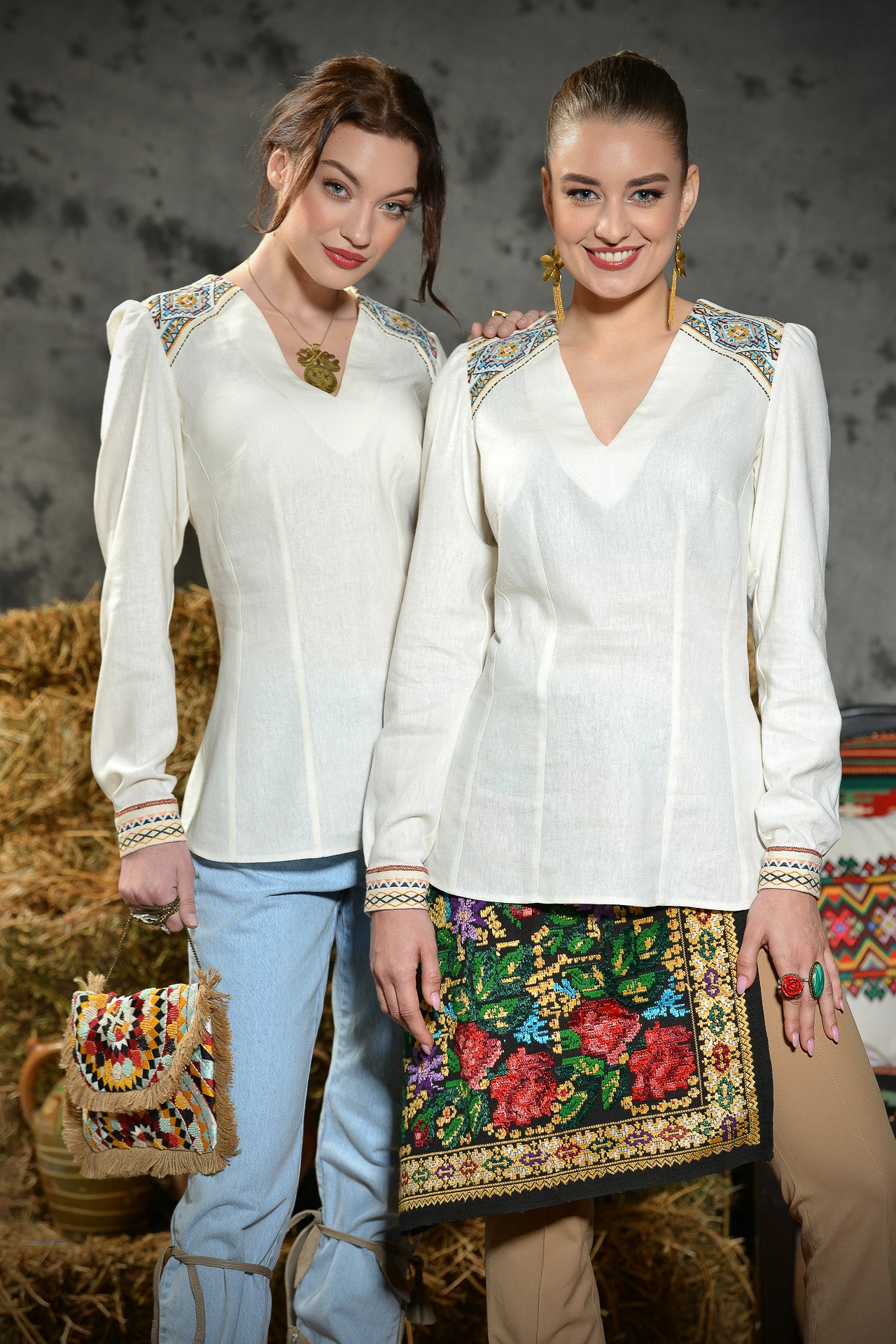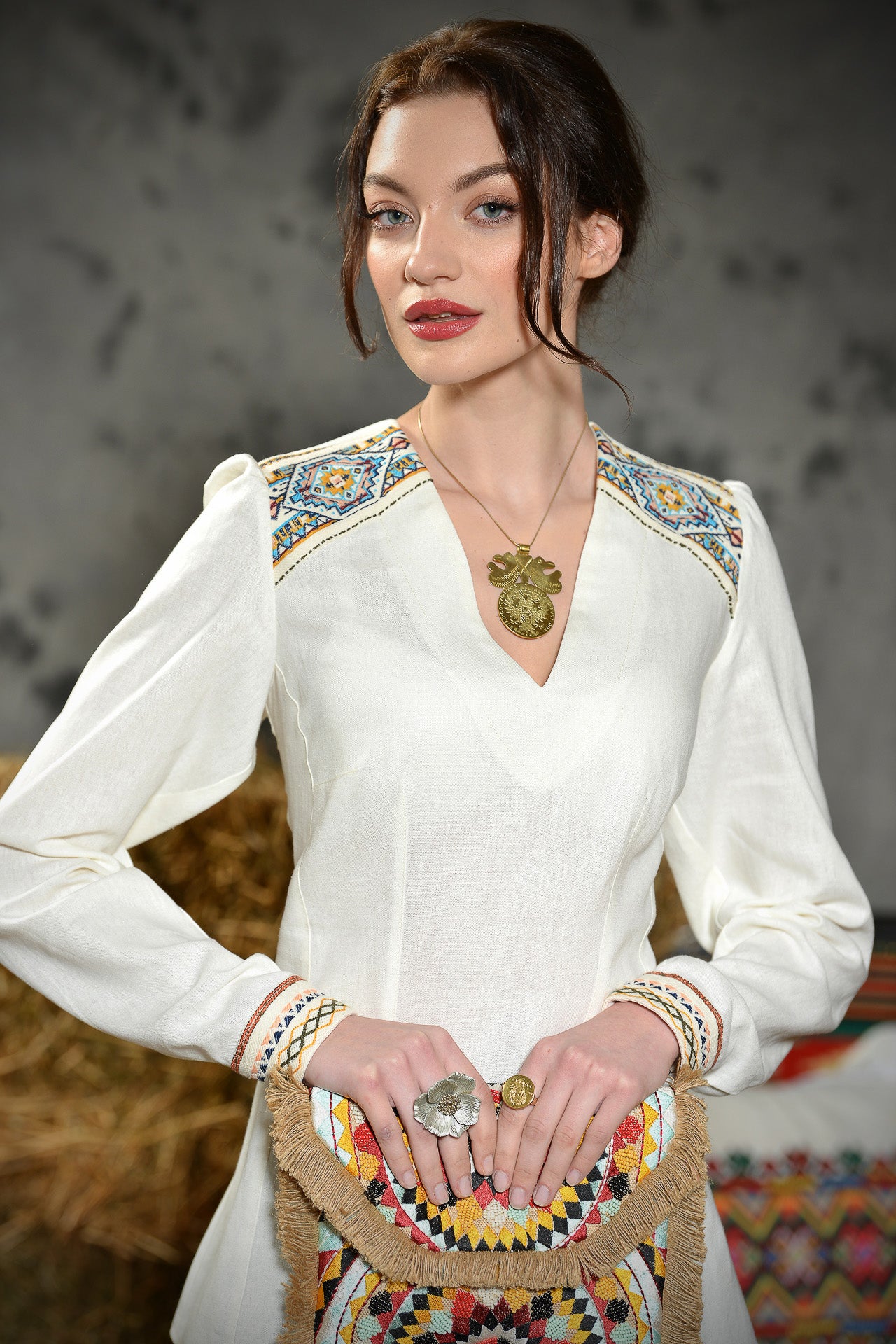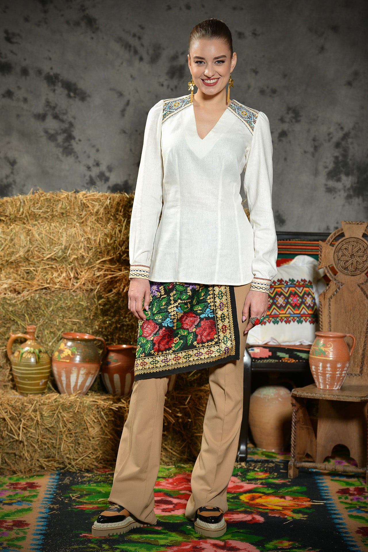 Camașa are un tipar feminin, cu decoletul în anchior și o