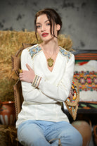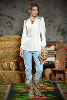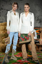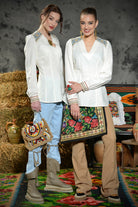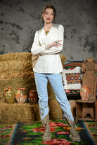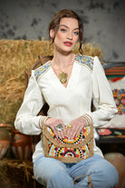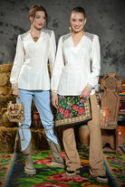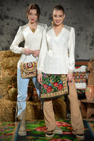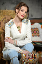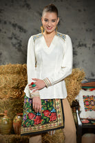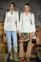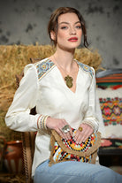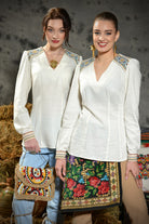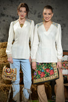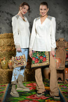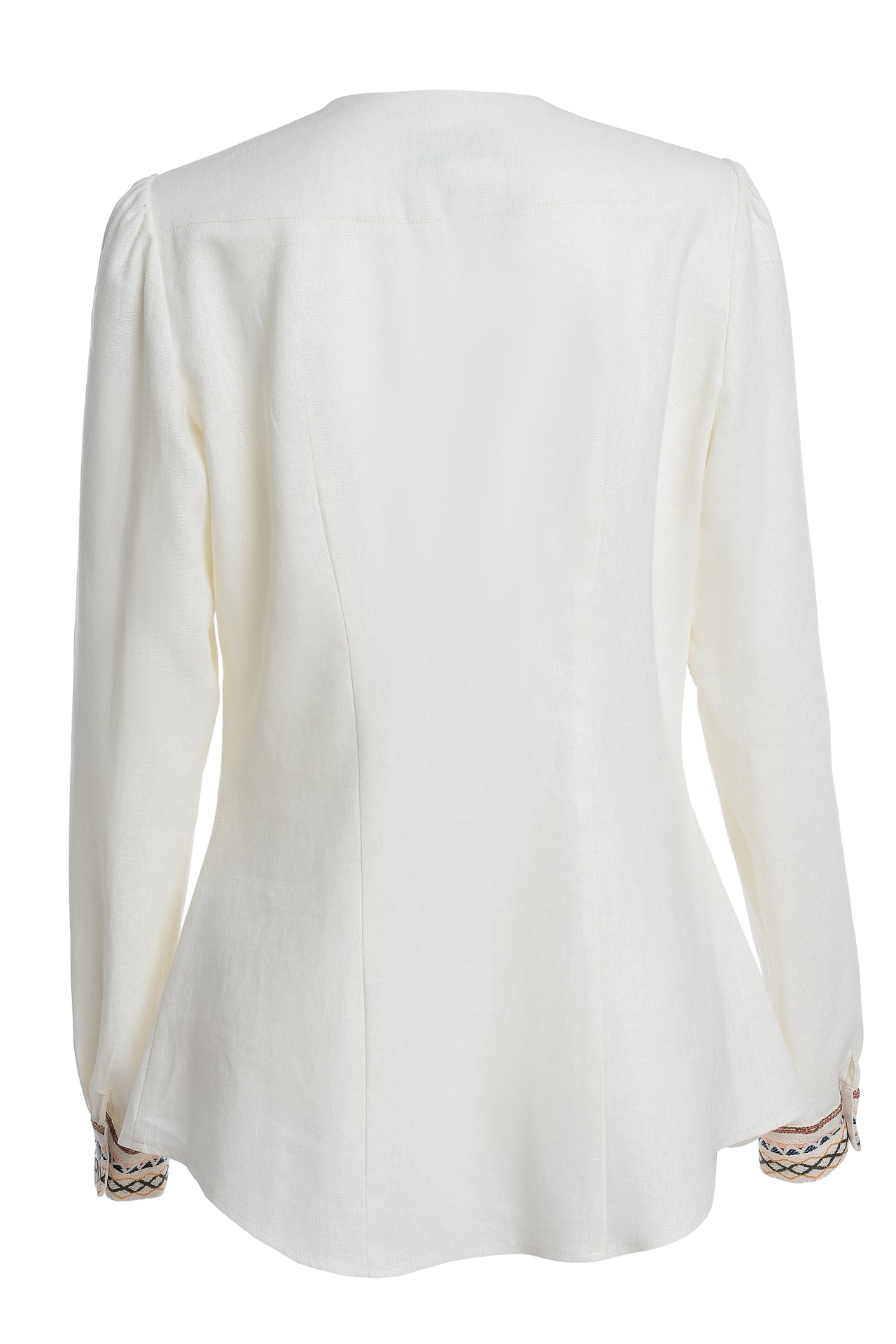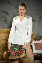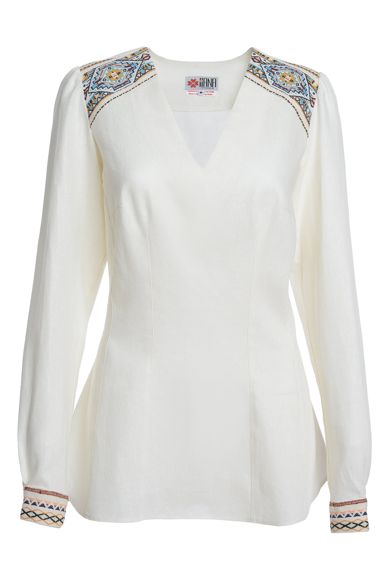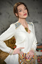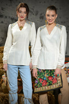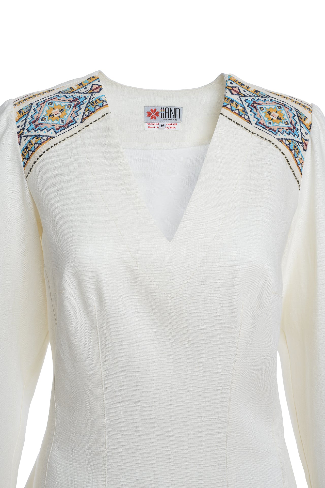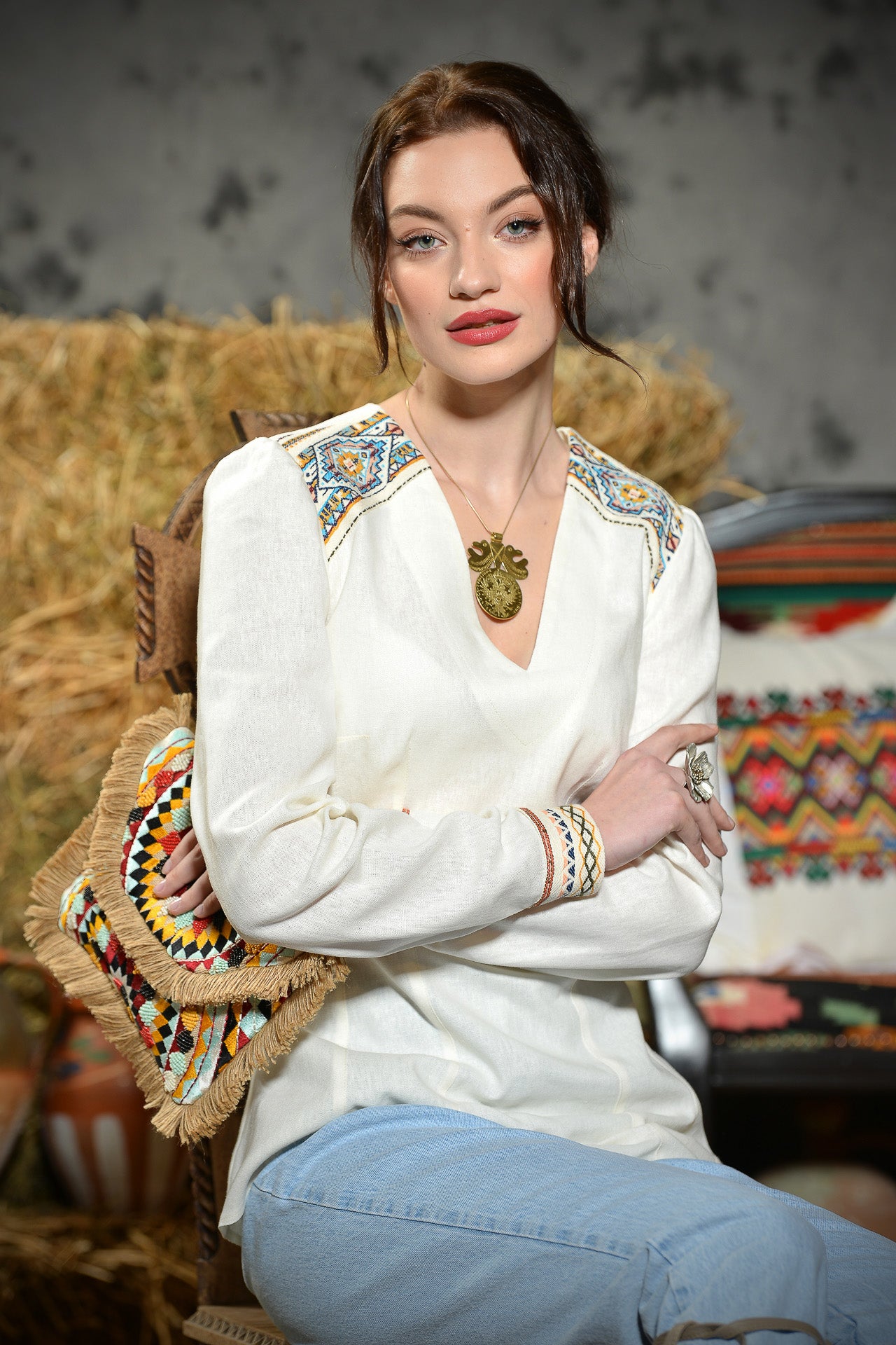 Camașa are un tipar feminin, cu decoletul în anchior și o