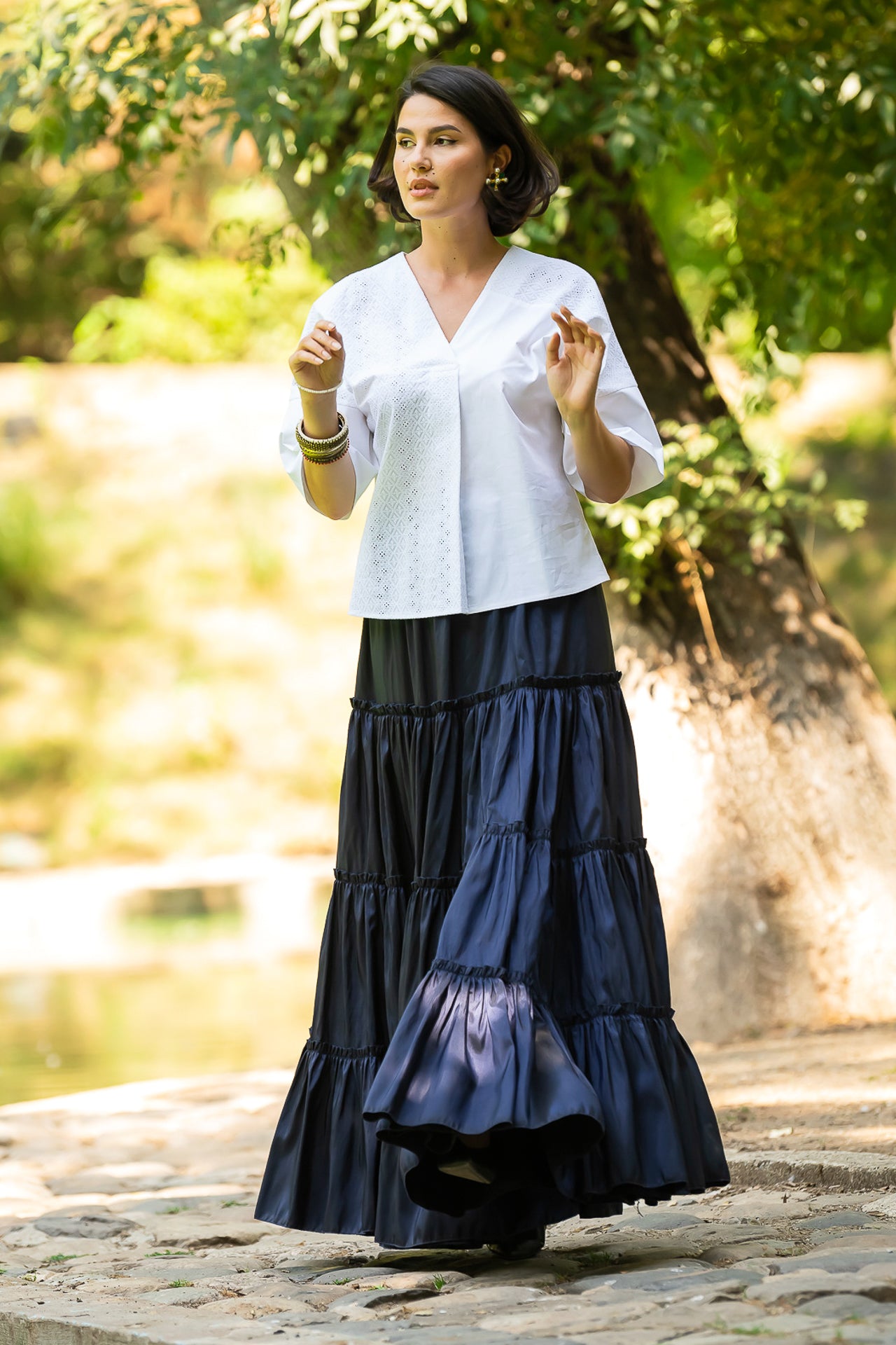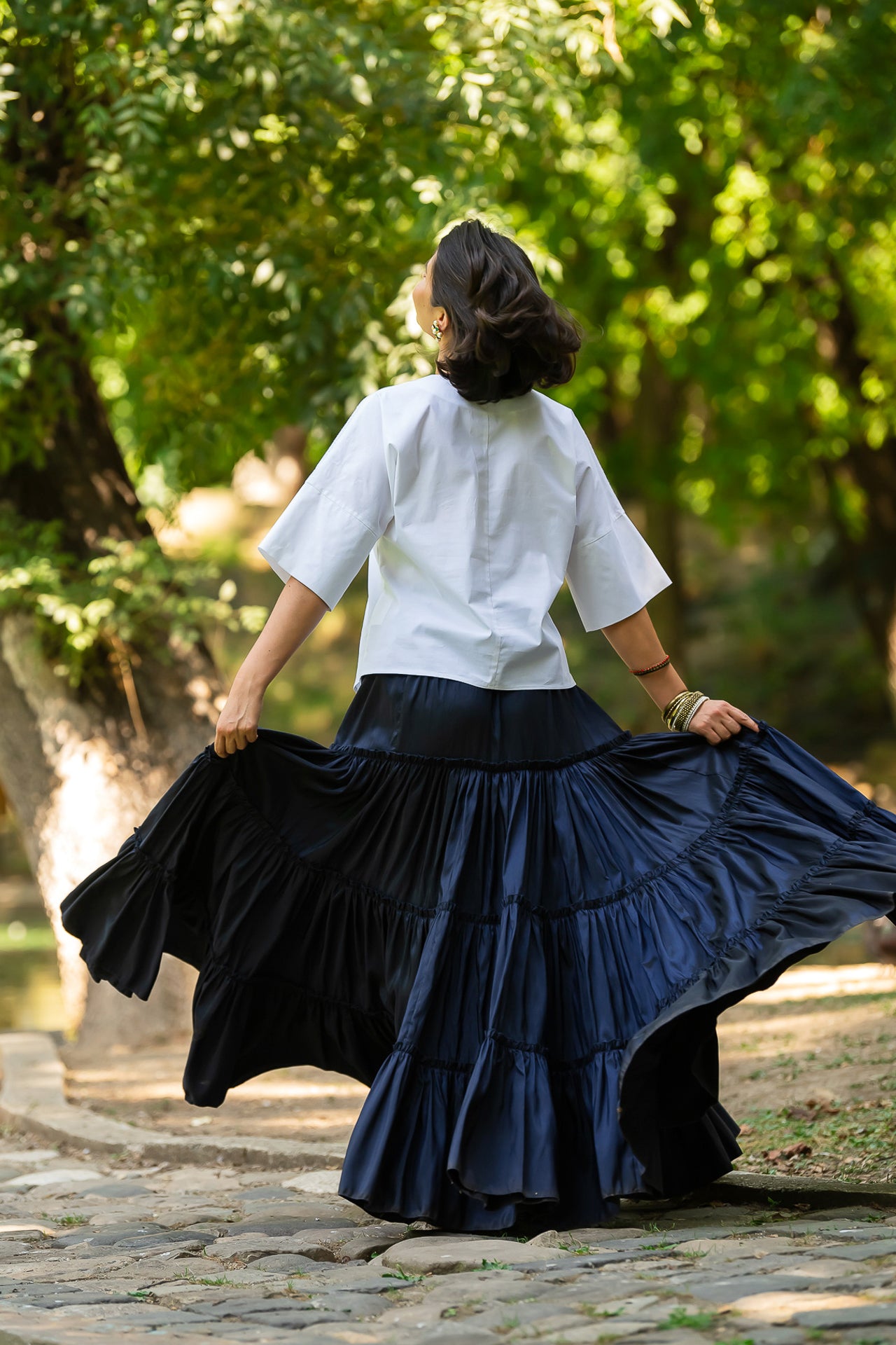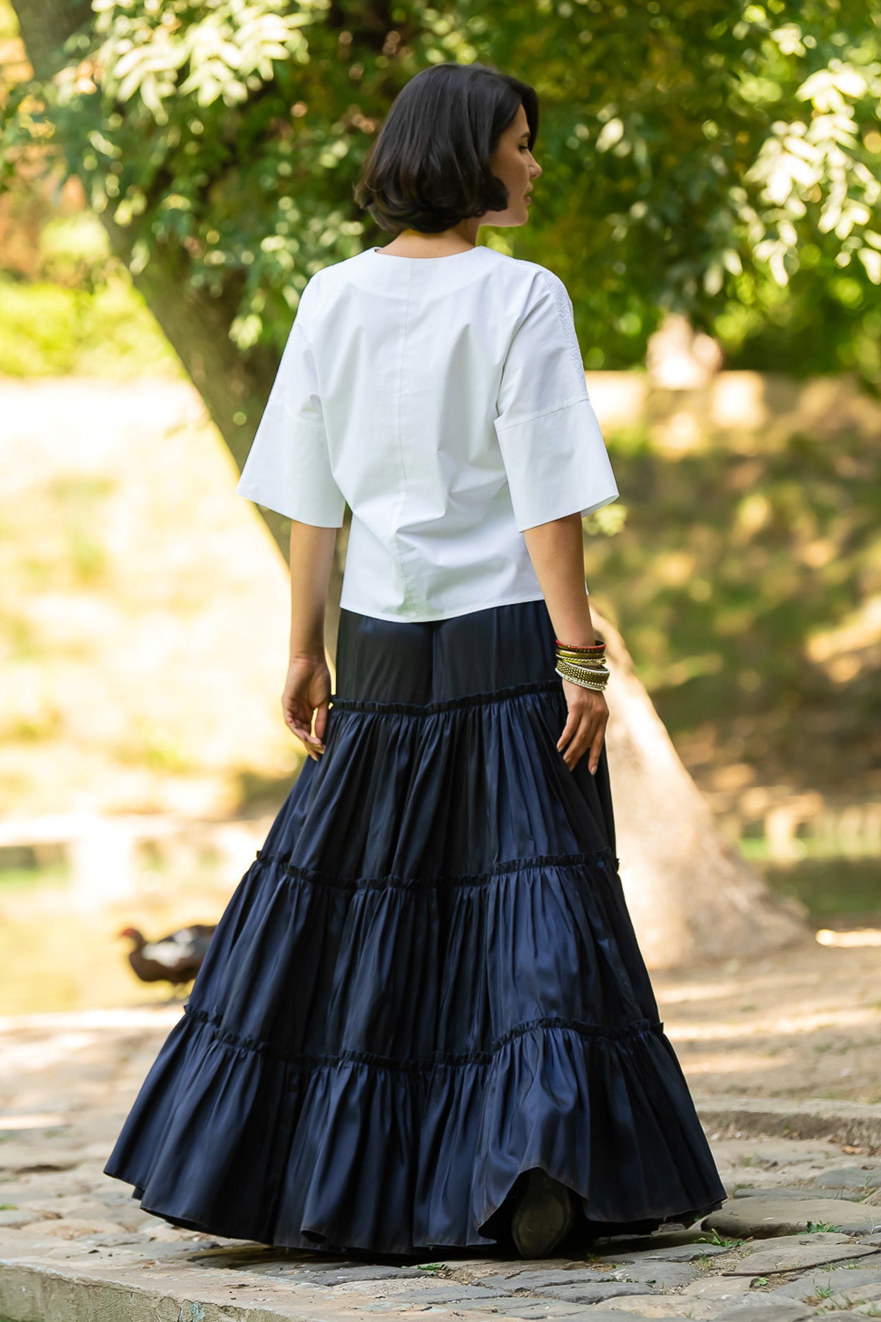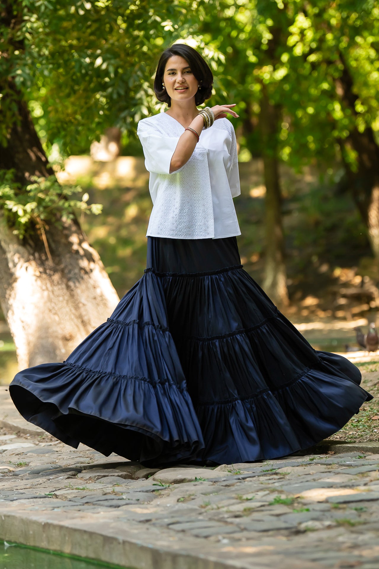 Fusta este confecționată din tafta subțire bleumarin cu  betelie elastică în talie.