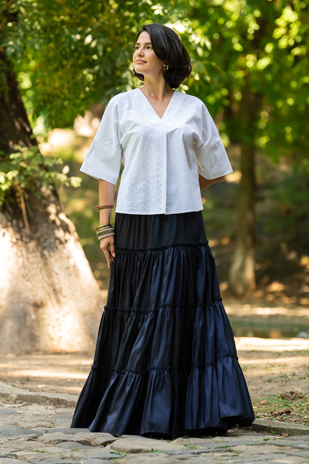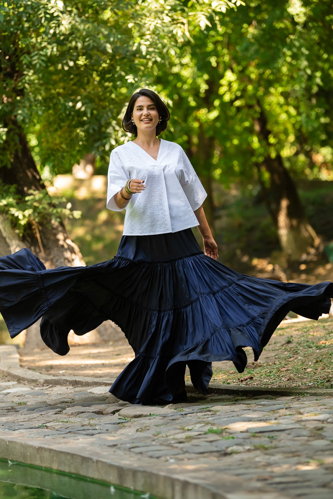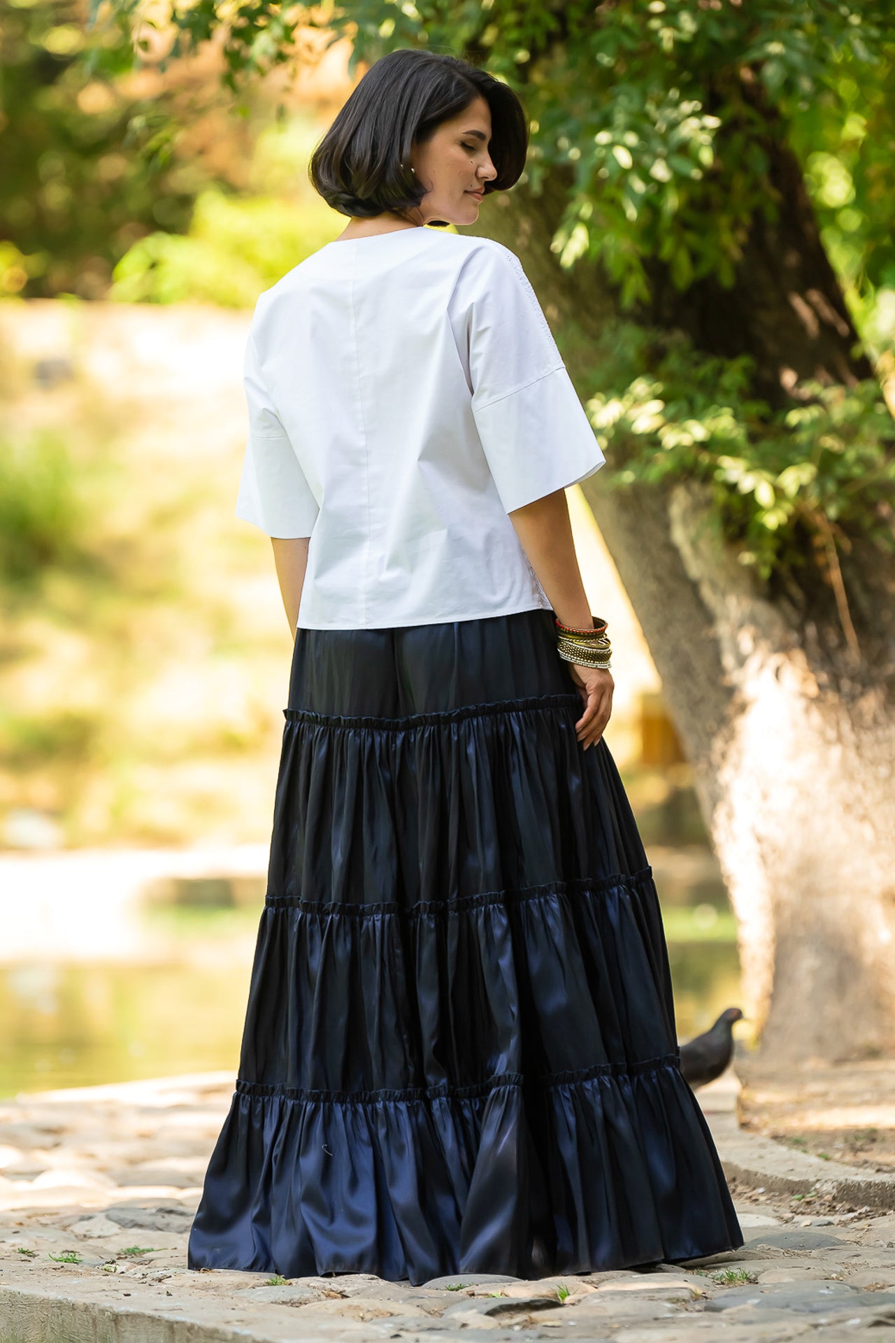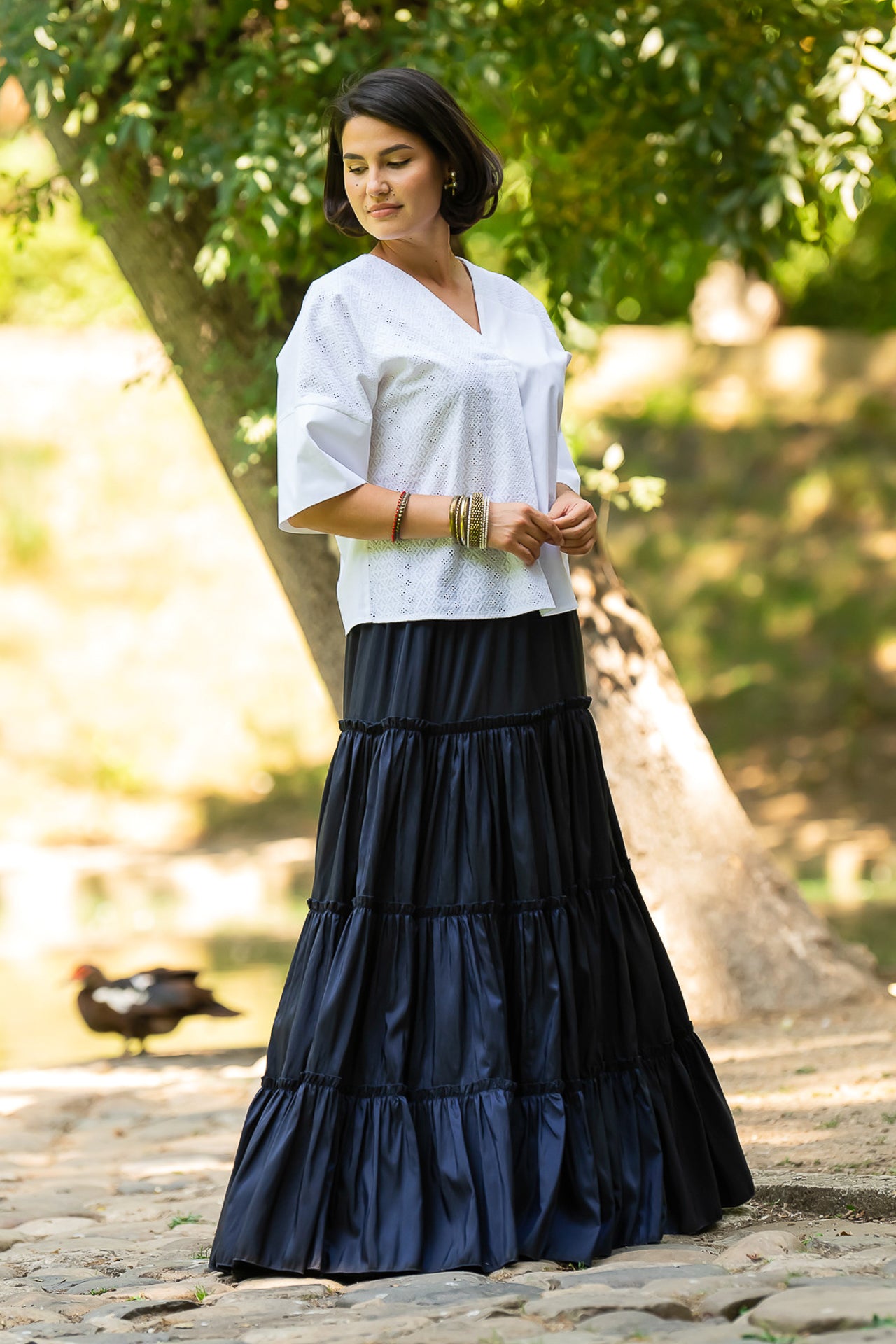 Fusta este confecționată din tafta subțire bleumarin cu  betelie elastică în talie.