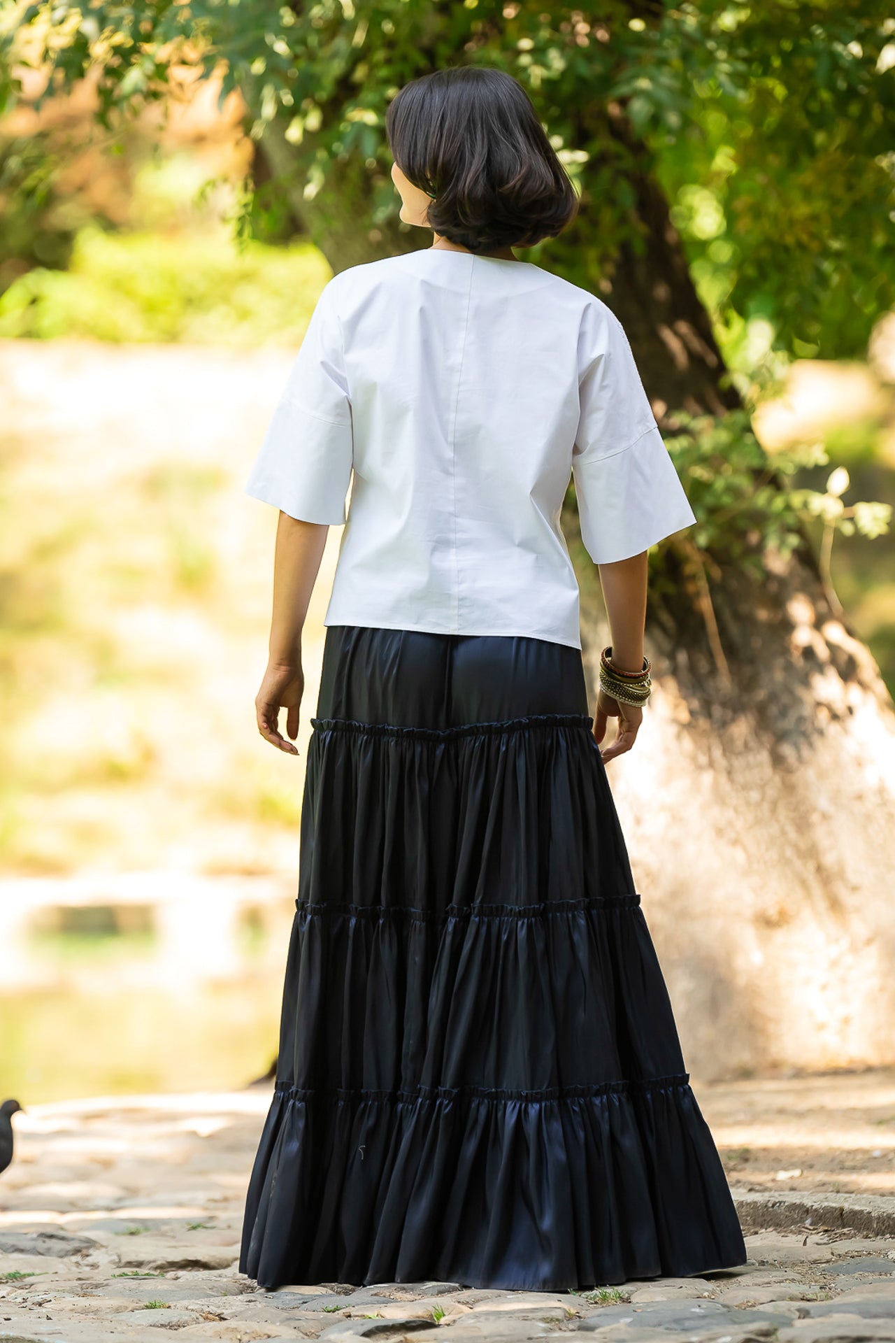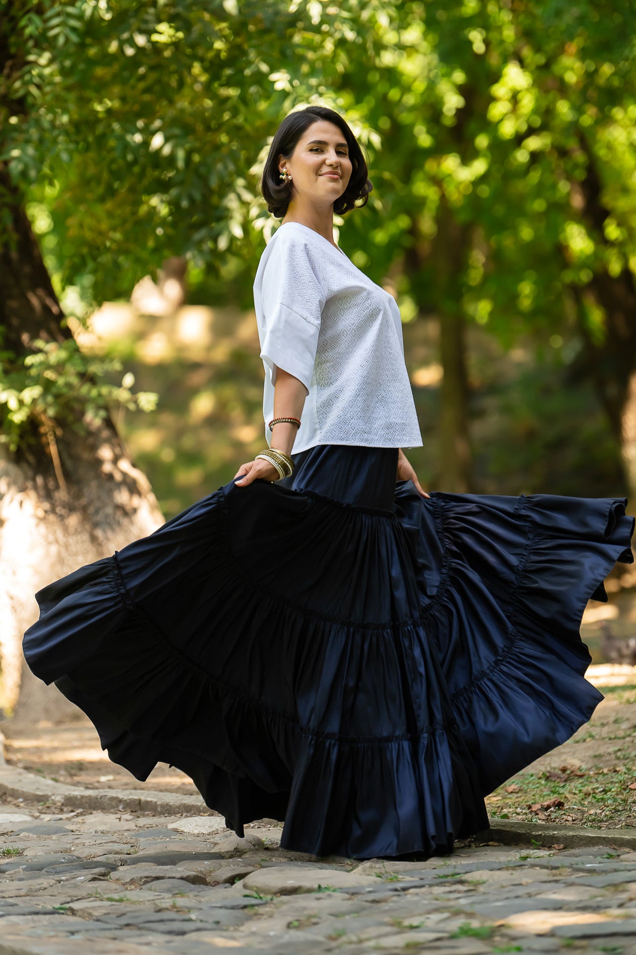 Fusta are 3 volane foarte bogate și este perfectă că bază pentru ținutele lejere.