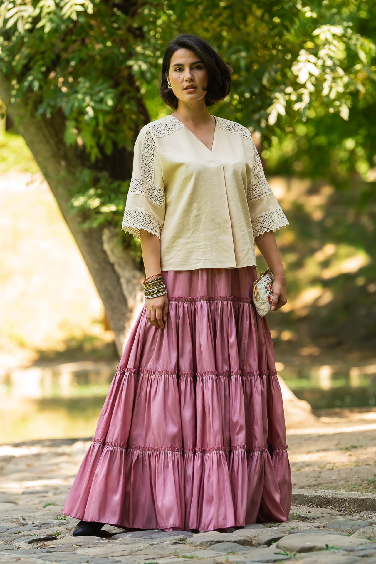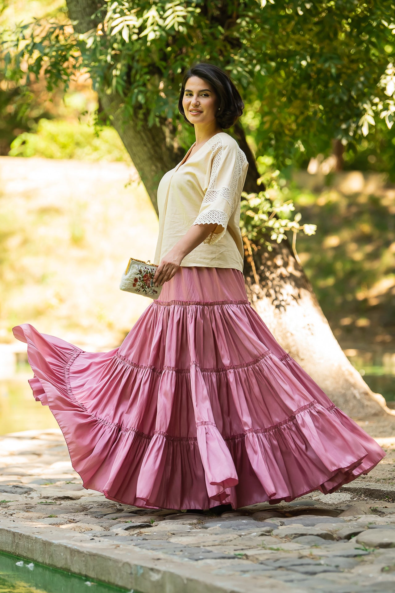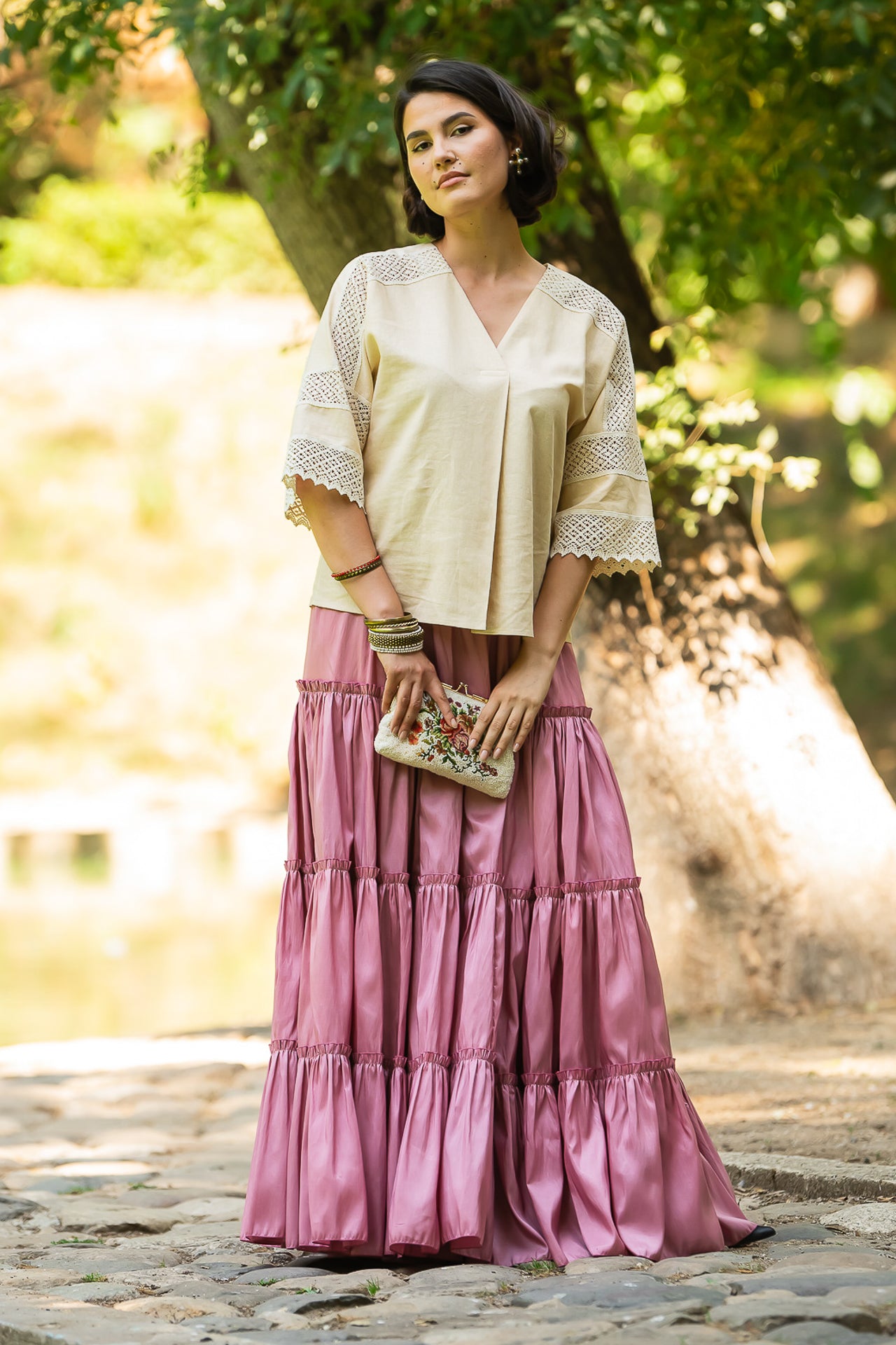 Fusta este confecționată din tafta subțire roz pudrat cu  betelie elastică în talie.