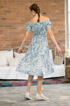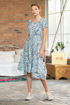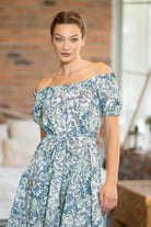 Rochia este confecționată din bumbac imprimat digital cu motive florale albastre.