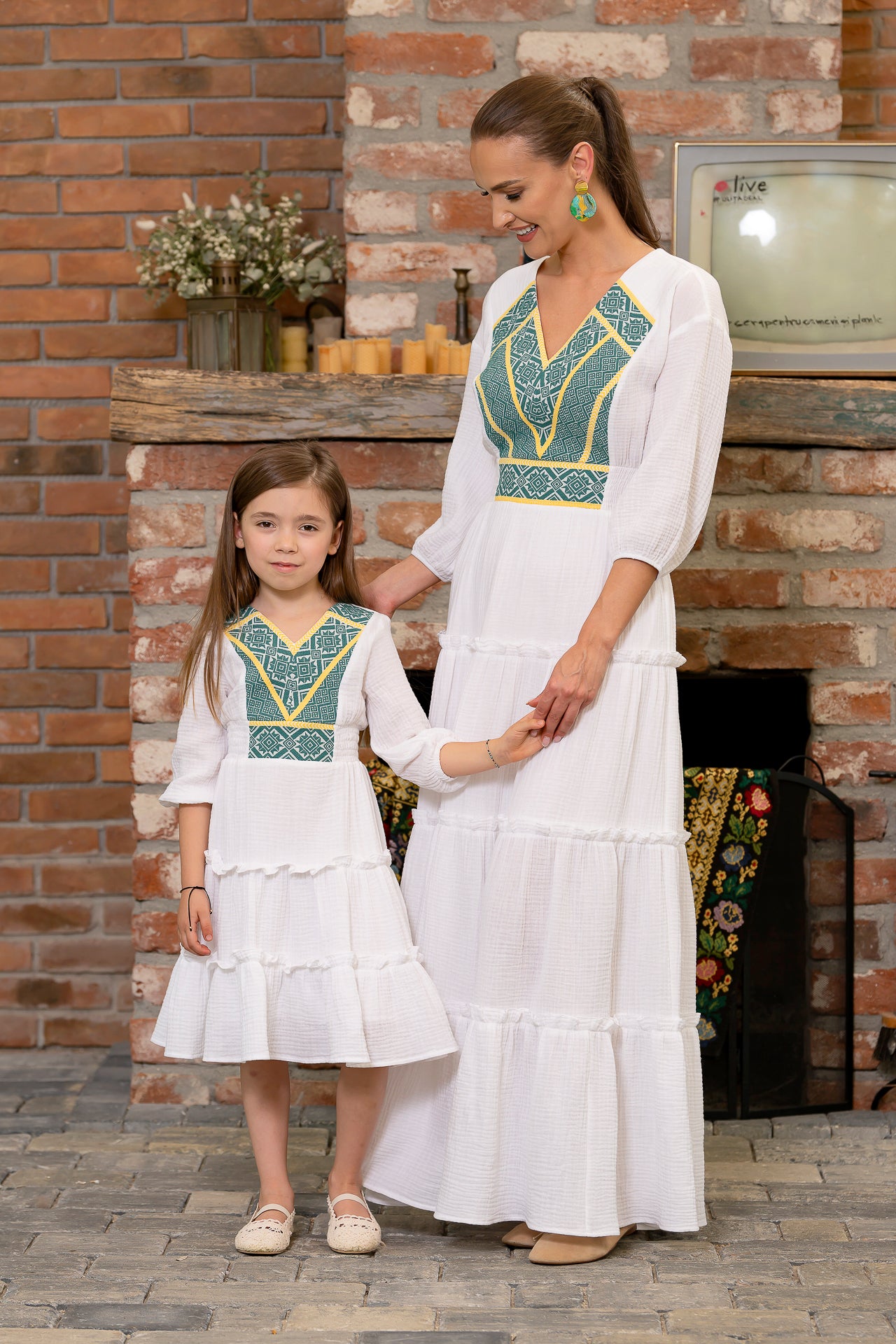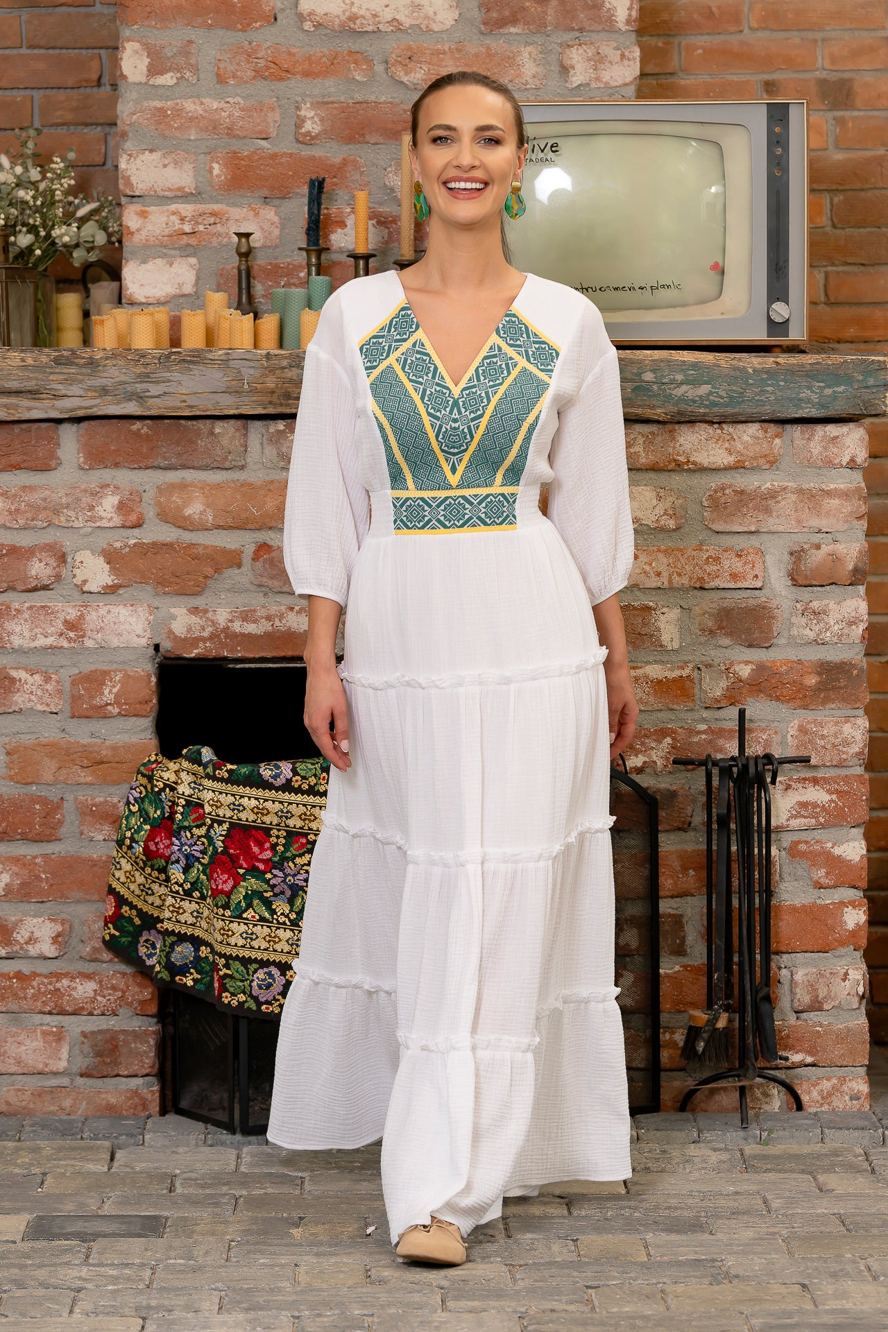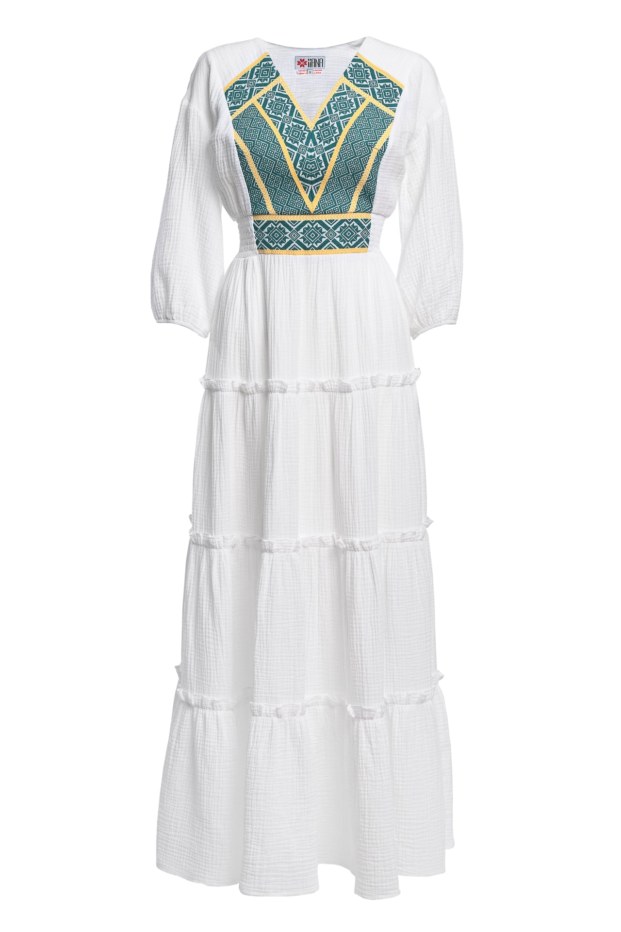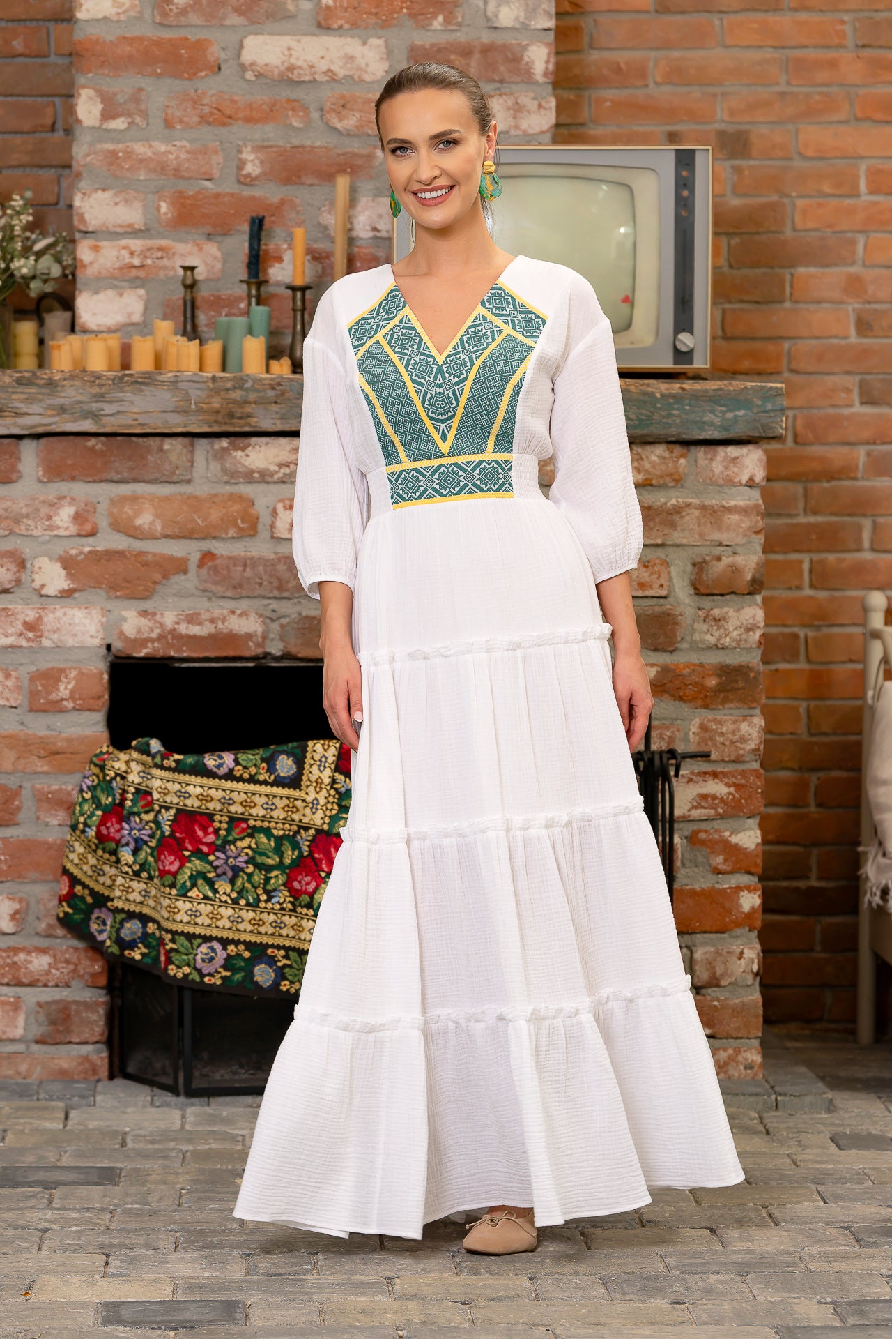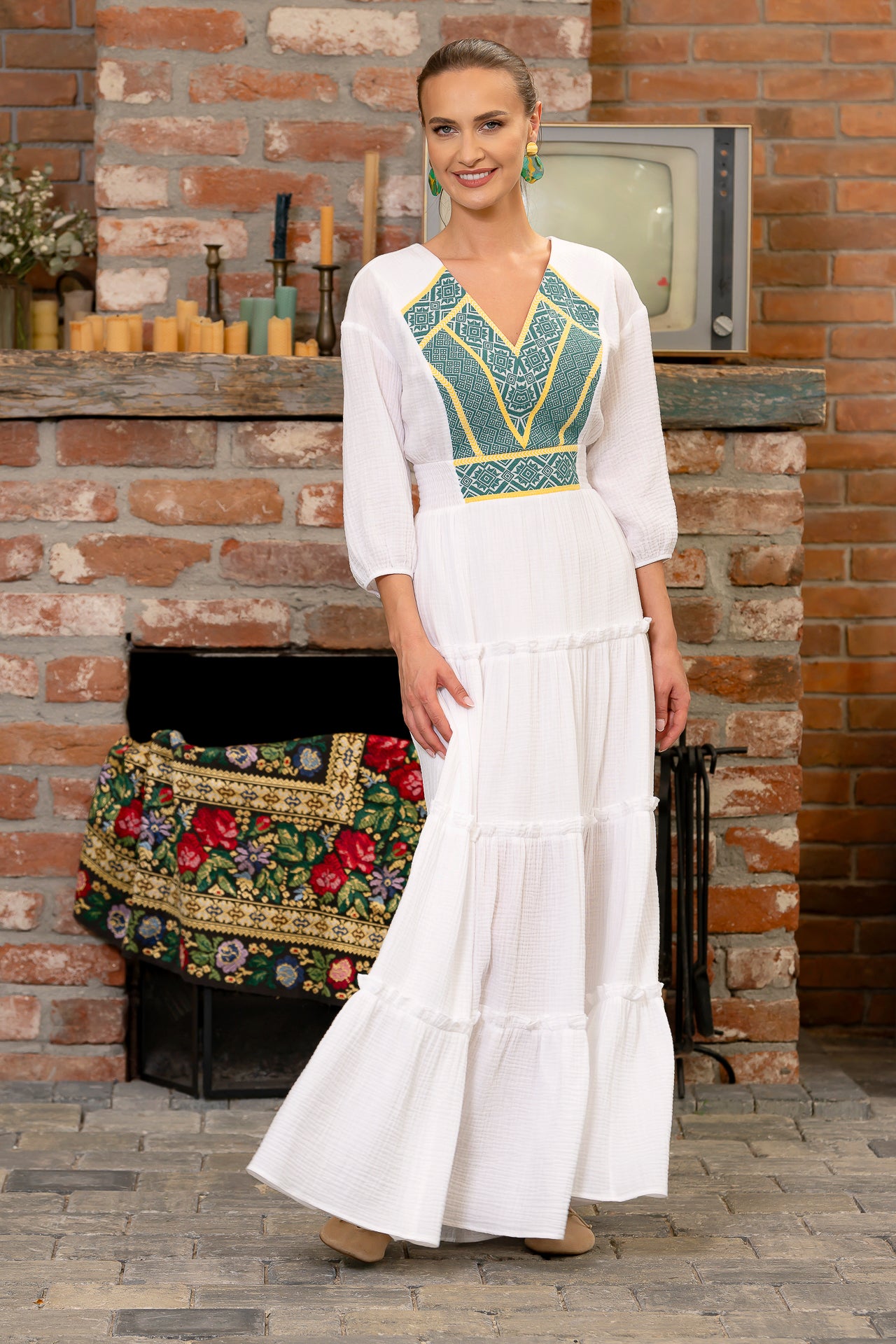 Rochia Viviana este confecționată din pânză topită de bumbac și jacquard țesut cu motive tradiționale.