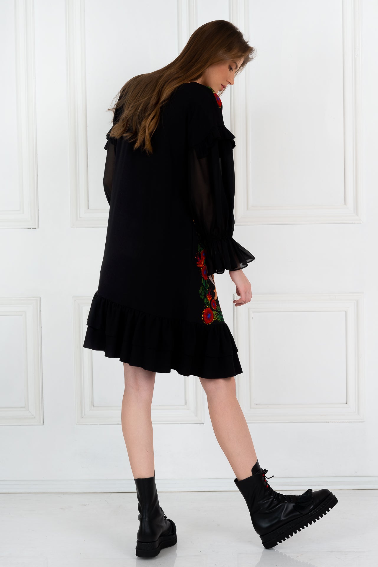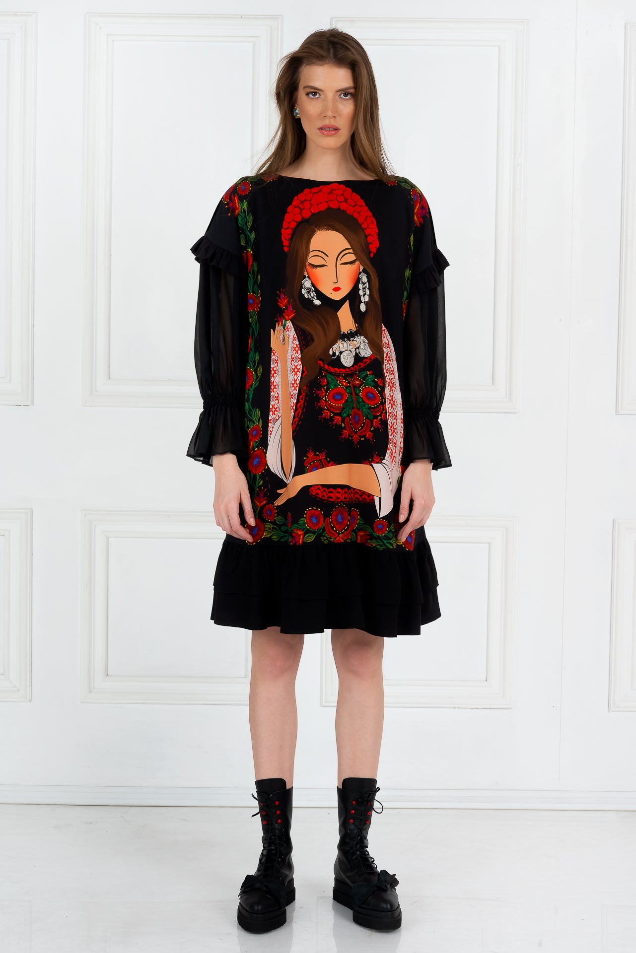 Rochia Bistrițeanca este confecționată din viscoză premium, imprimată digital și voal "georgette" negru.