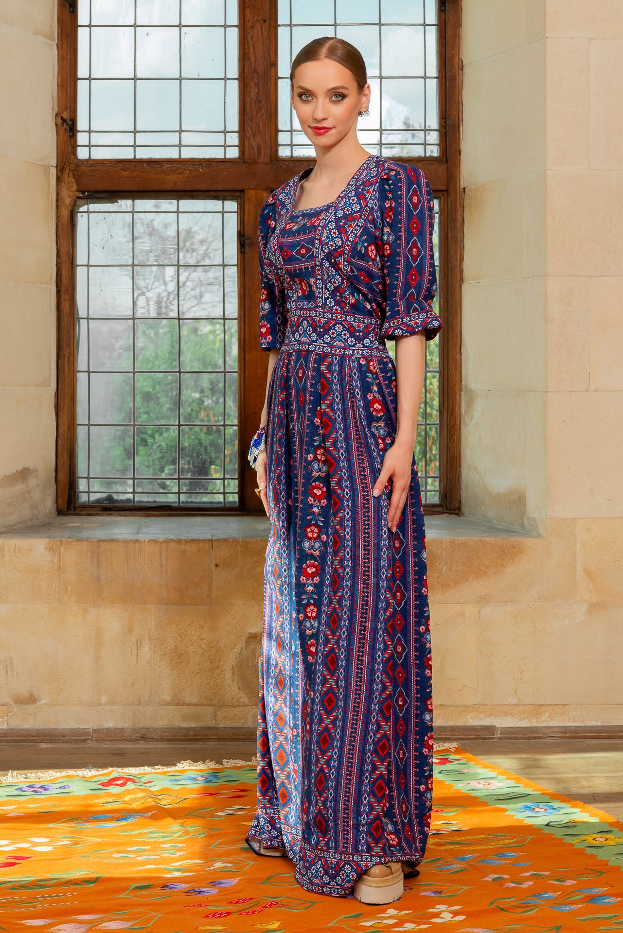 Rochia bleumarin lungă Boho Chic este confecționată din viscoză imprimată digital cu motive tradiționale românești.