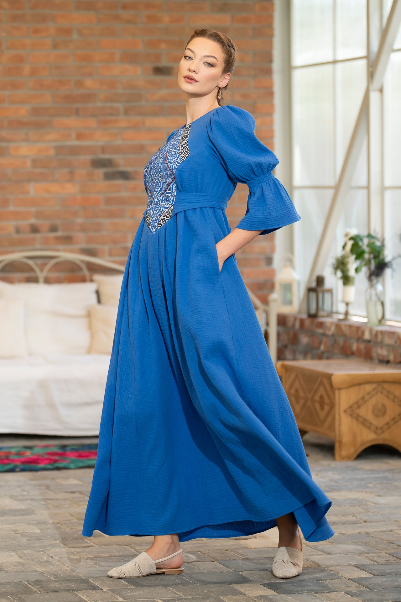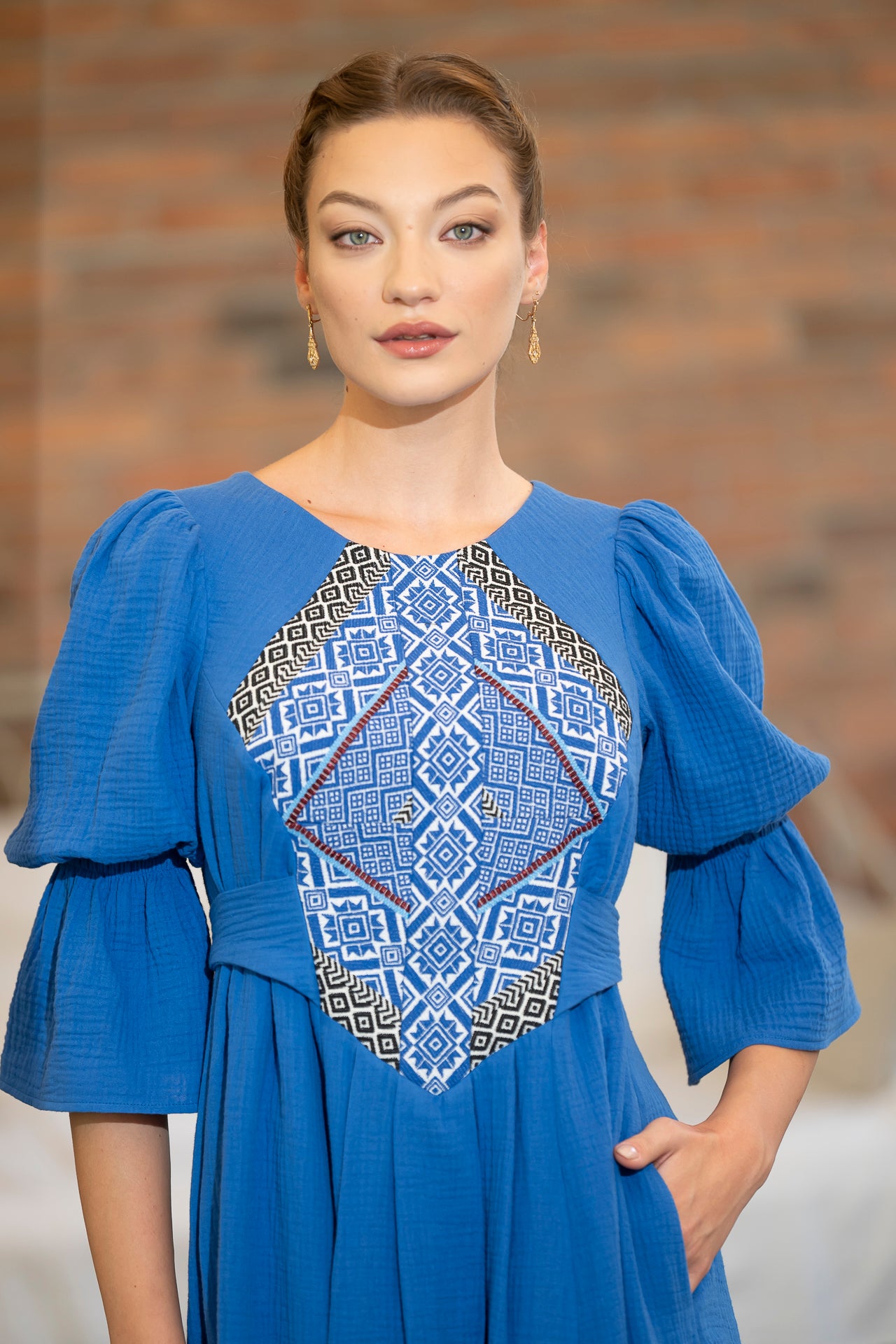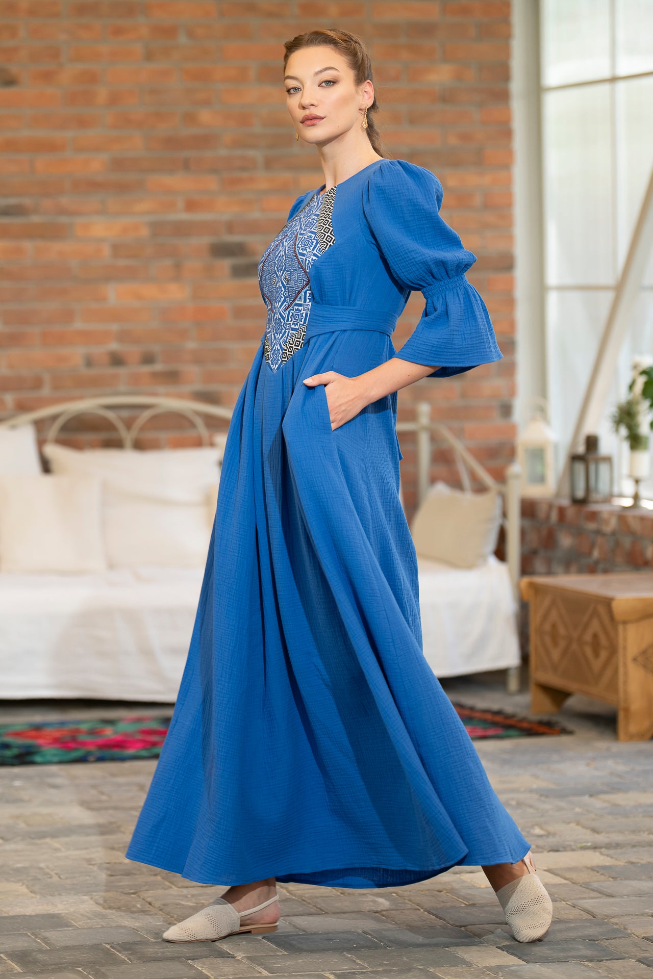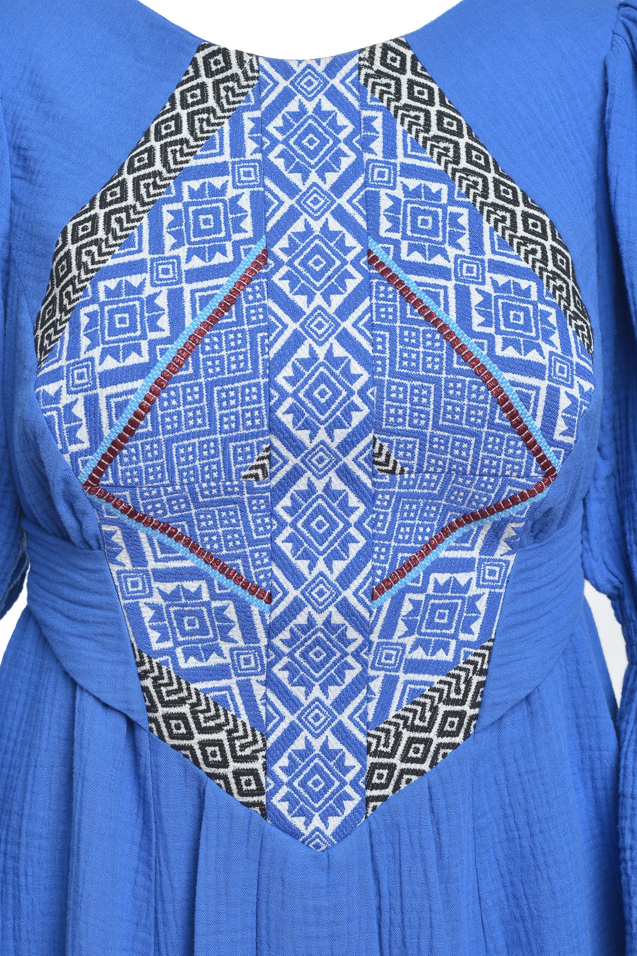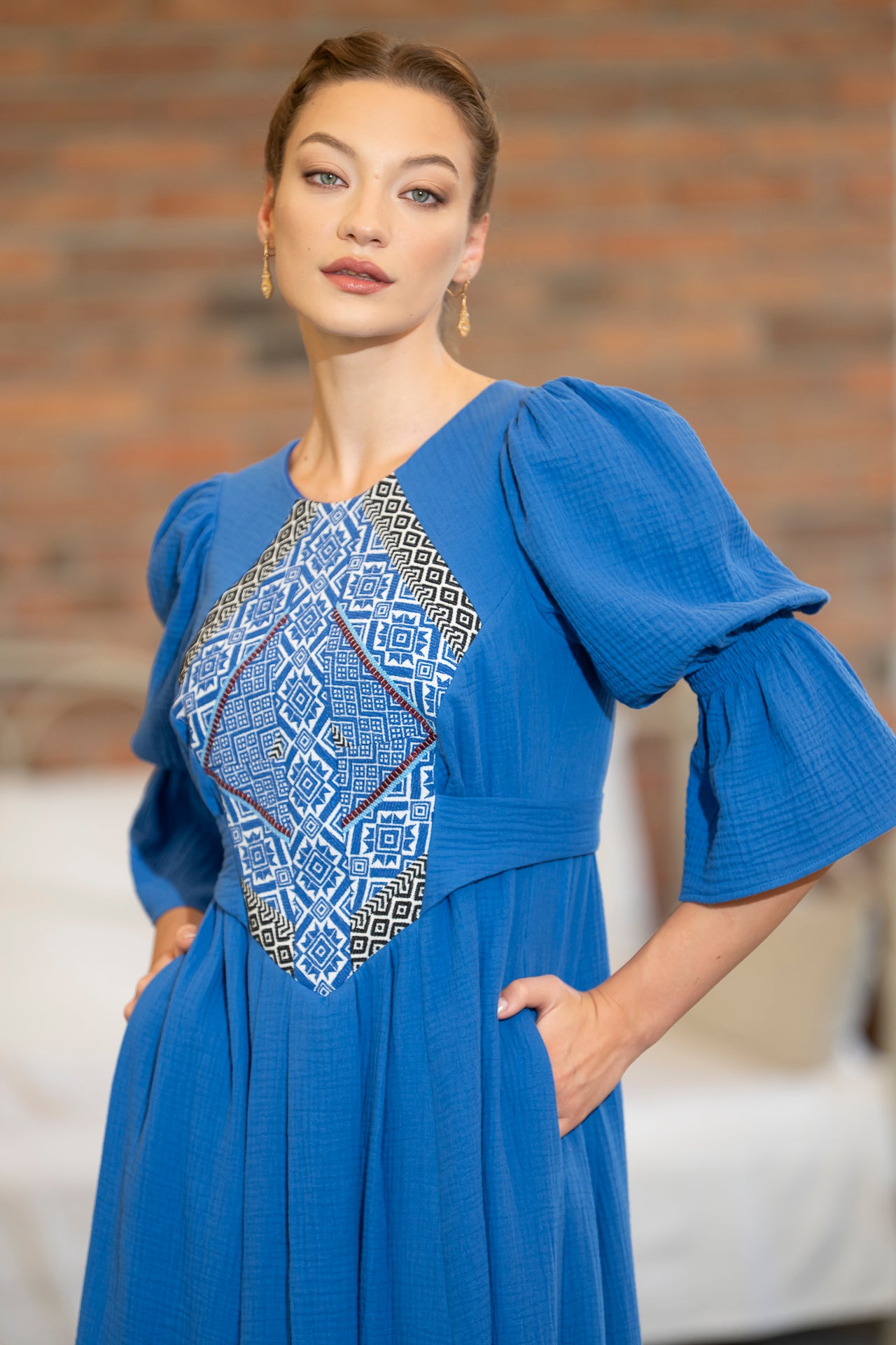 Rochia etno este confecționată din muselină albastru regal de bumbac, are căptușeală subțire, buzunare laterale, și este reglabilă cu cordon în talie.