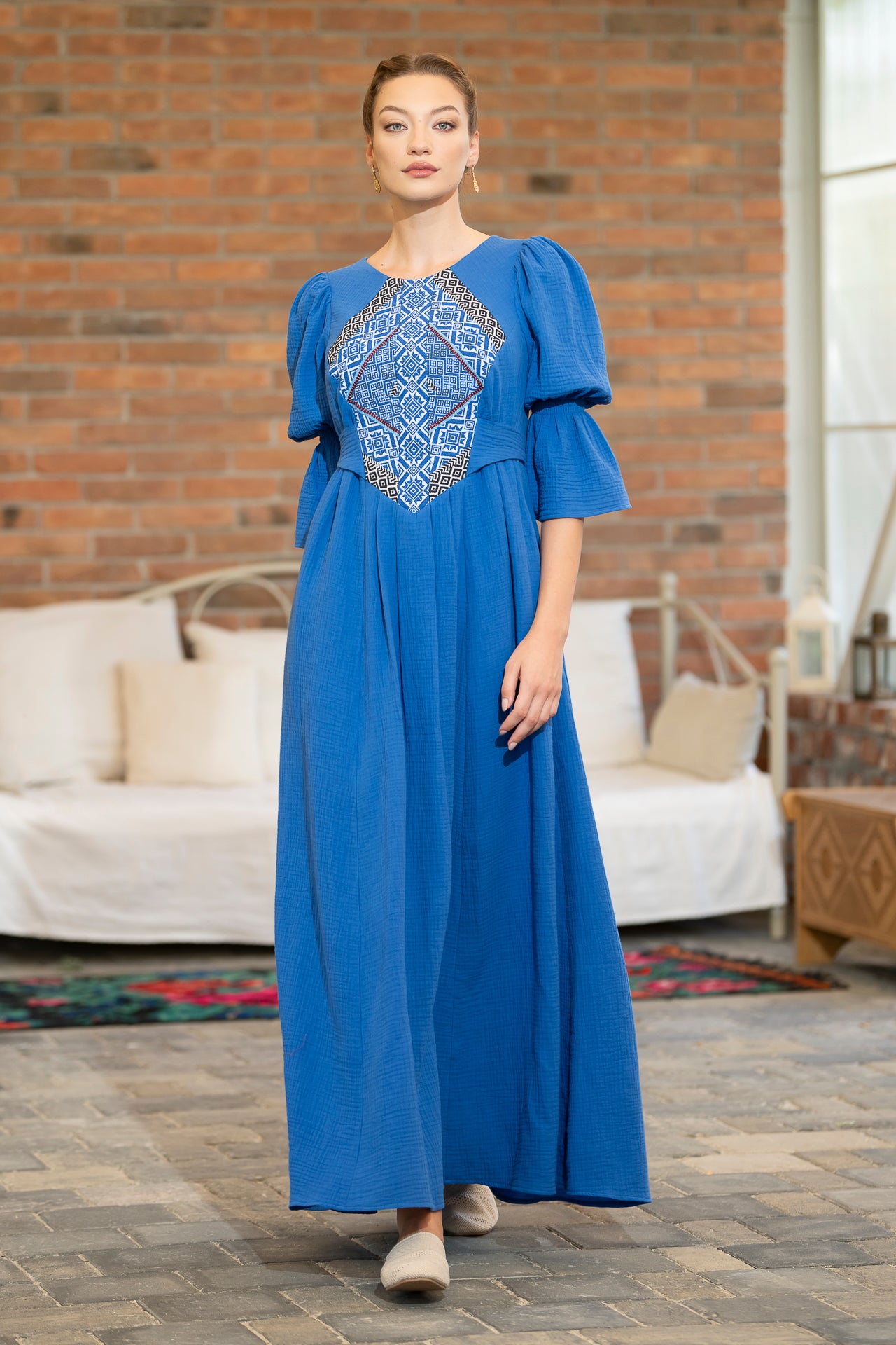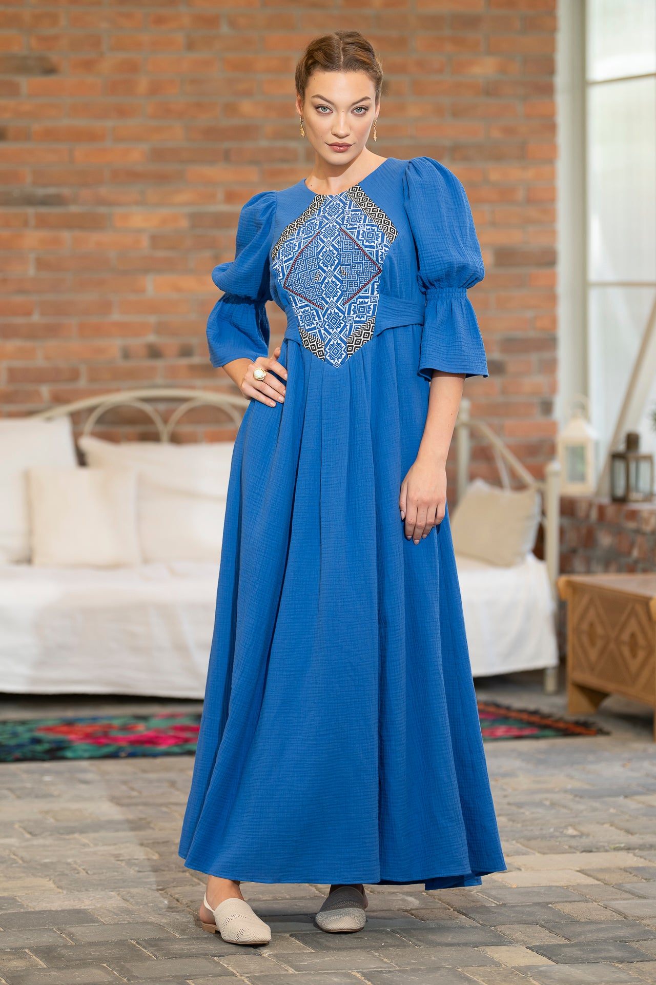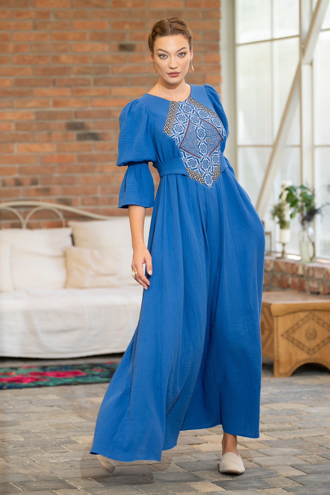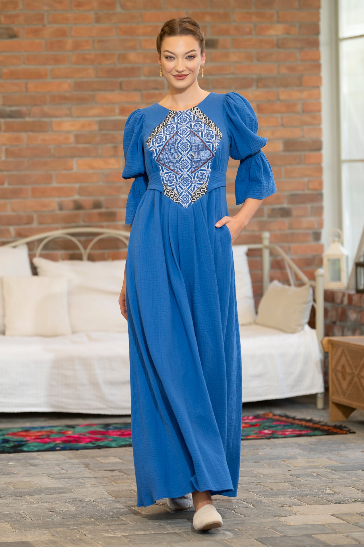Rochia etno este confecționată din muselină albastru regal de bumbac, are căptușeală subțire, buzunare laterale, și este reglabilă cu cordon în talie.