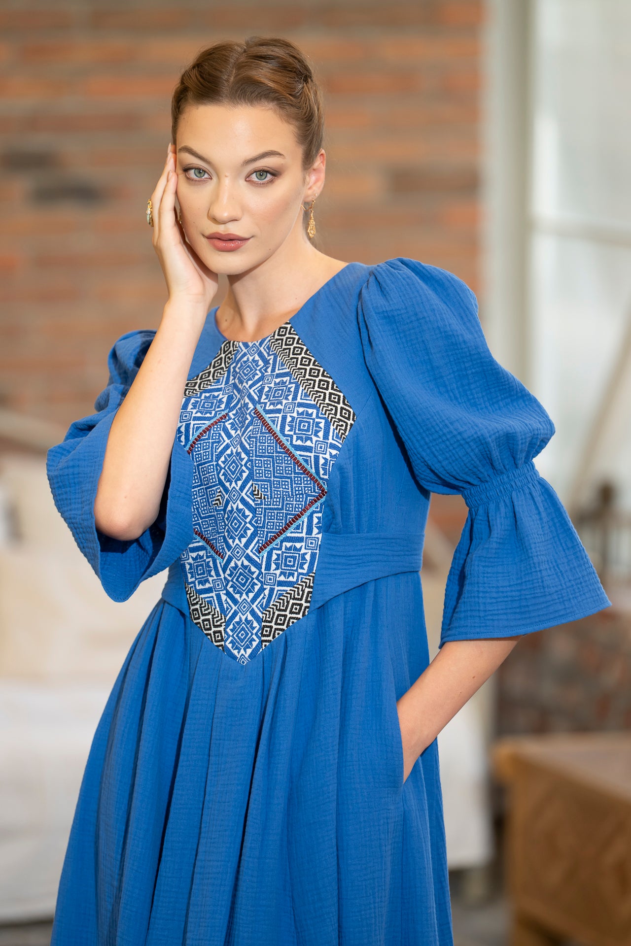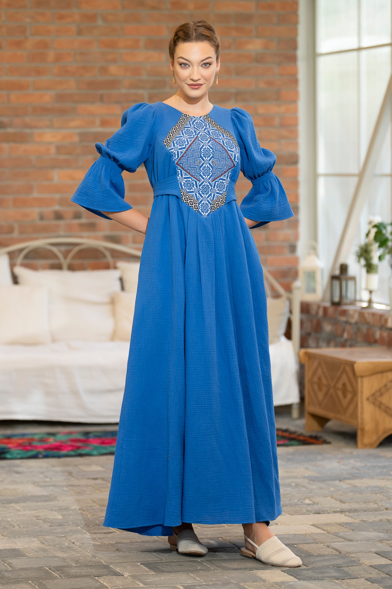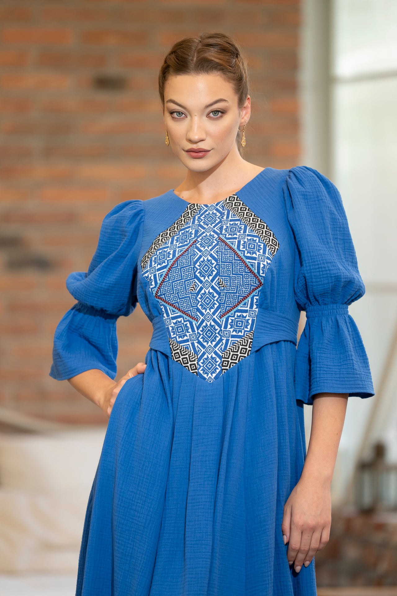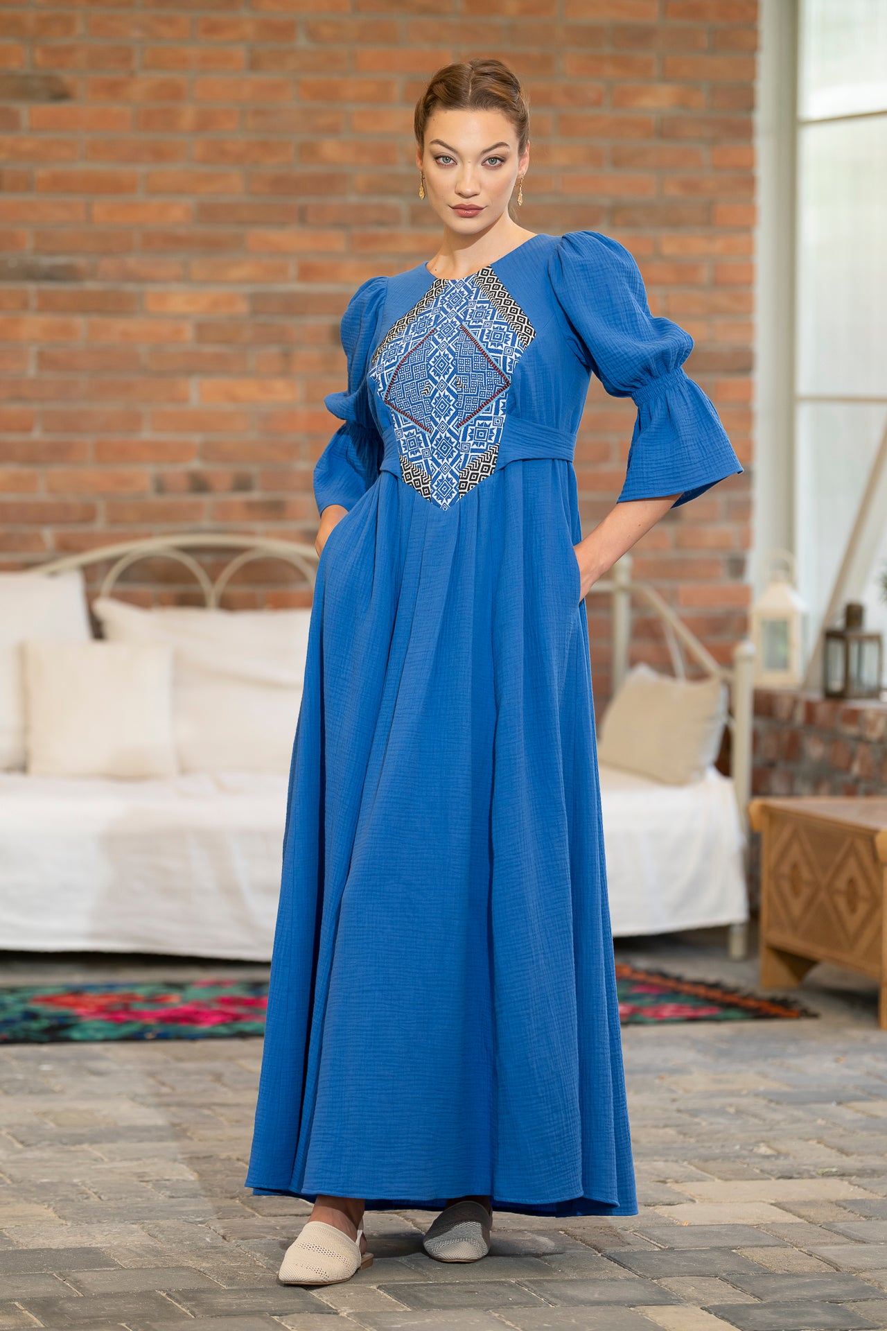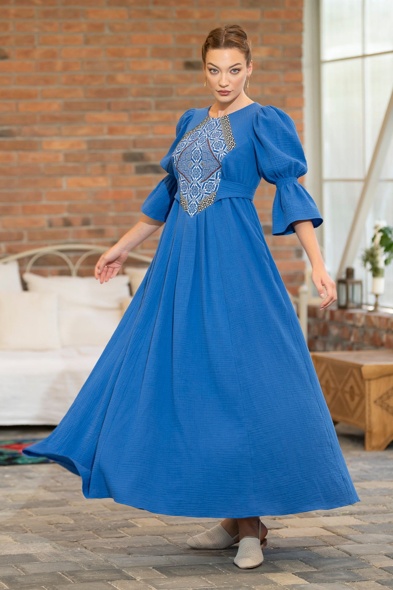 Rochia etno este confecționată din muselină albastru regal de bumbac, are căptușeală subțire, buzunare laterale, și este reglabilă cu cordon în talie.