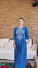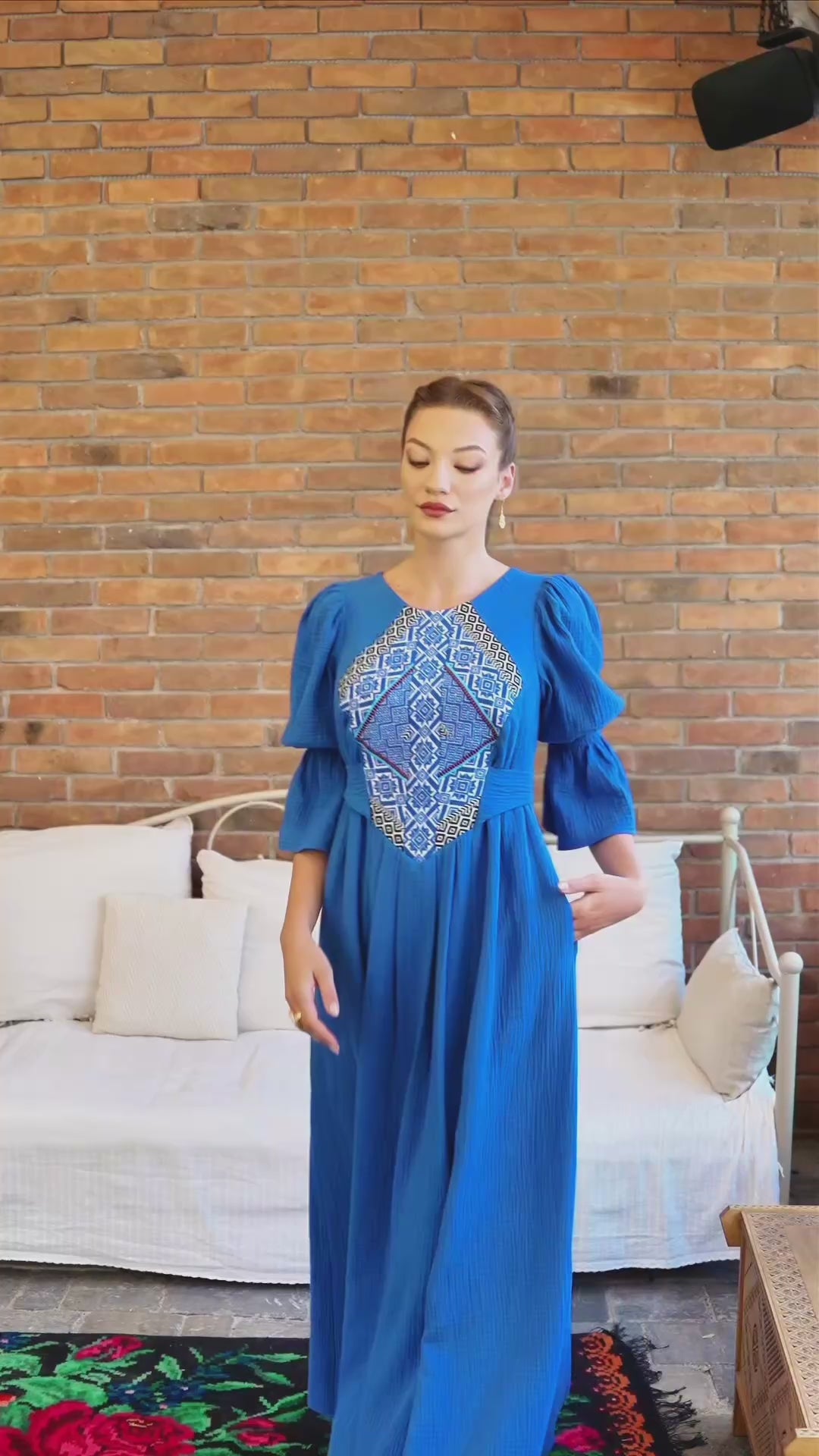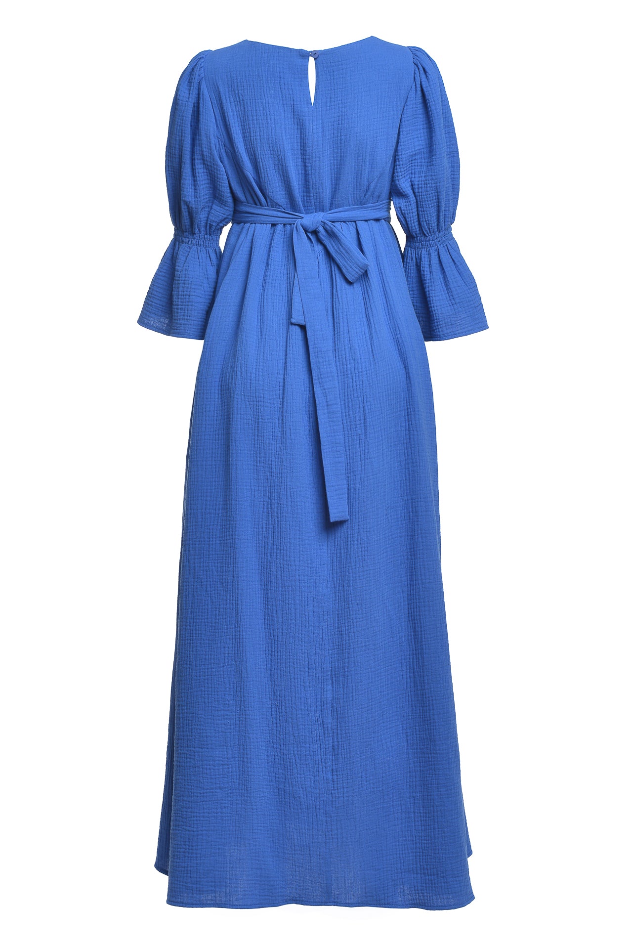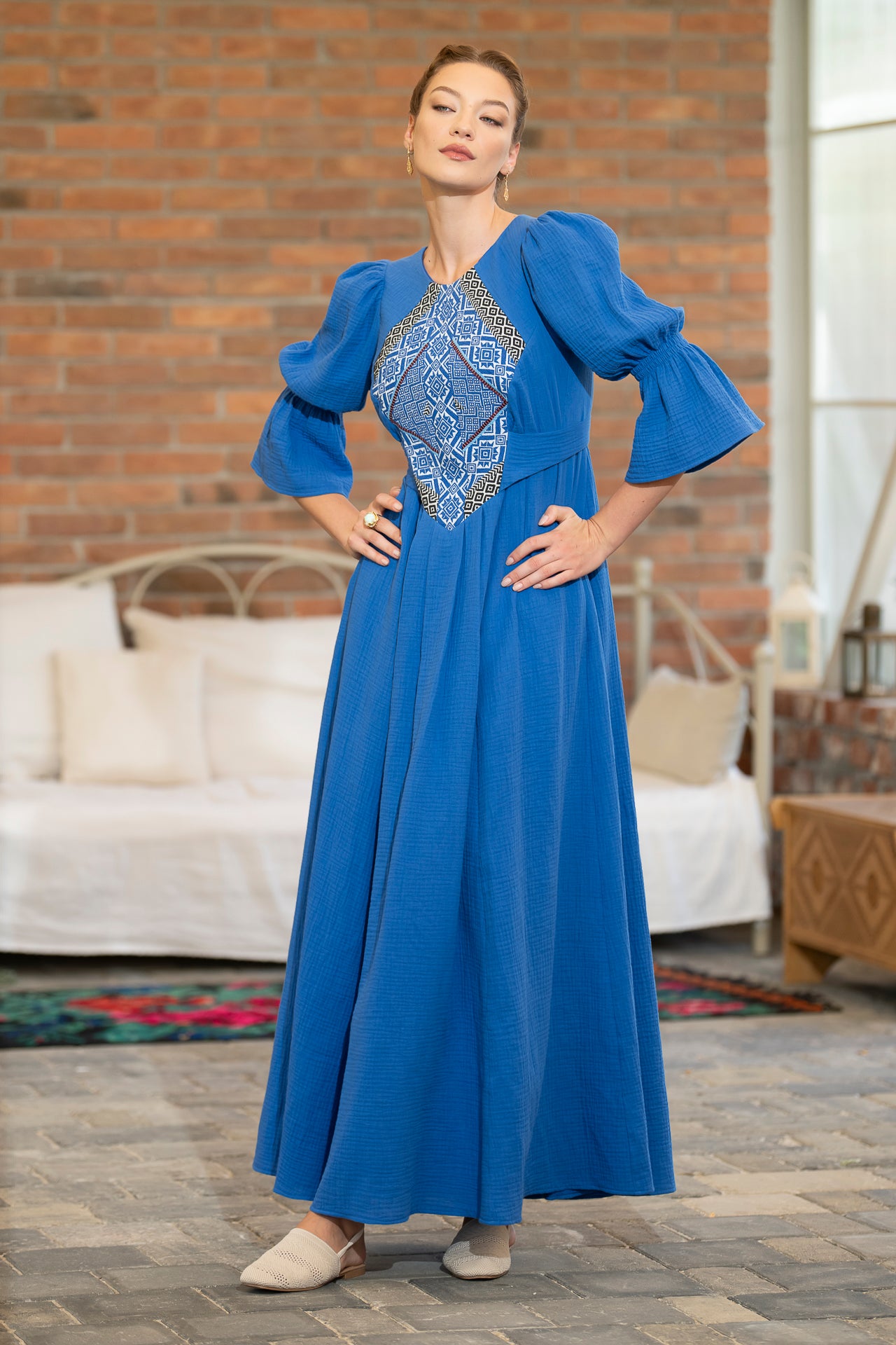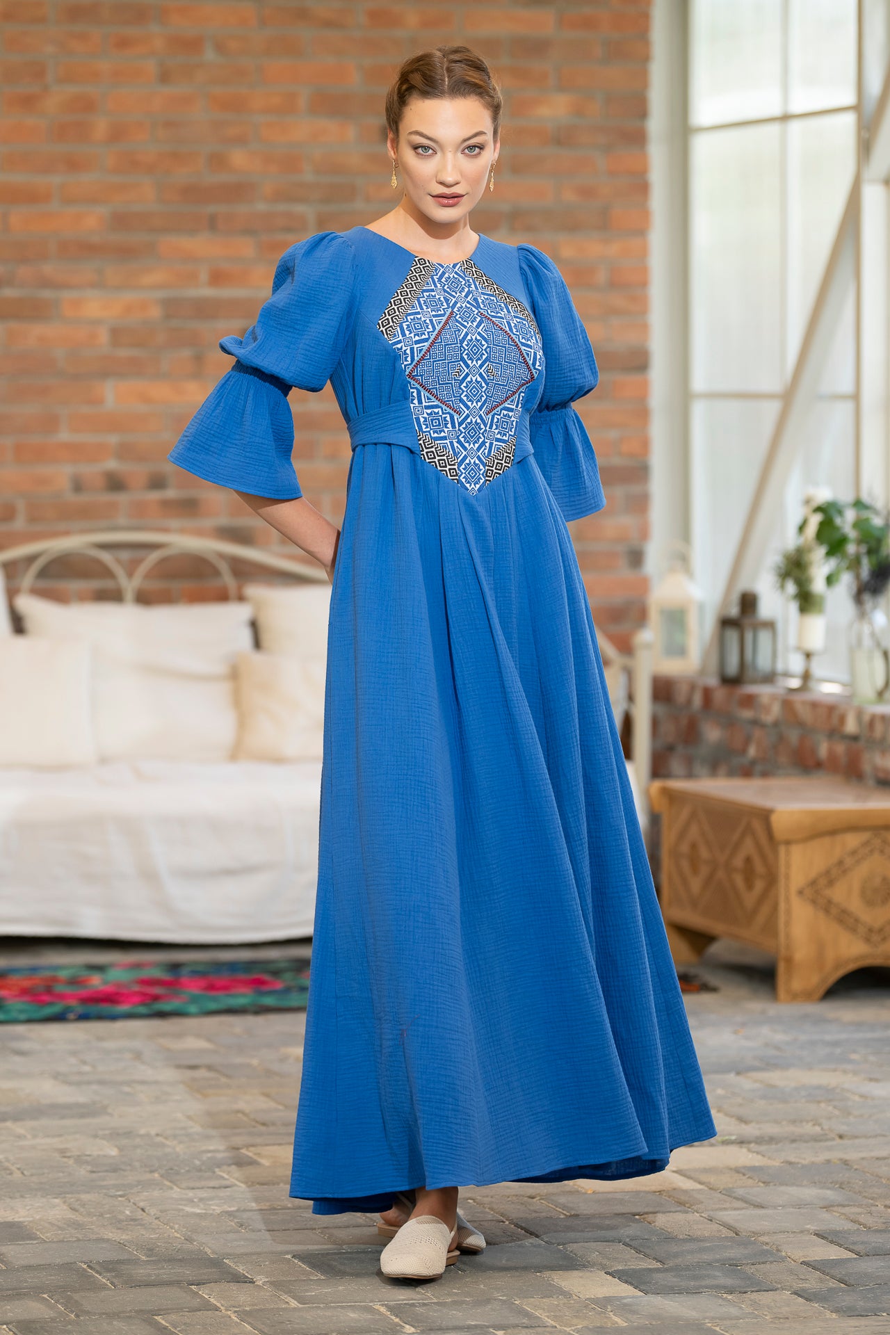 Rochia etno este confecționată din muselină albastru regal de bumbac, are căptușeală subțire, buzunare laterale, și este reglabilă cu cordon în talie.