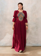 Rochia etno din muselină burgundi și corset românesc din jacquard țesut