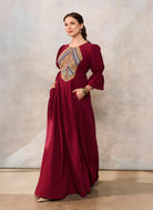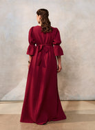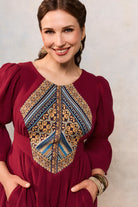 Rochia etno este confecționată din muselină burgundi de bumbac, are căptușeală subțire, buzunare laterale, și este reglabilă cu cordon în talie.