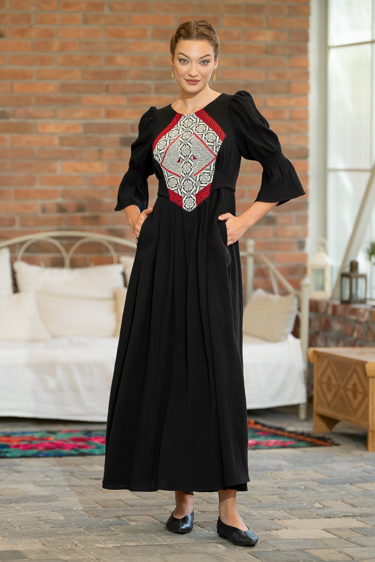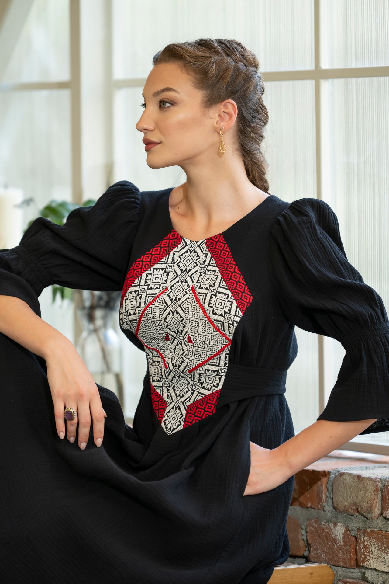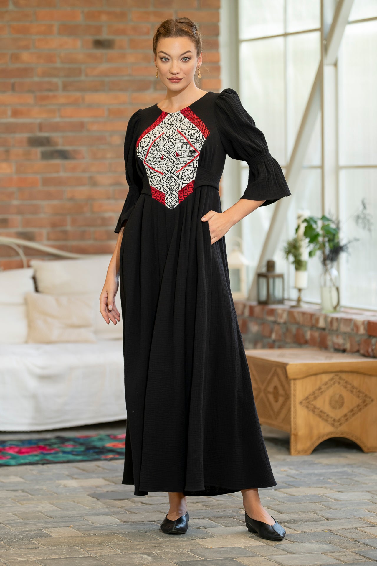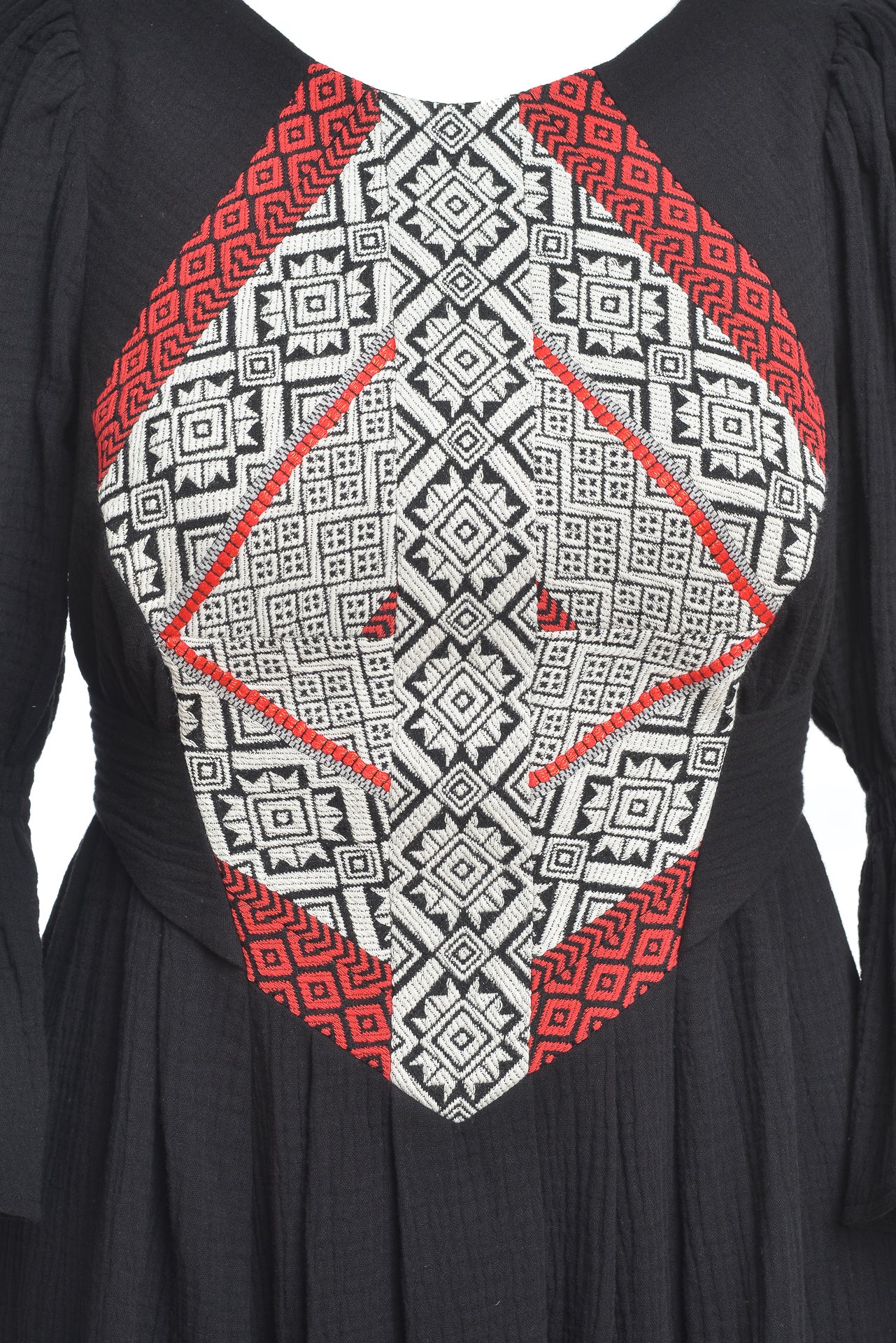Rochia etno este confecționată din muselină neagră de bumbac, are căptușeală subțire, buzunare laterale, și este reglabilă cu cordon în talie.