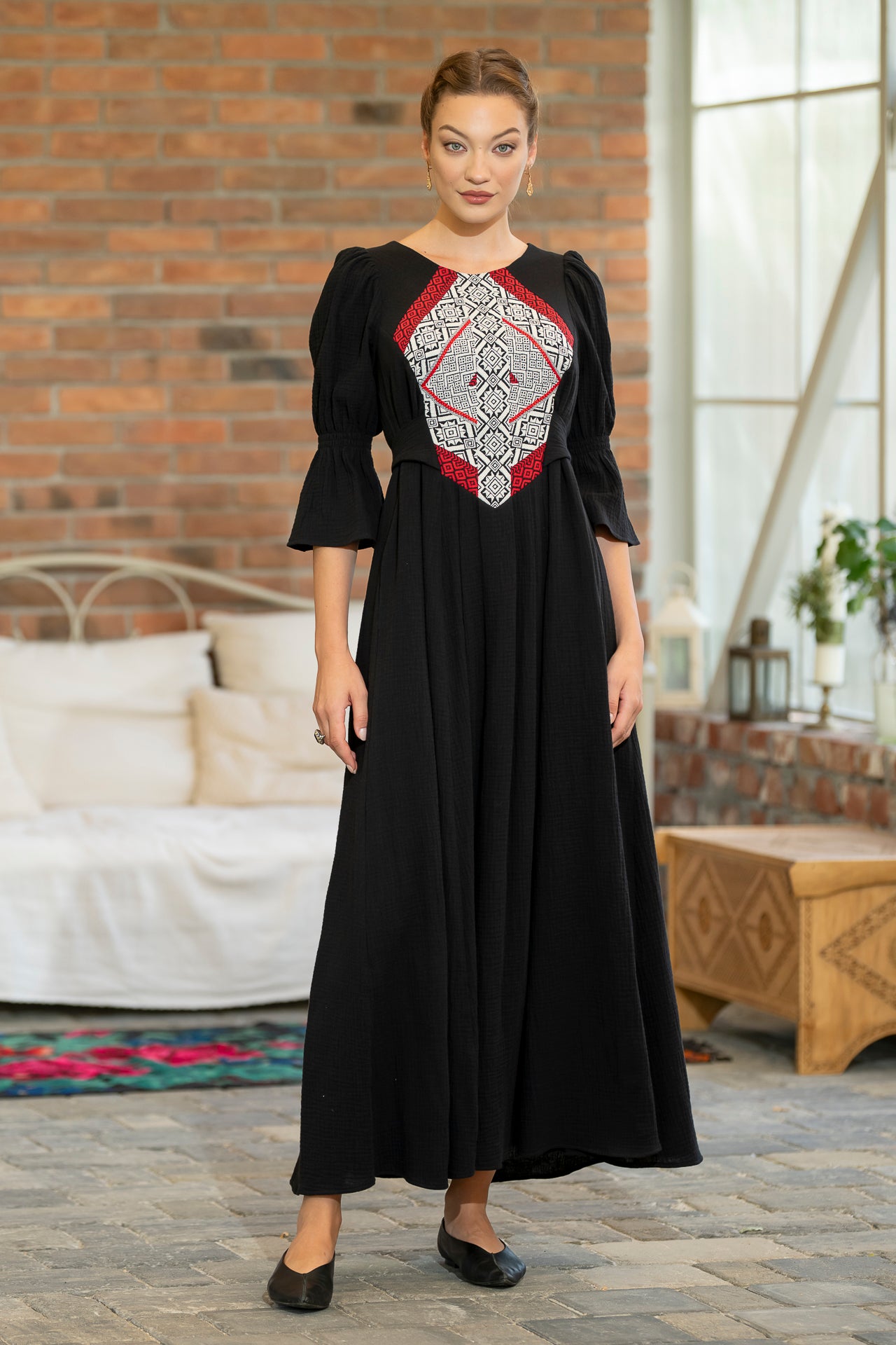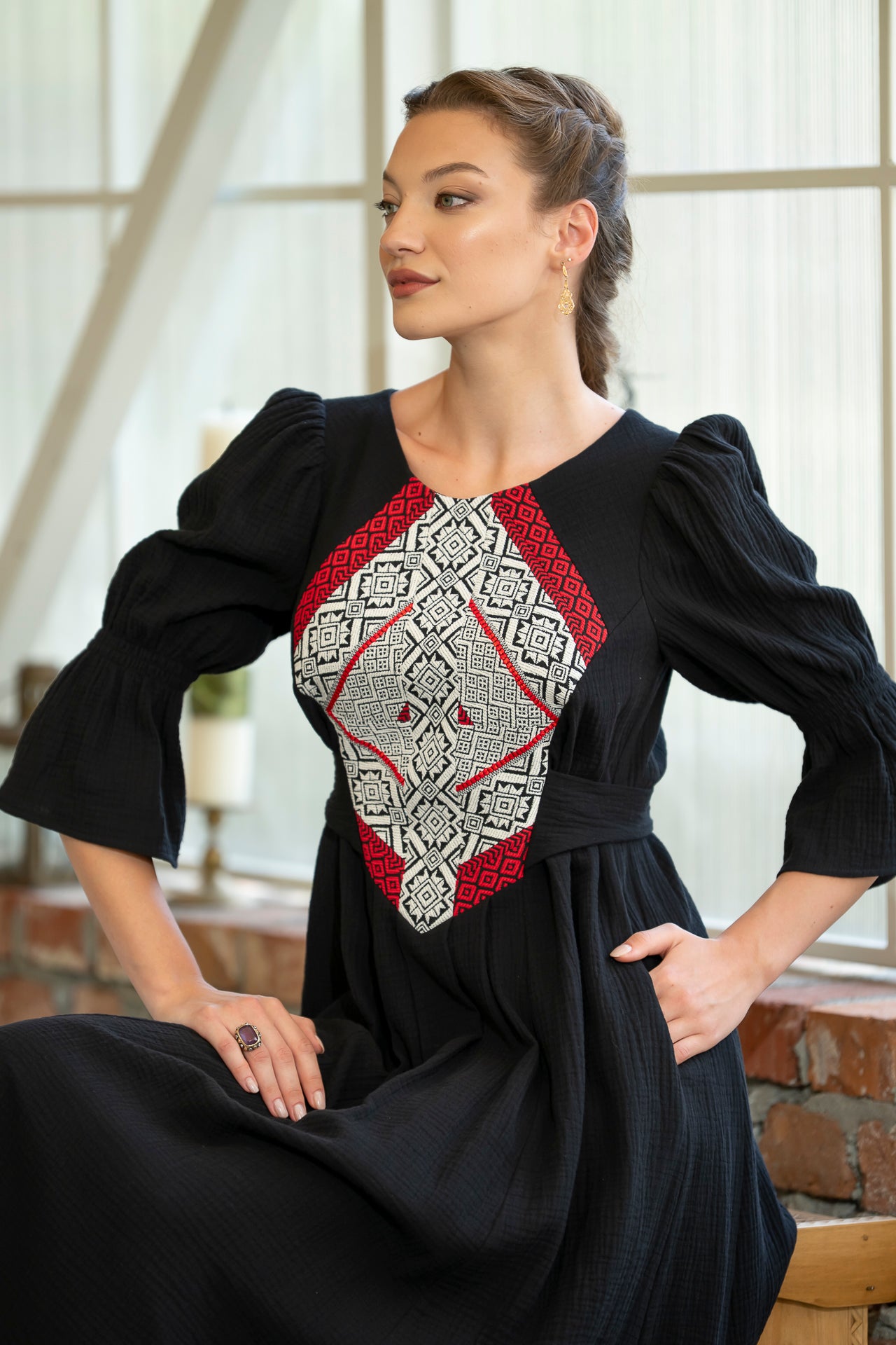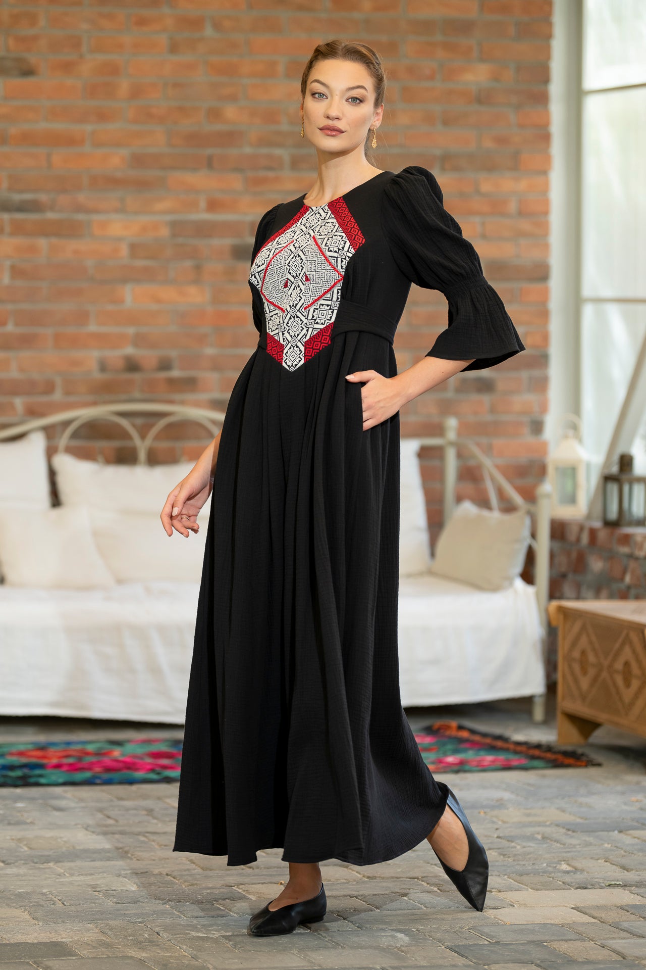 Rochia etno este confecționată din muselină neagră de bumbac, are căptușeală subțire, buzunare laterale, și este reglabilă cu cordon în talie.