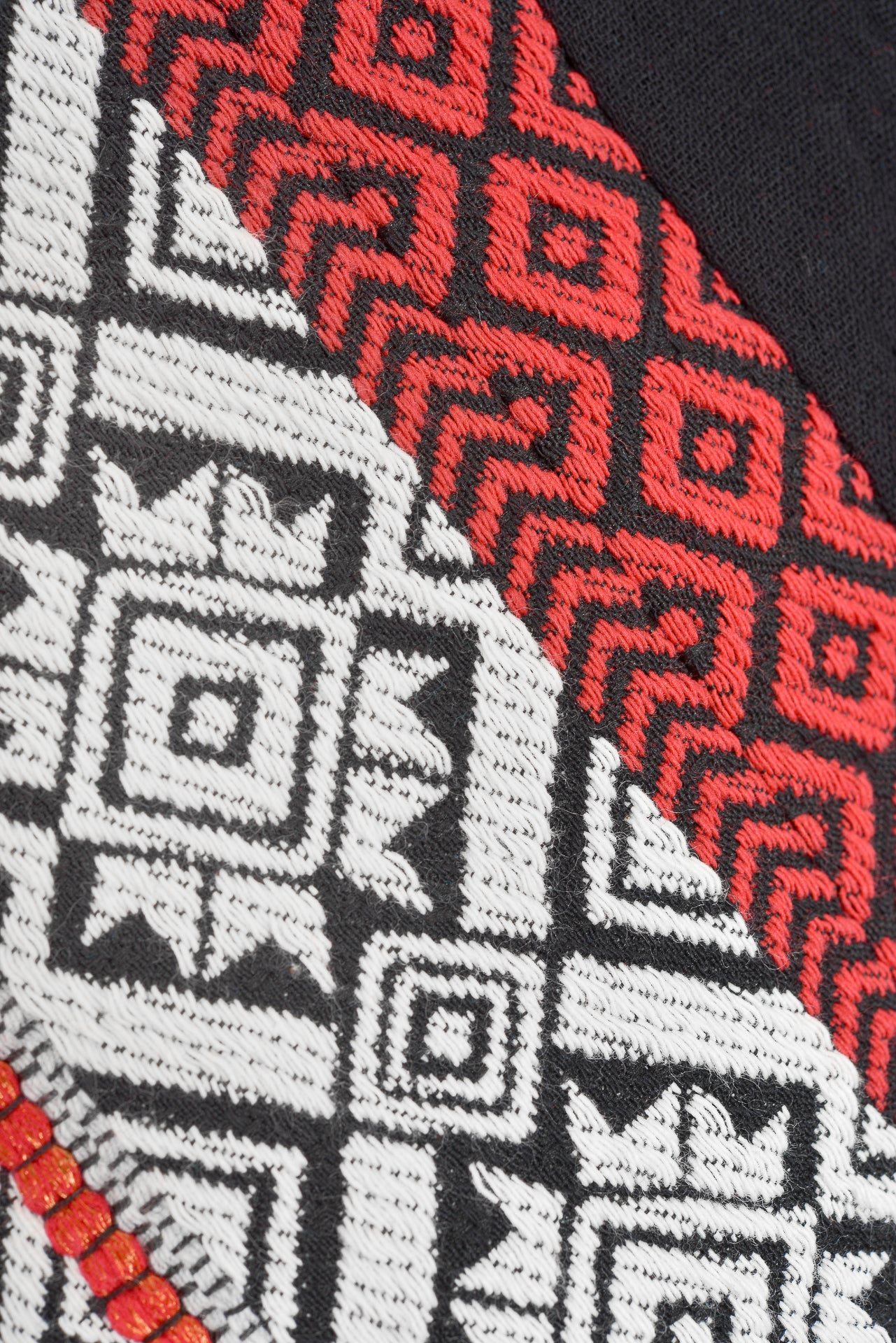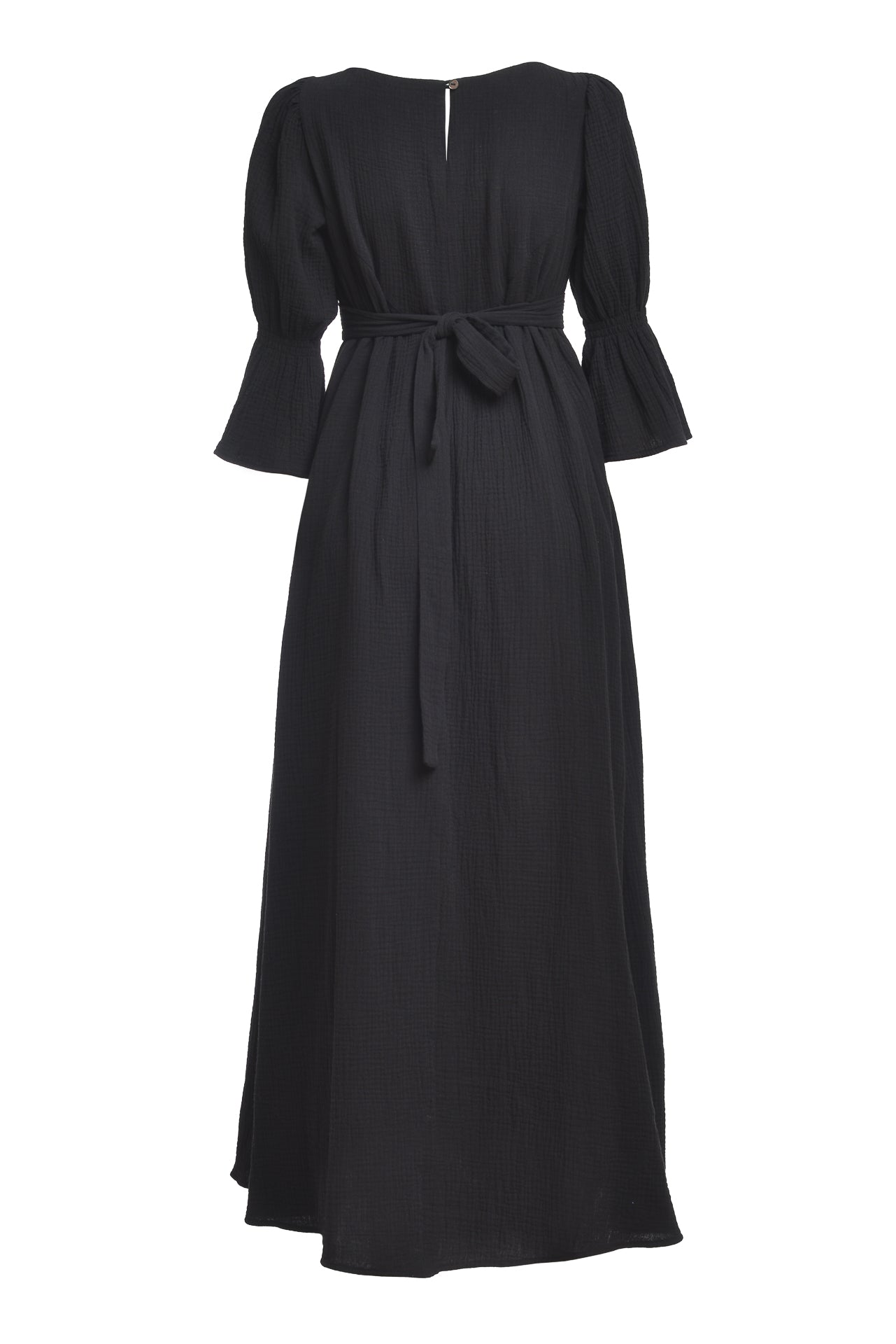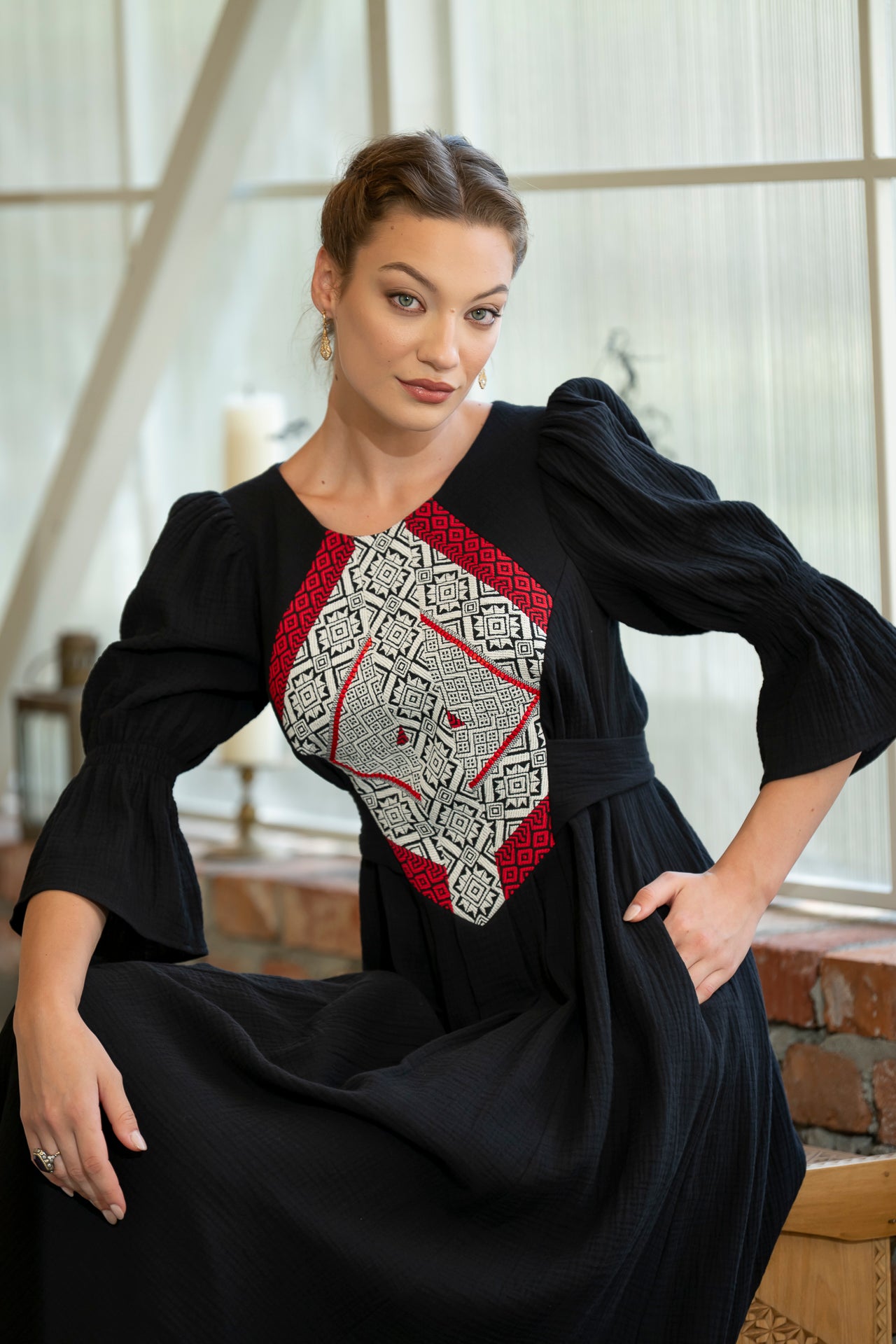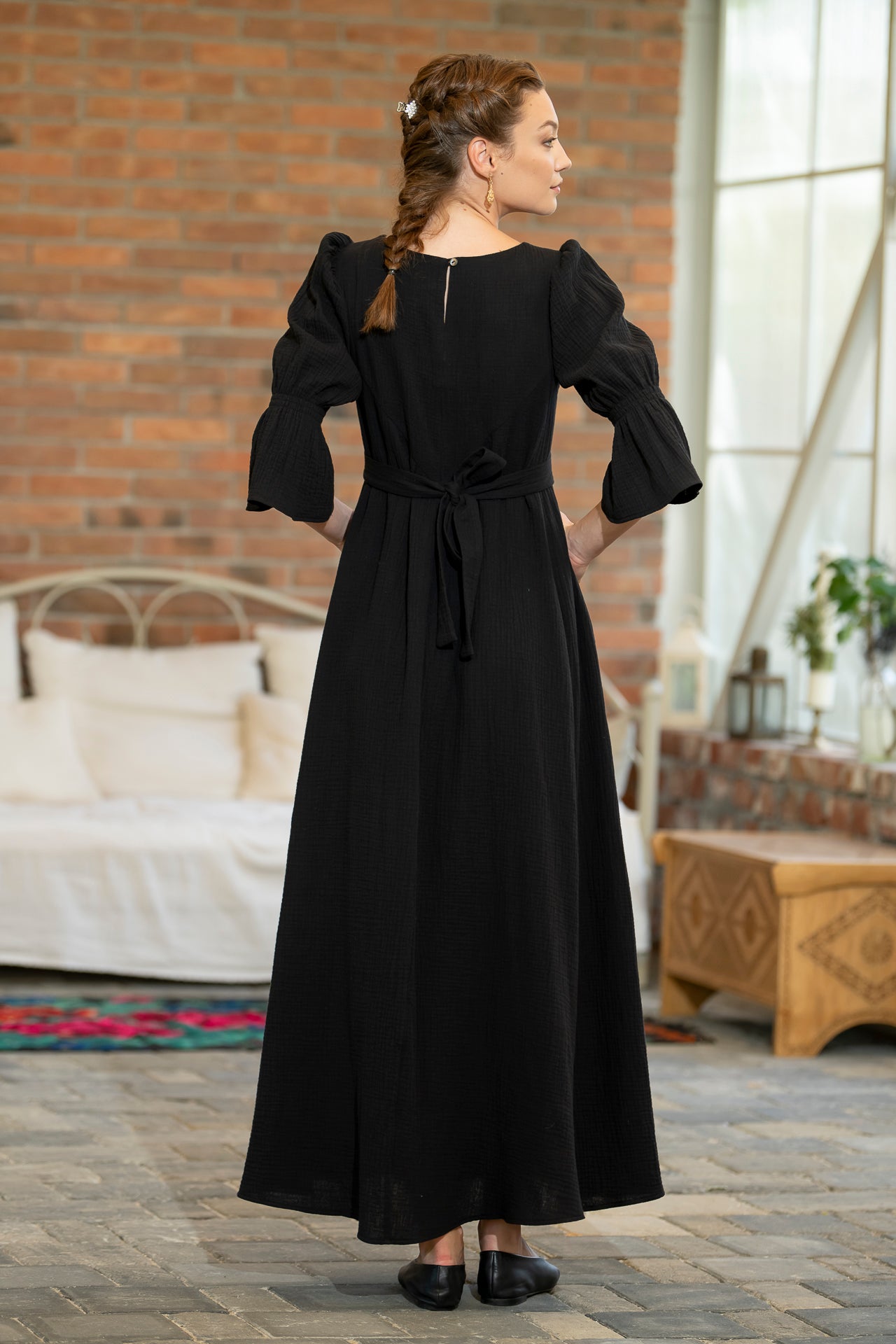 Rochia etno este confecționată din muselină neagră de bumbac, are căptușeală subțire, buzunare laterale, și este reglabilă cu cordon în talie.